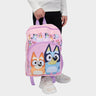 This Bluey toddler back pack for girls is a charming accessory for young fans, featuring a design with Bluey and Bingo on the front compartment and a repeating pattern across the rest of the bag. The adjustable pink straps ensure a comfortable fit, while the mesh side pocket is ideal for storing a water bottle. Perfect for carrying toys or school supplies, this Bluey bag complements any Bluey outfit and makes a perfect choice for back to school season. Officially licensed Bluey merchandise, it's both practical and fun for your little one.