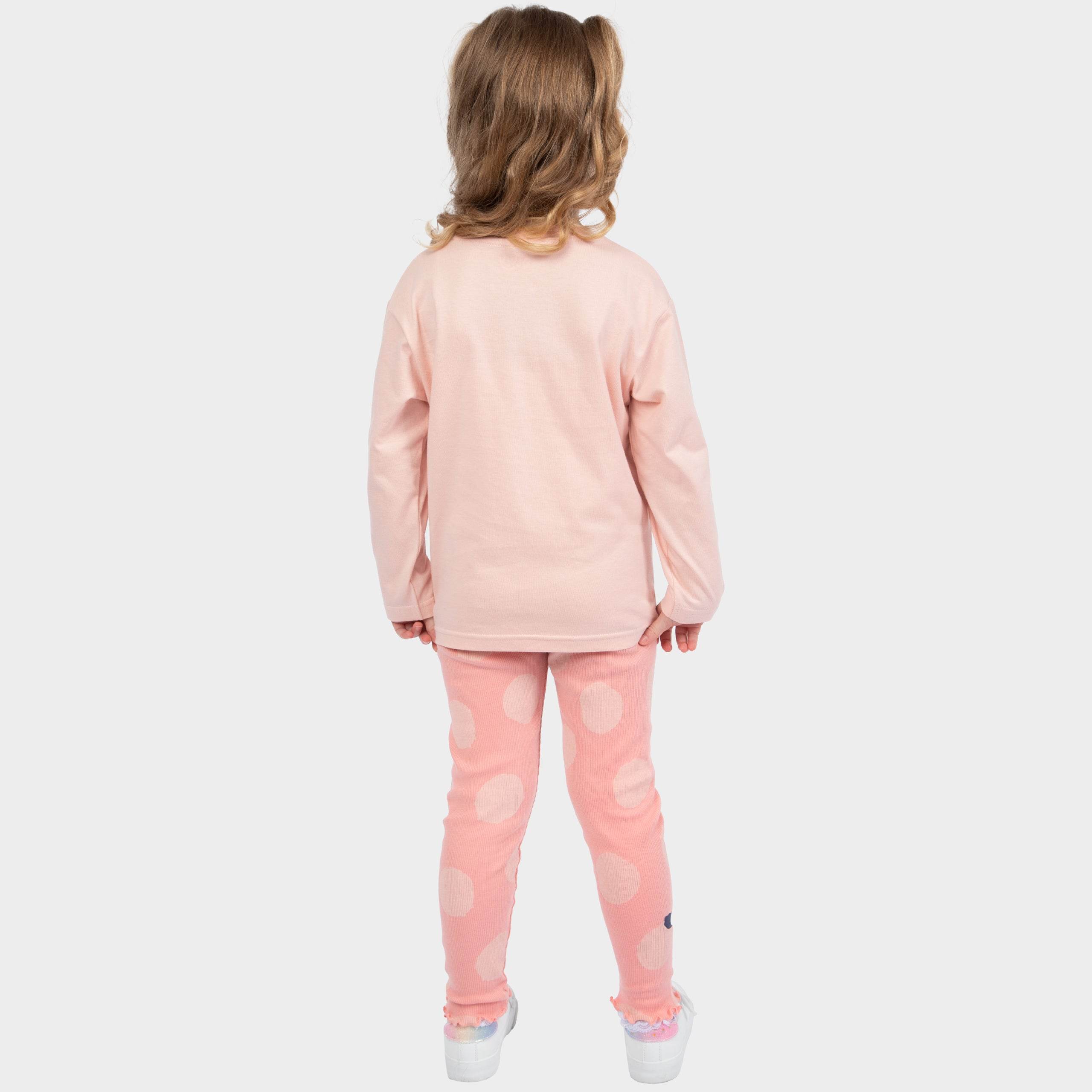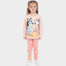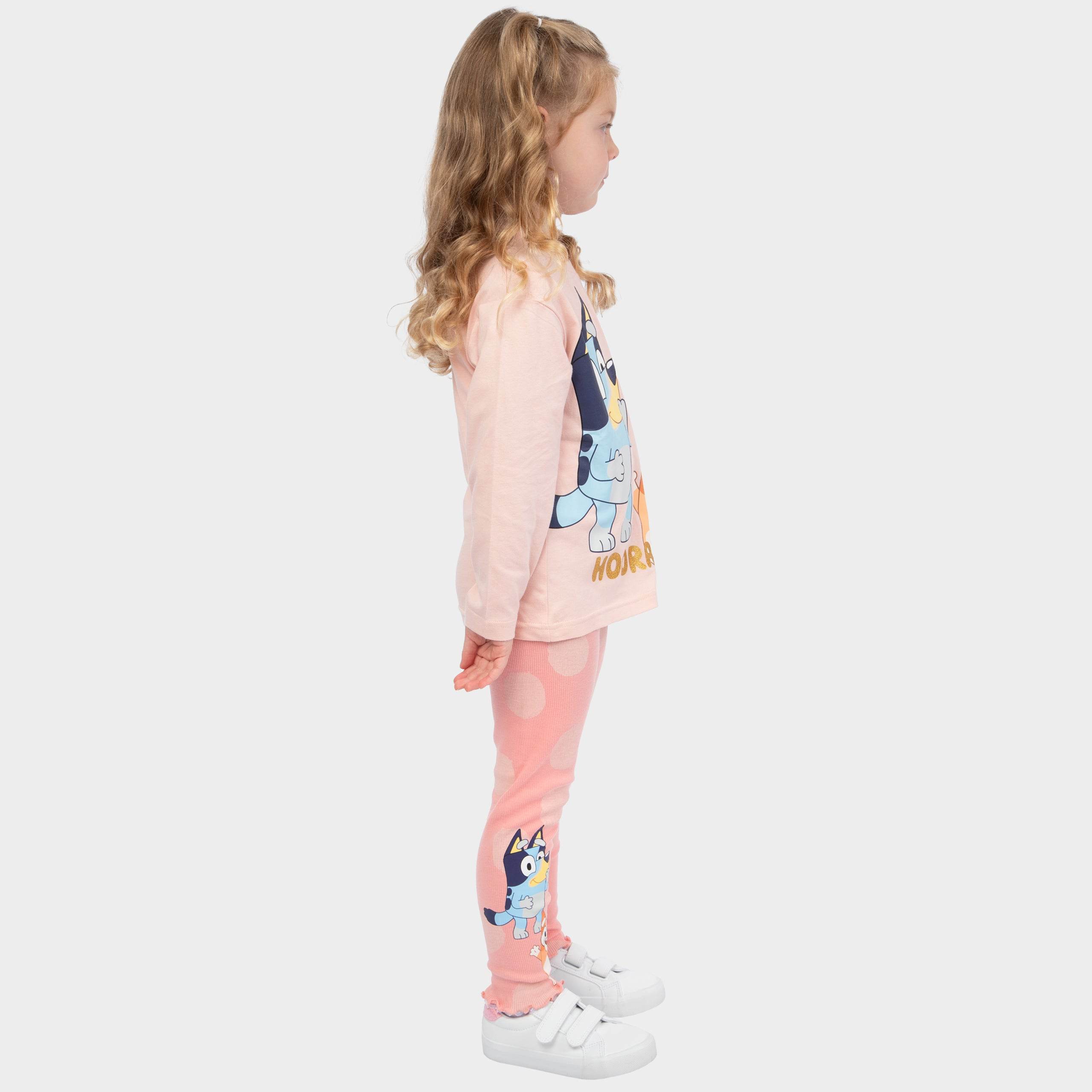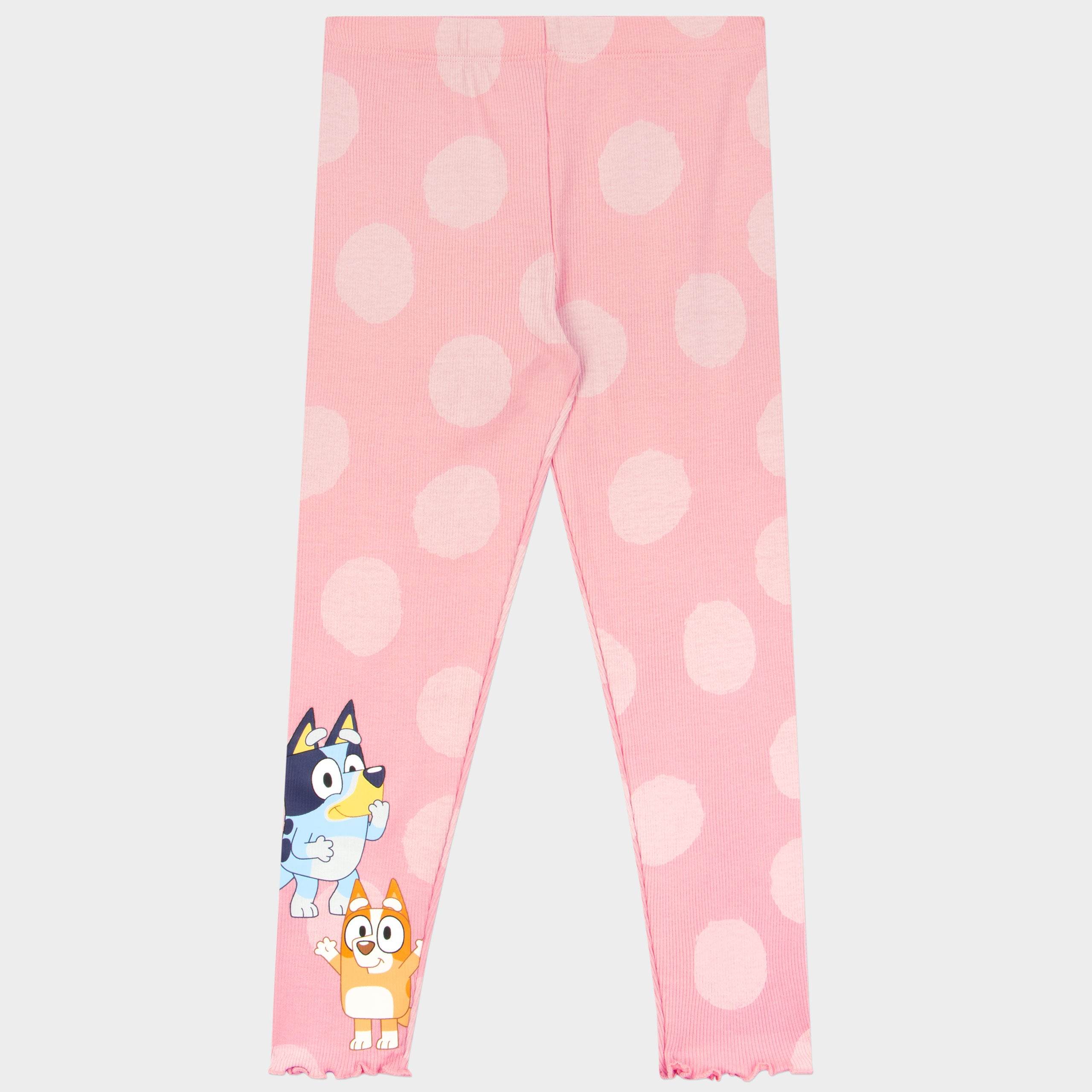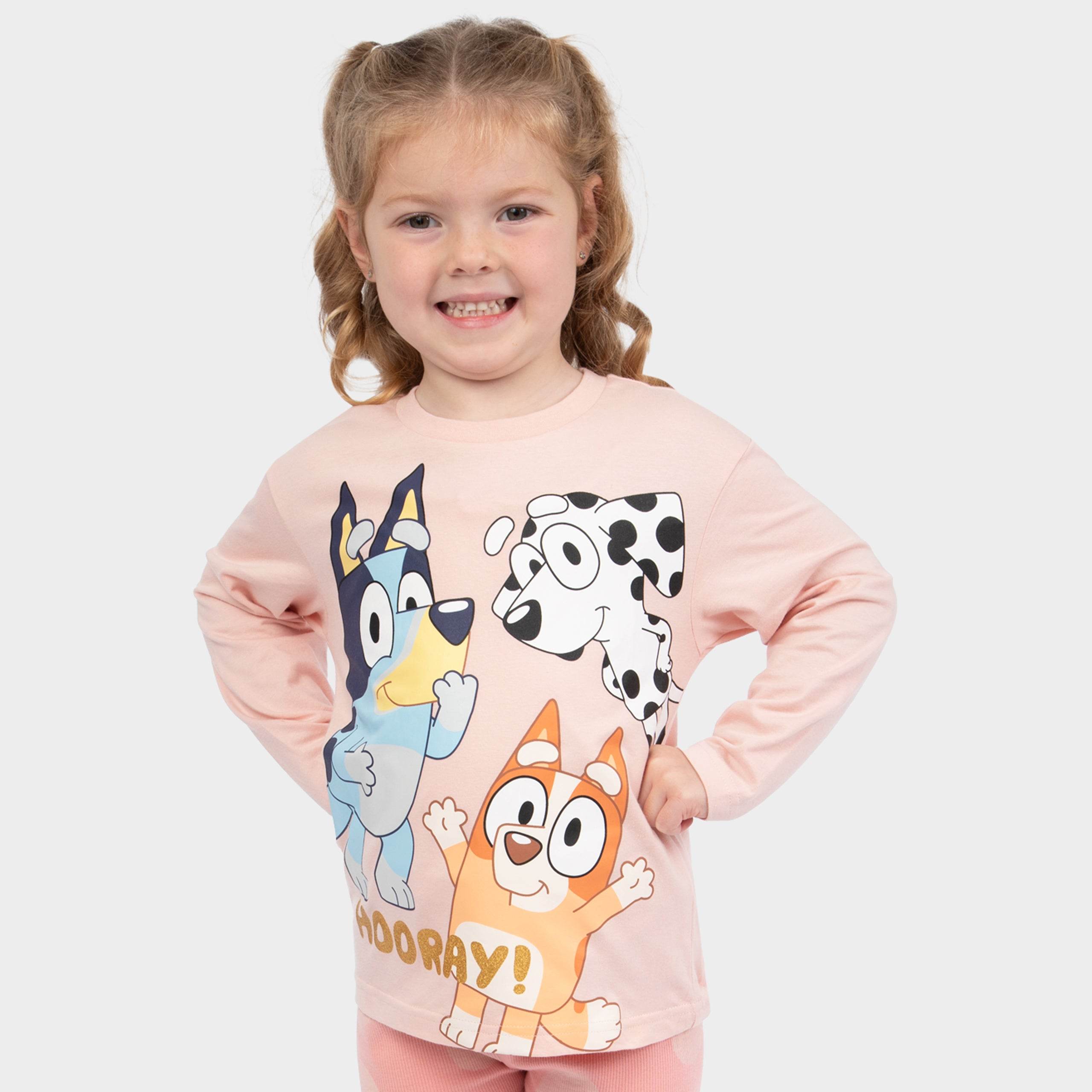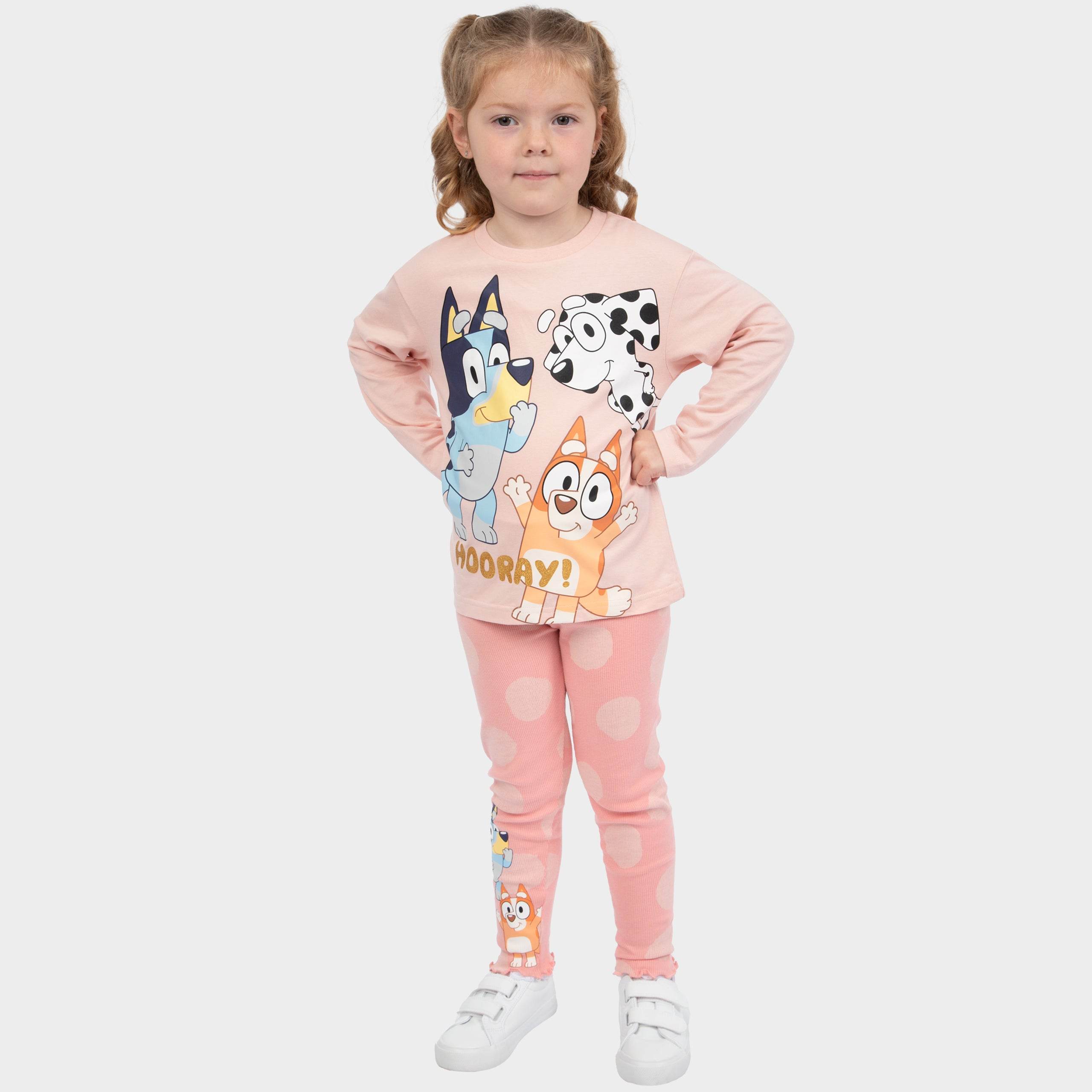 Join Bluey and her friends for a day full of fun and laughter with this amazing girls long sleeve t shirt and leggings set! Featuring Bluey, Bingo, and Chloe on a light pink t-shirt with the joyful text "HOORAY!", this adorable Bluey outfit is perfect for playtime, adventures, or cosy days at home. The matching pink girls leggings covered in cute white polka dots, also include a charming image of Bluey and Bingo on the ankle; adding an extra touch of fun to these charming Bluey clothes.