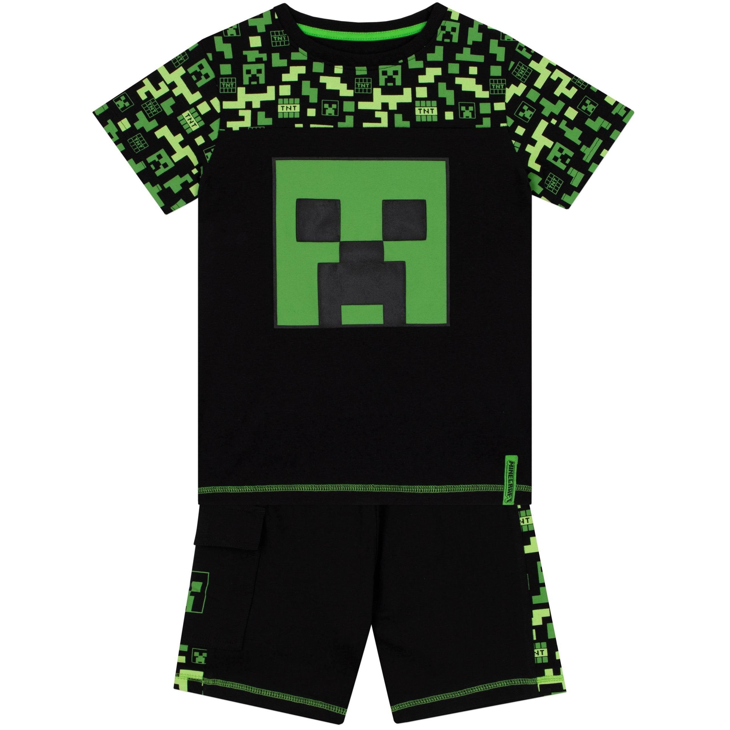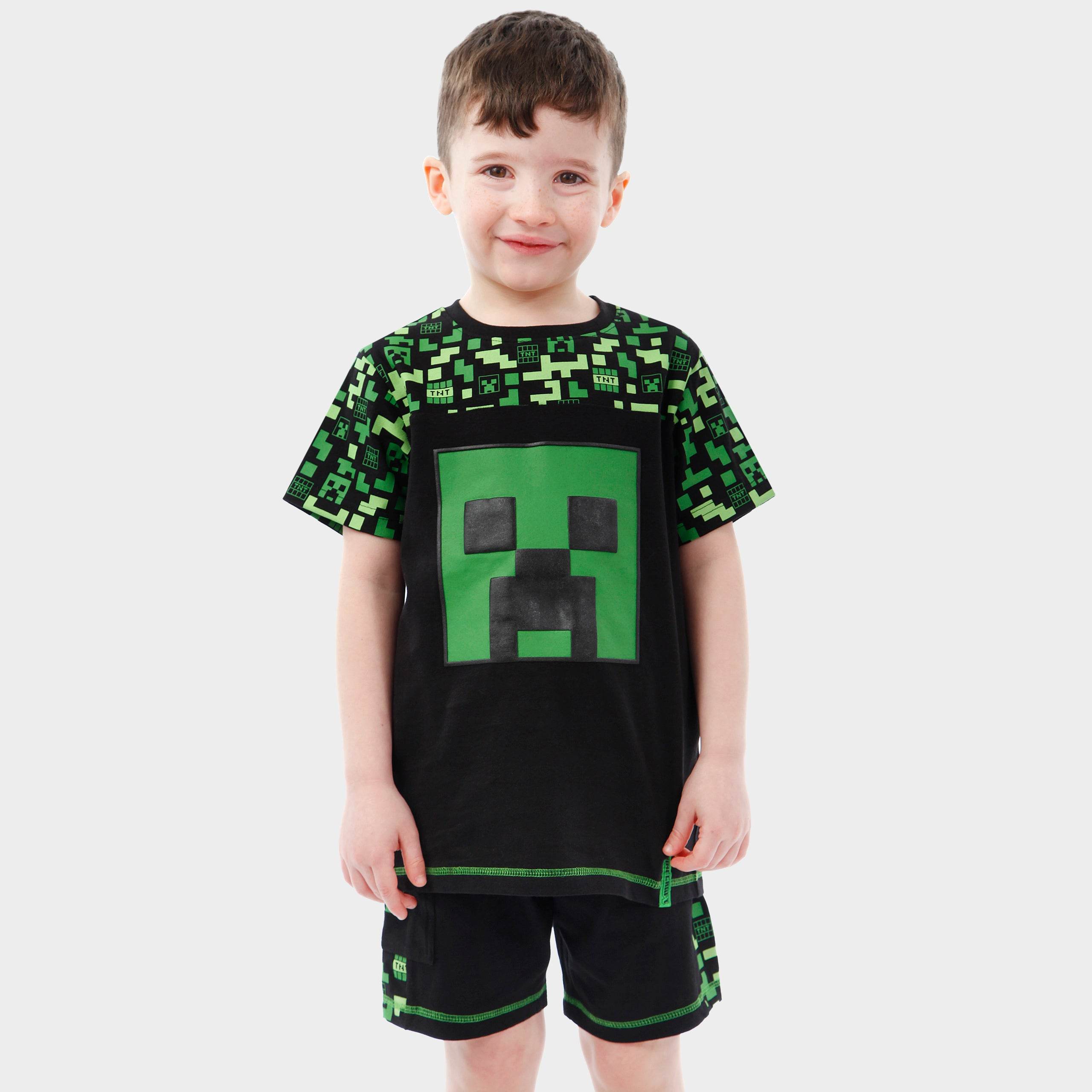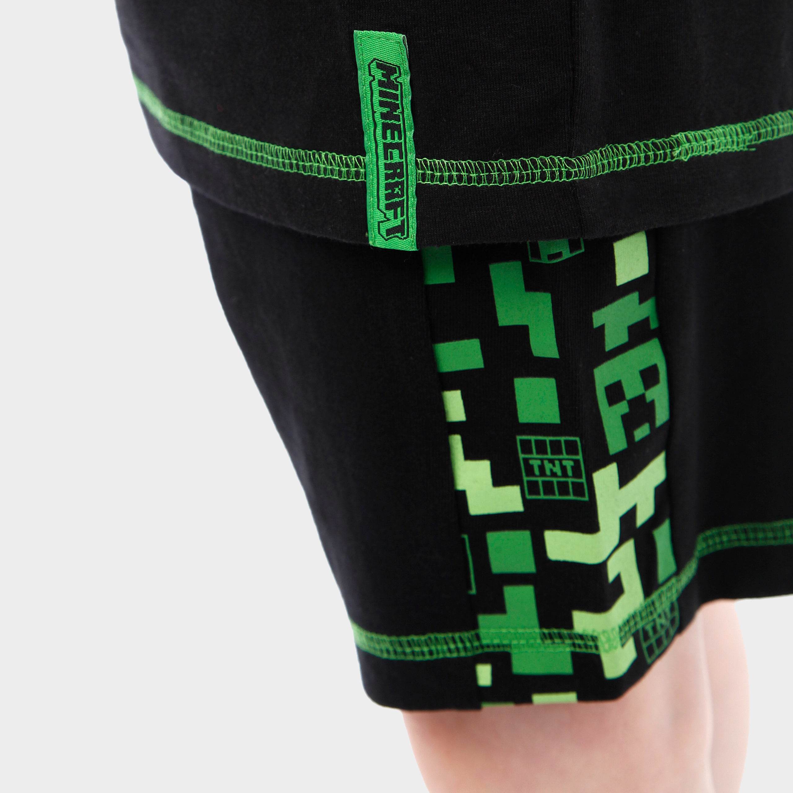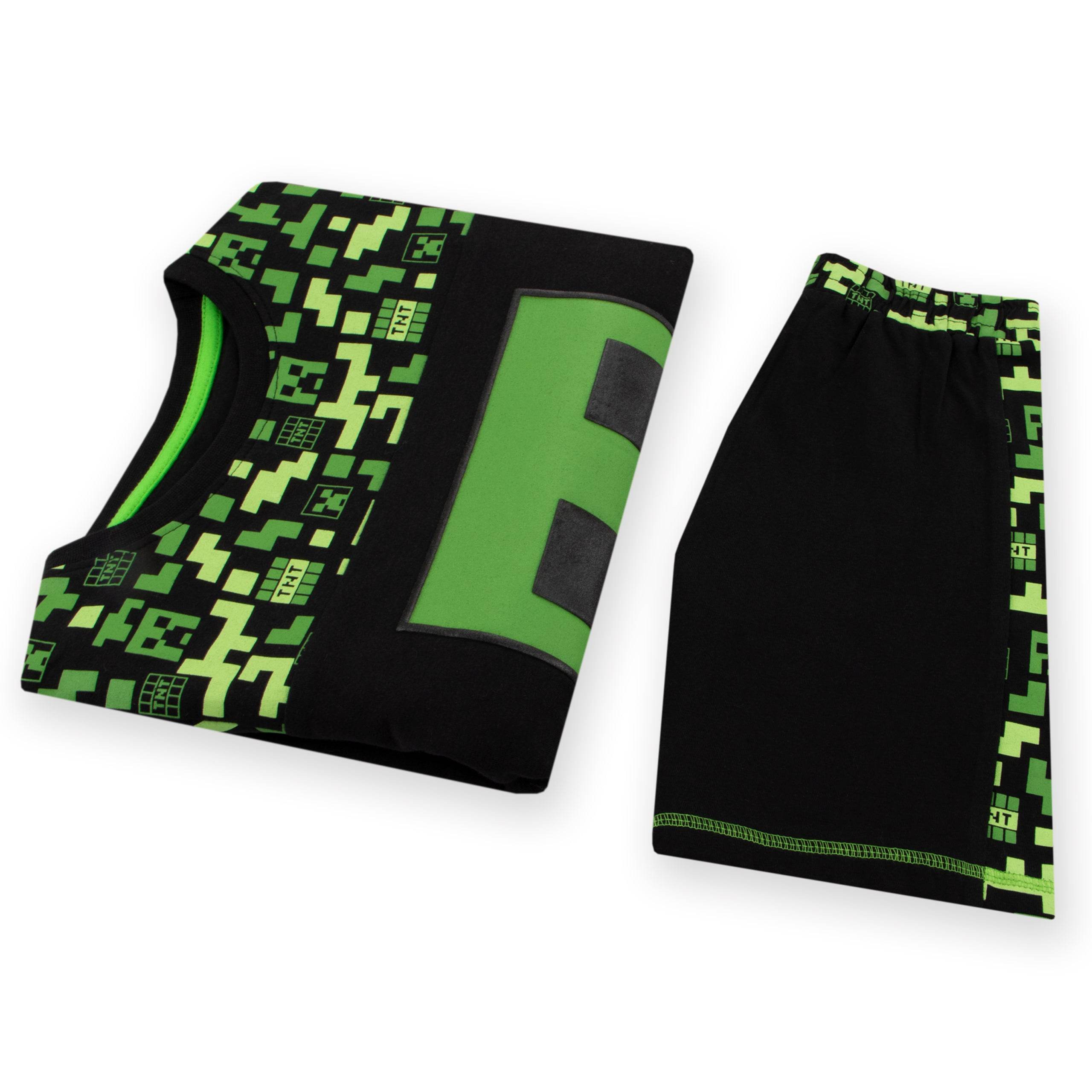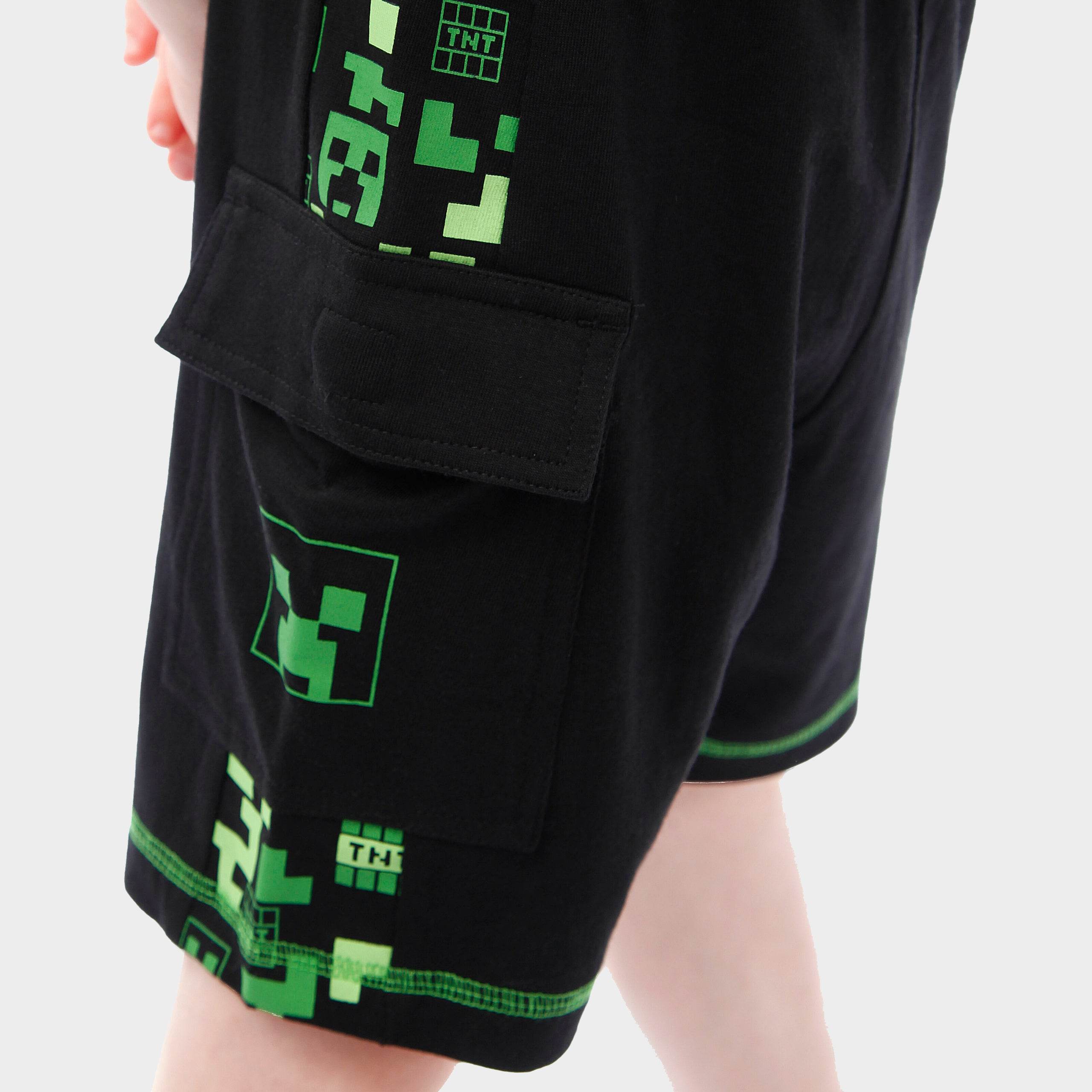This boys' shorts and t-shirt set is a must-have for Minecraft enthusiasts. The black short sleeve t-shirt showcases a bold green Creeper face on the front, with a playful all-over print of Creeper heads, TNT boxes, and pixels around the neckline and sleeves. The matching shorts continue the fun pattern along the waistband and sides, with an additional Creeper face pocket for extra flair. Comfortable and stylish, this set is perfect for adventures both indoors and out.