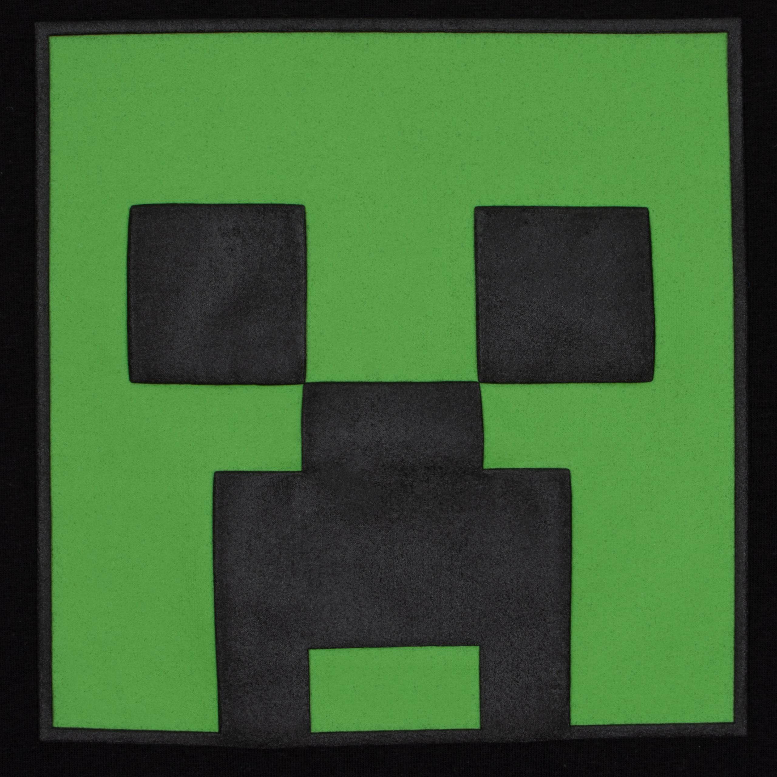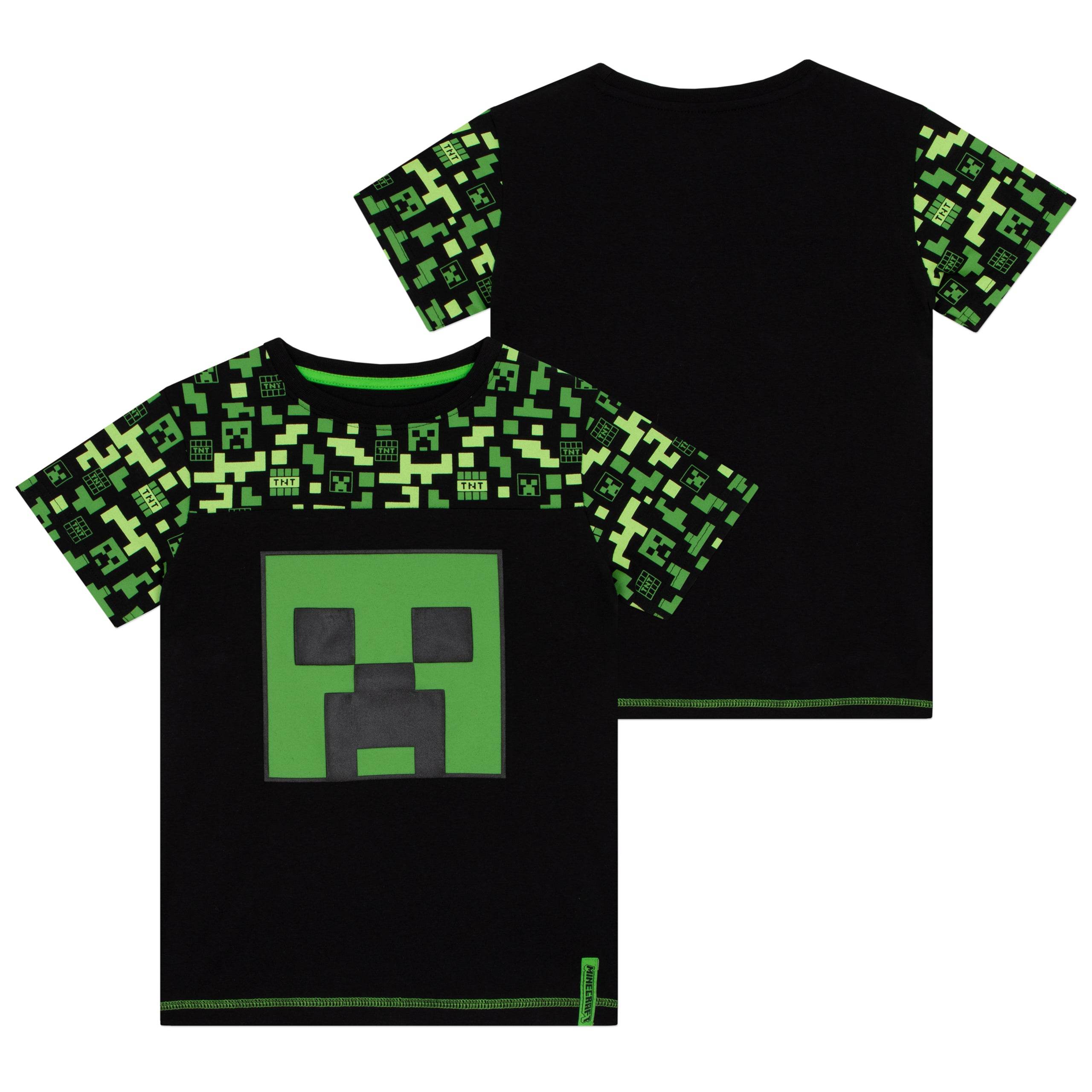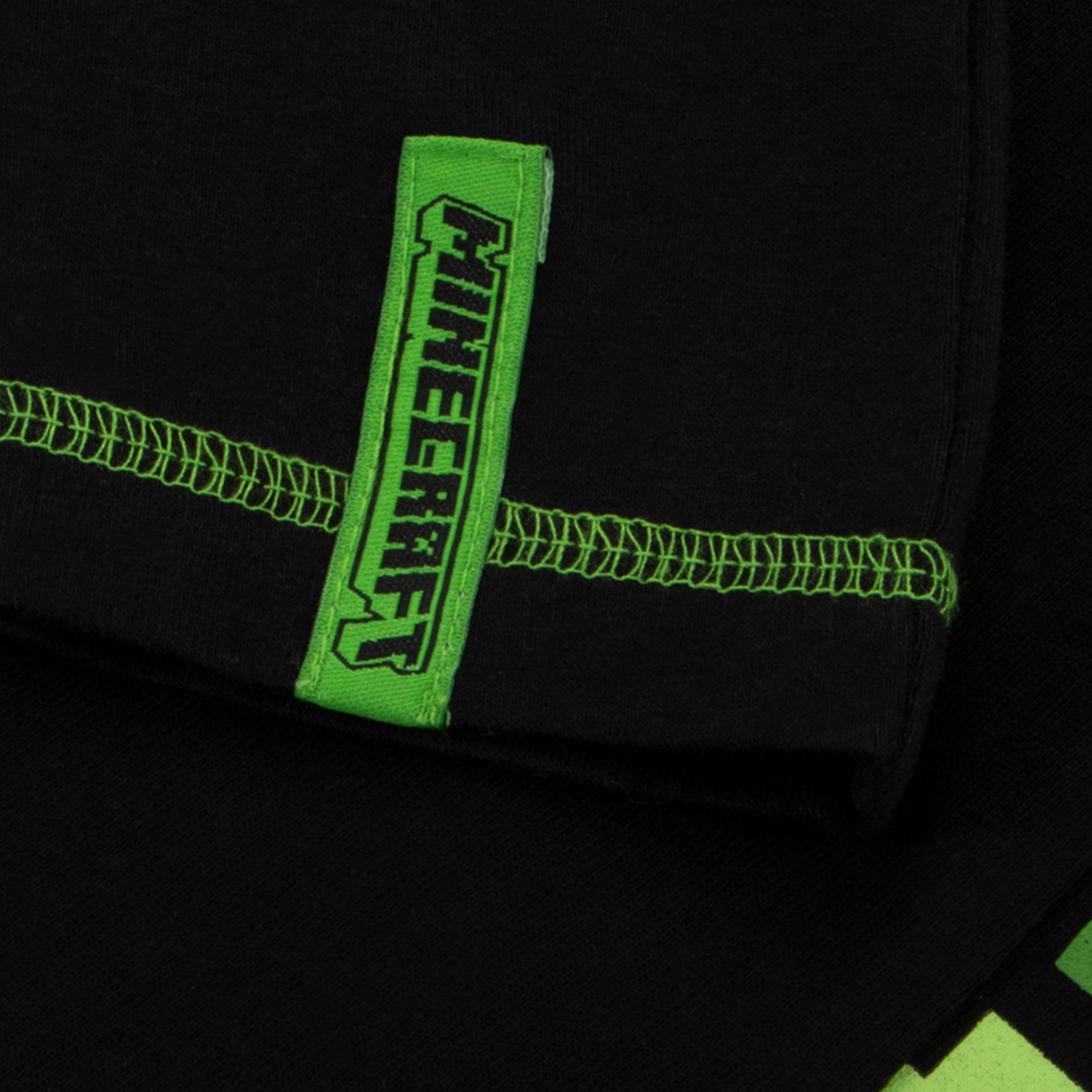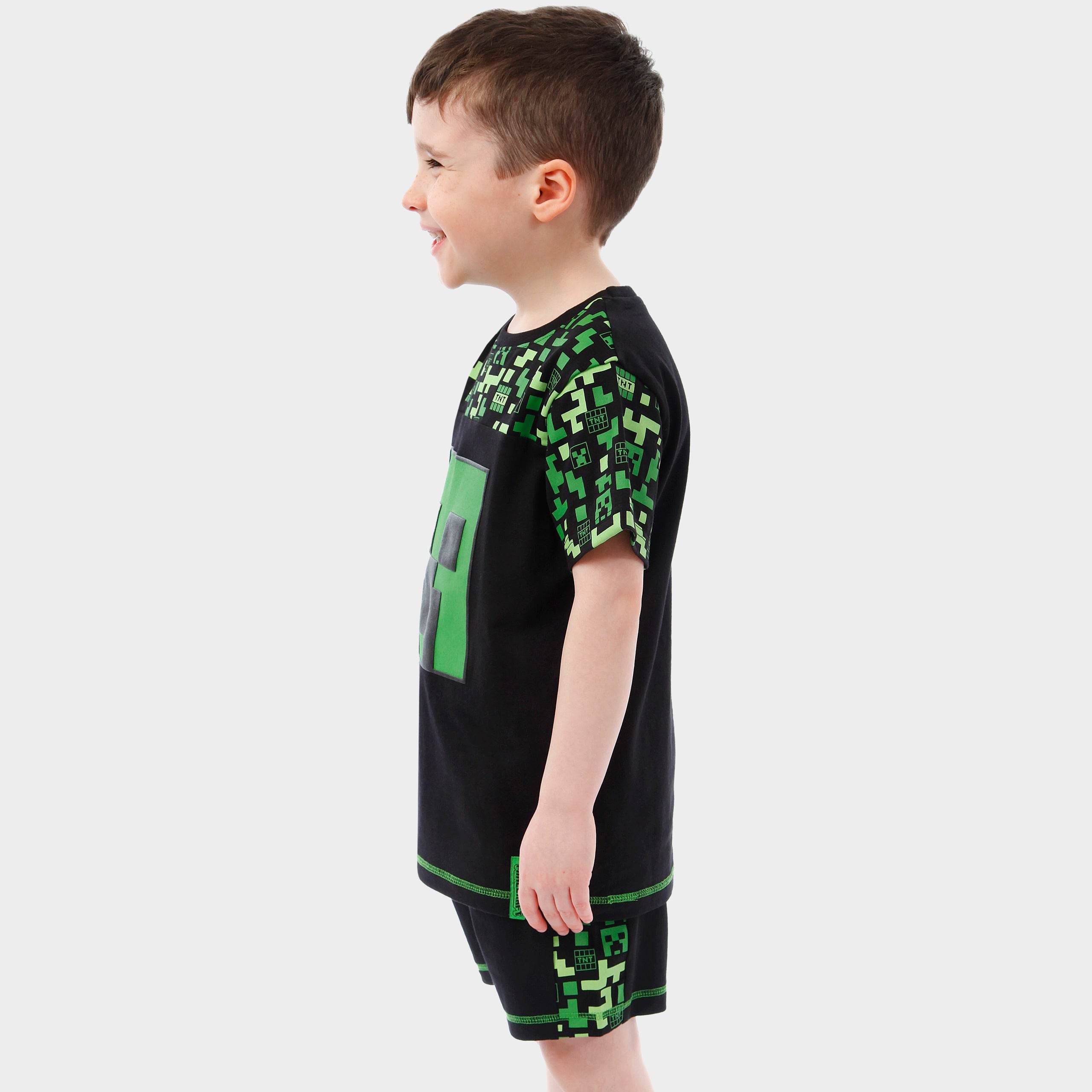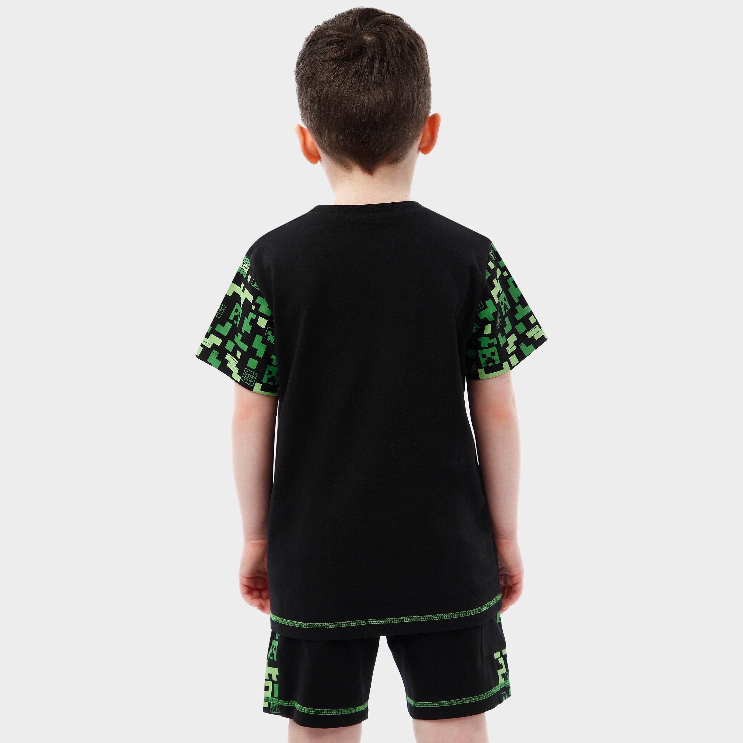 This boys' shorts and t-shirt set is a must-have for Minecraft enthusiasts. The black short sleeve t-shirt showcases a bold green Creeper face on the front, with a playful all-over print of Creeper heads, TNT boxes, and pixels around the neckline and sleeves. The matching shorts continue the fun pattern along the waistband and sides, with an additional Creeper face pocket for extra flair. Comfortable and stylish, this set is perfect for adventures both indoors and out.