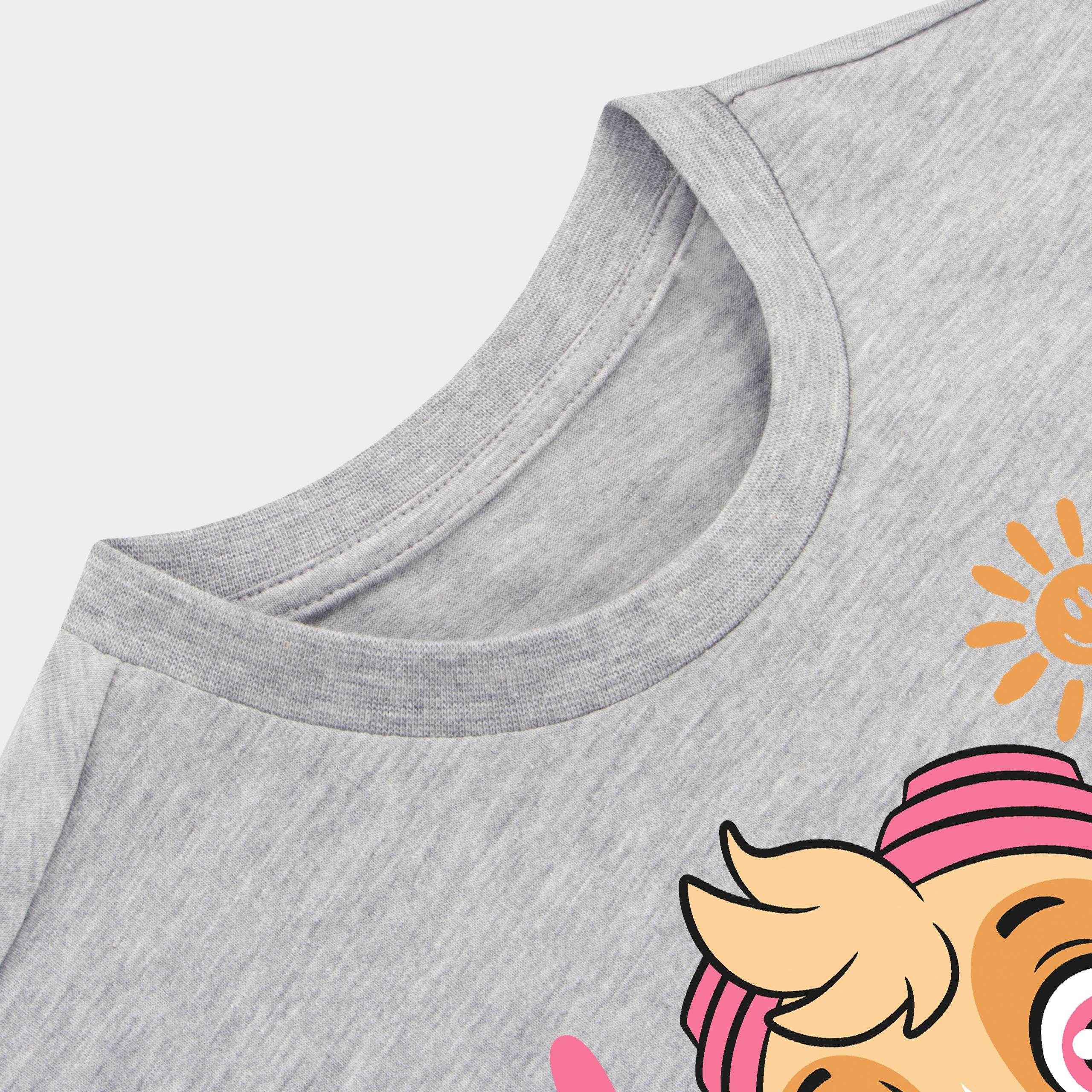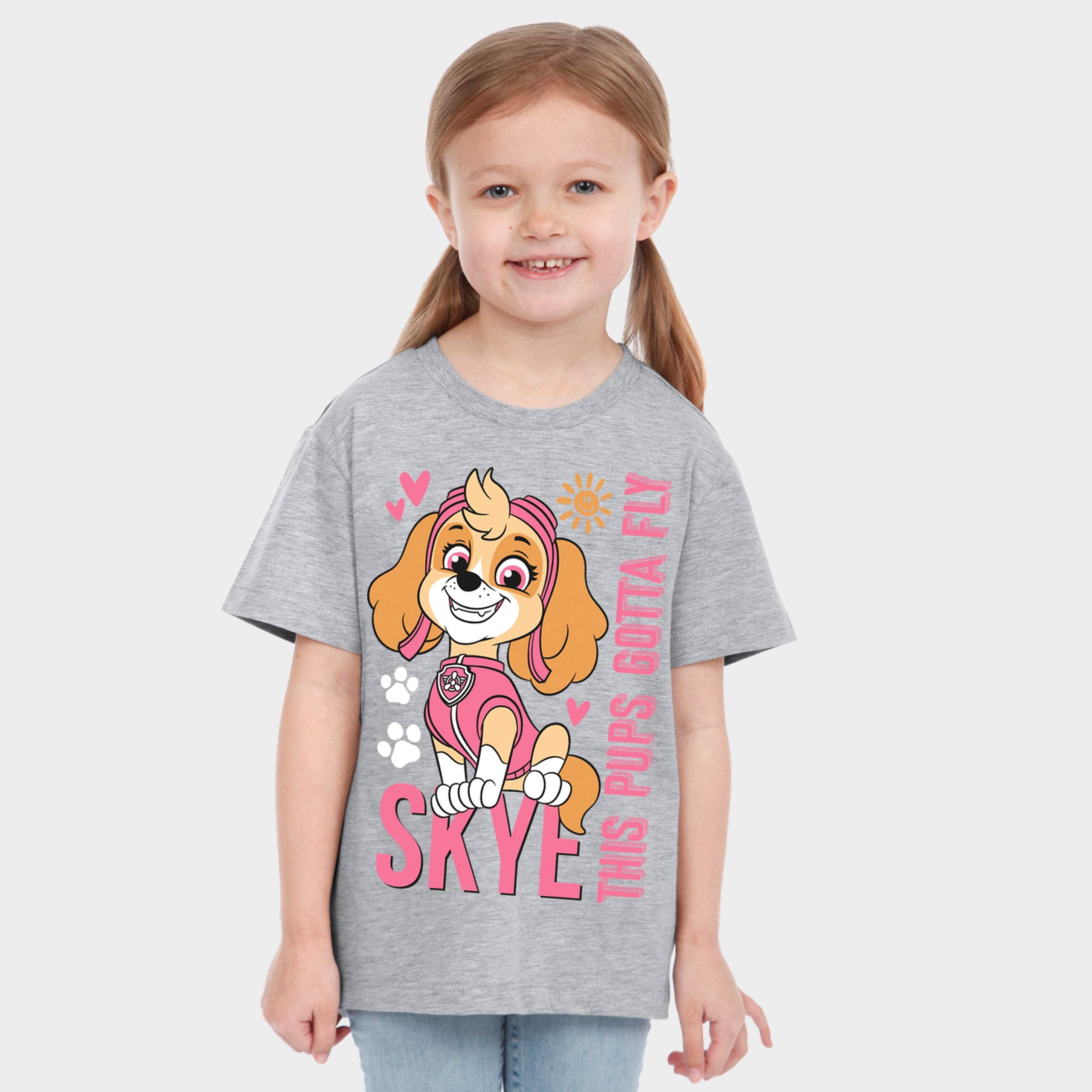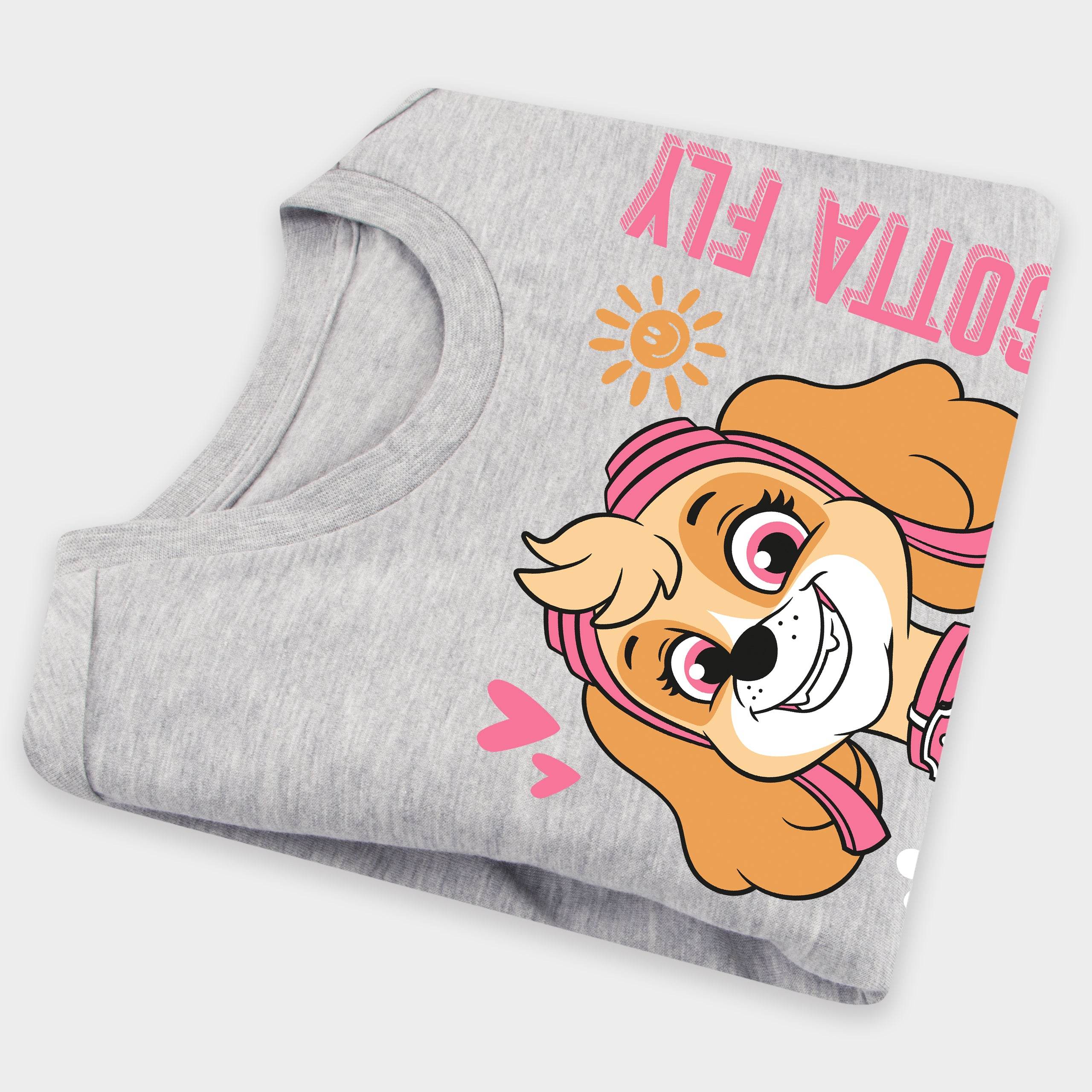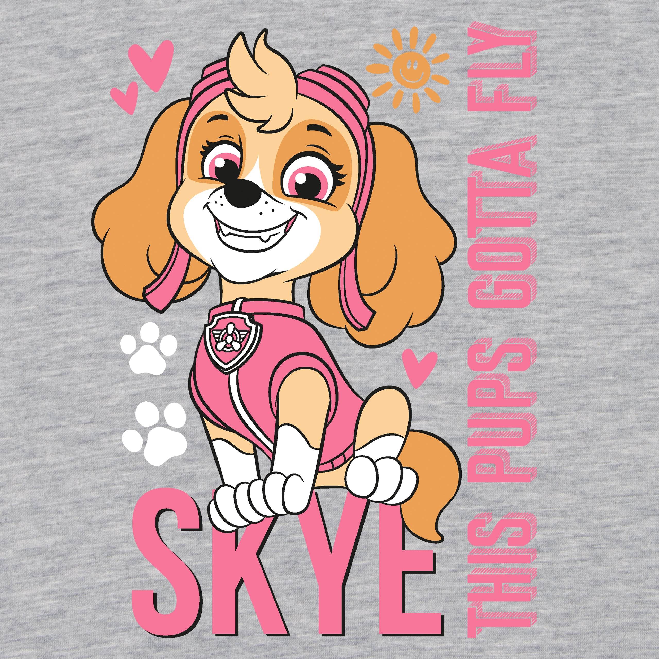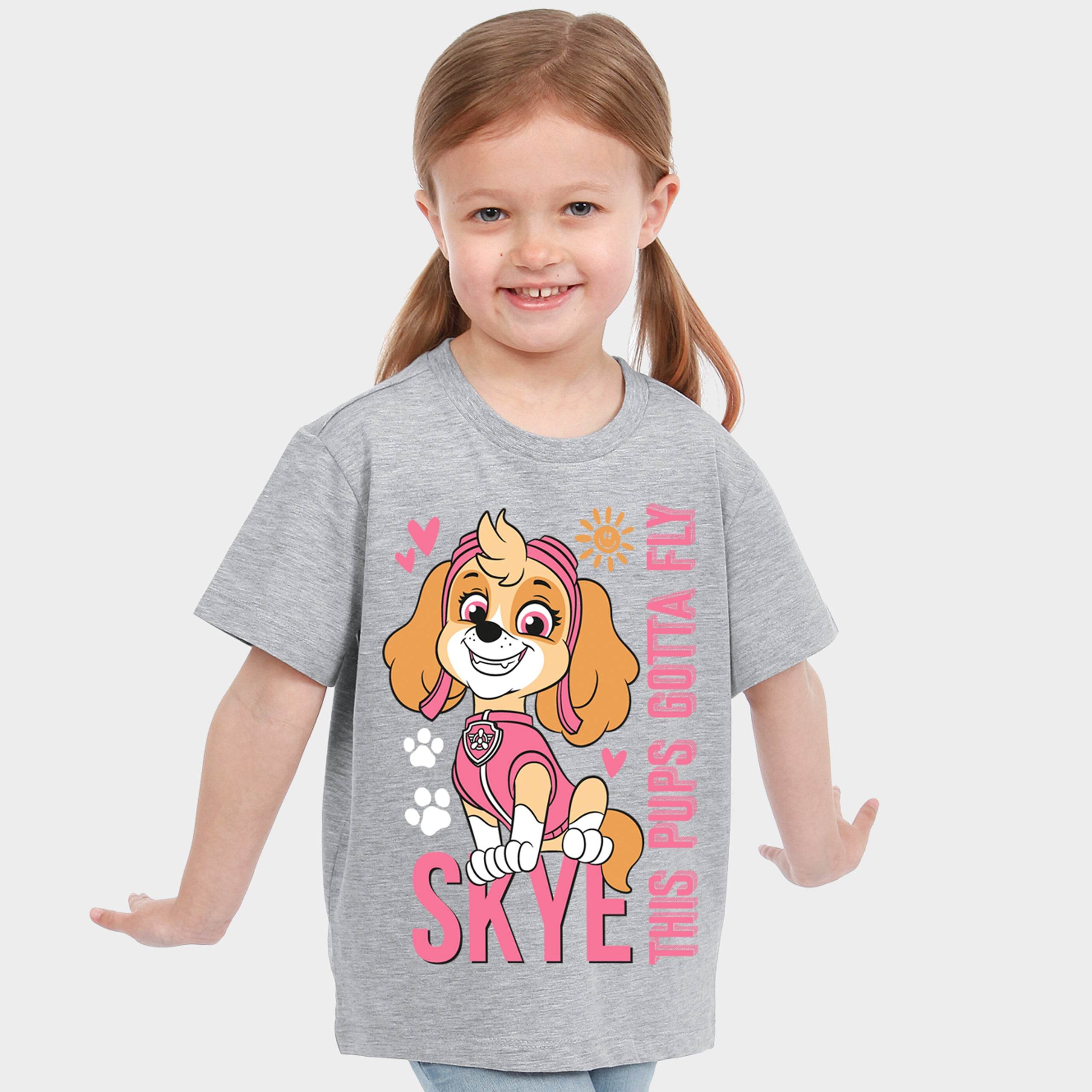 • Two Fun PAW Patrol Designs: The grey tee showcases Skye with paw prints, hearts, and the playful slogan "This Pup needs to fly" in bright pink.