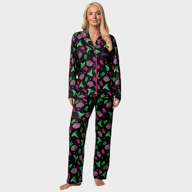 Child wearing a pink 'Stitch' themed nightshirt with Stitch and Angel cartoon characters on a blue background