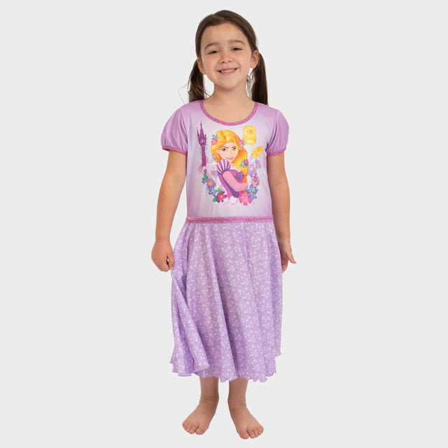 Child wearing a pink 'Stitch' themed nightshirt with Stitch and Angel cartoon characters on a blue background
