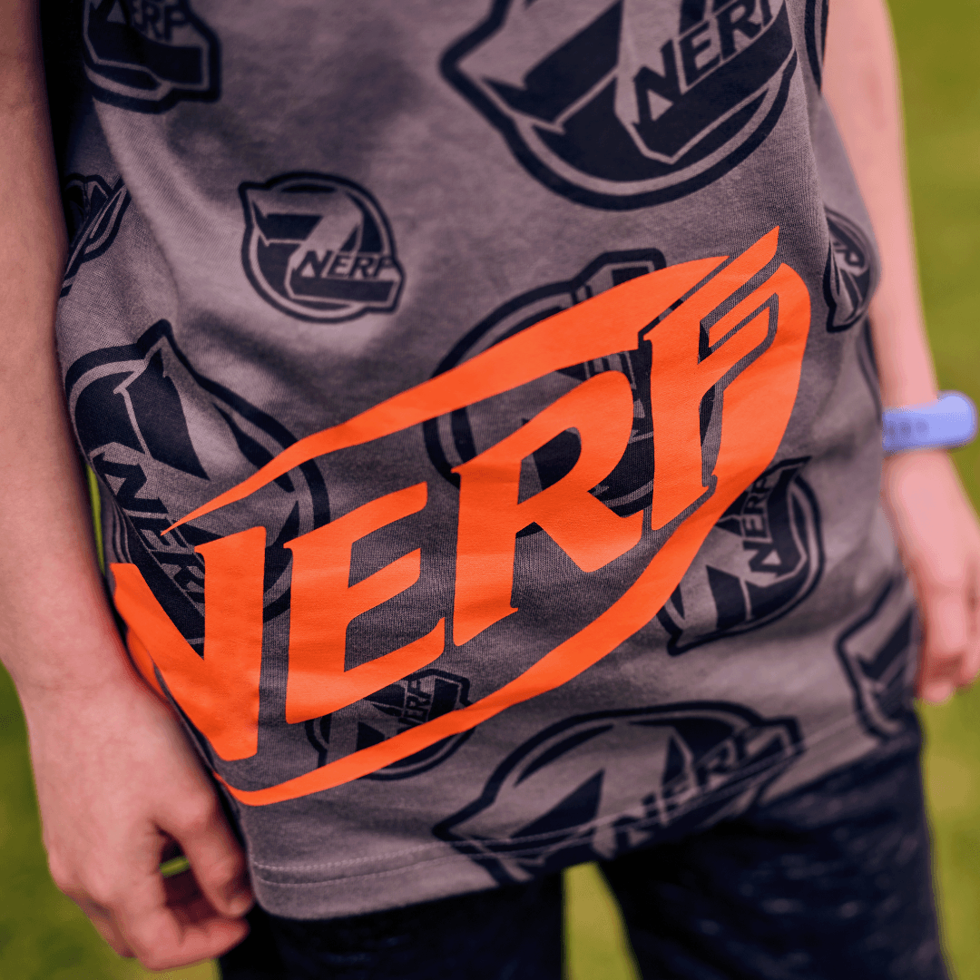 Get ready to show off your love for Nerf with this awesome T-Shirt! The dark grey top features an all-over print of the iconic black Nerf motif, with a bright orange Nerf logo at the bottom that really pops. And for all you Nerf enthusiasts out there, the T-Shirt even comes with a dart holder on the sleeve, so you can always be prepared for a Nerf battle. Whether you're battling it out with friends or just hanging out at home, this Nerf T-Shirt is the perfect addition to your wardrobe. So put it on, grab your blaster, and get ready for some serious fun!