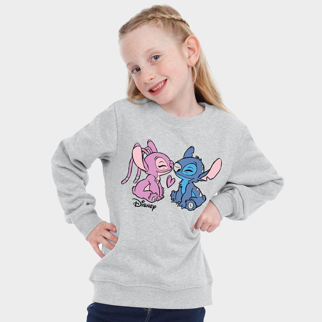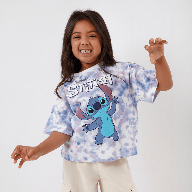 Child wearing a pink 'Stitch' themed nightshirt with Stitch and Angel cartoon characters on a blue background