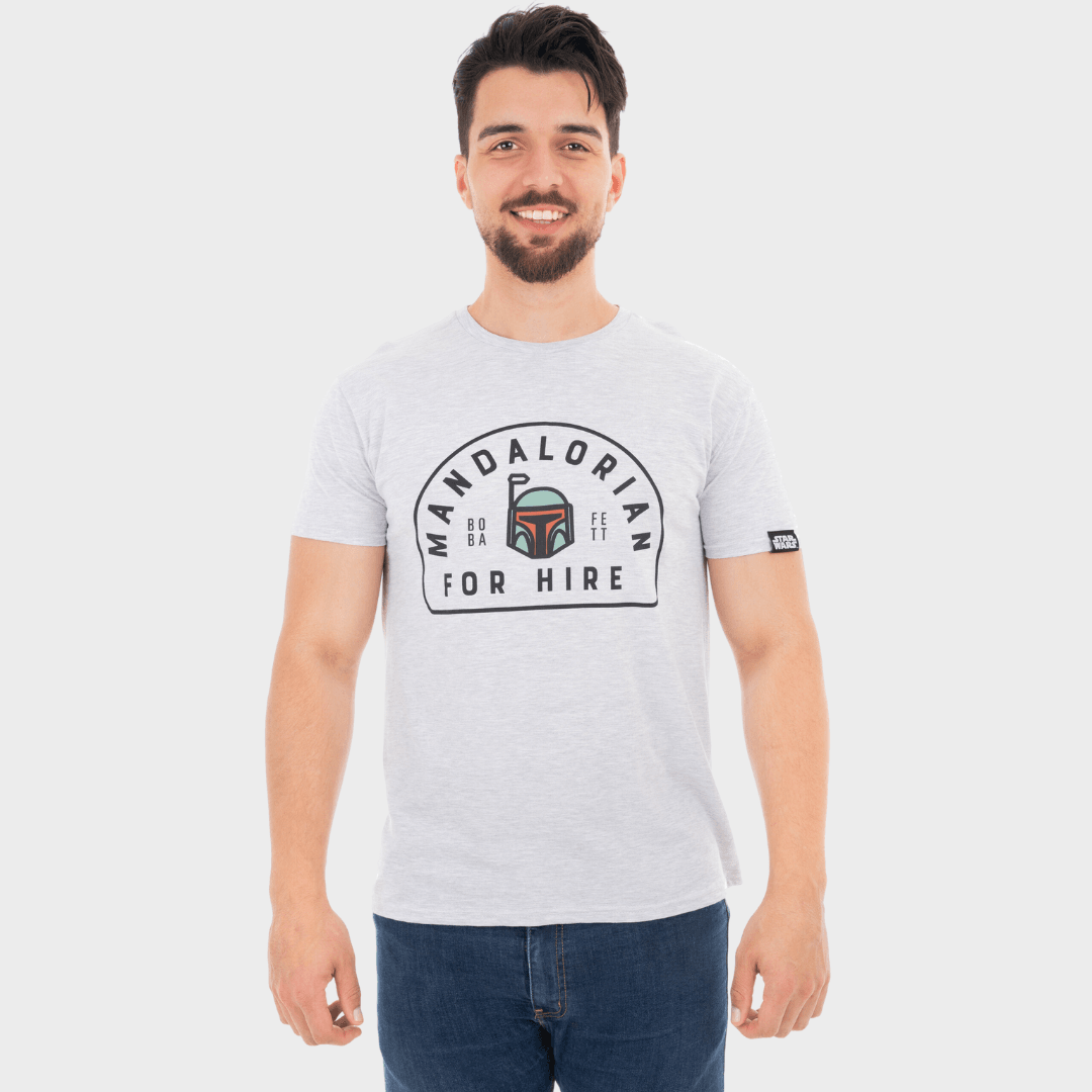 Advertise your bounty hunter expertise with this 'Mandalorian For Hire' t shirt! This grey short-sleeve tee shows a simplistic graphic of the Mandalorian helmet along with Boba Fett's name and 'Mandalorian For Hire' in bold font, with a Star Wars patch detail on the sleeve's hem. Perfect for a Bounty Hunter ready for adventure!
