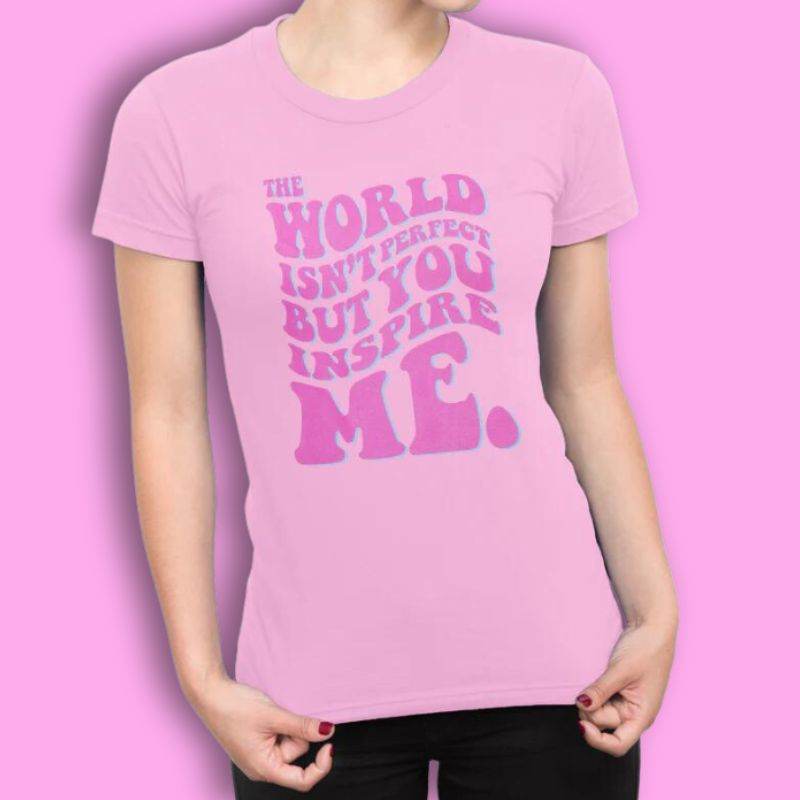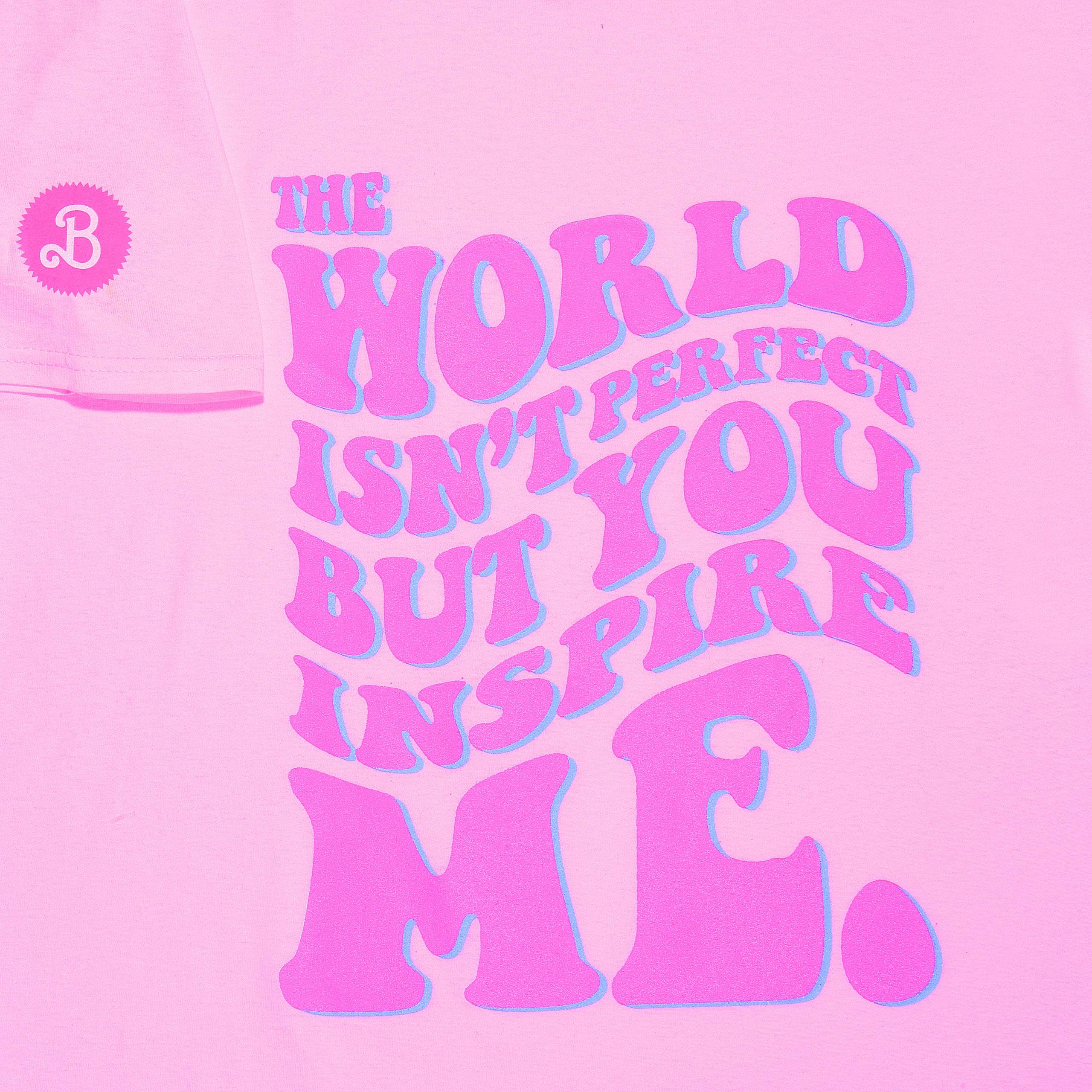 • Inspire yourself with our Barbie T-Shirt for Women, a playful pink tee featuring the uplifting message "The World Isn't Perfect But You Inspire Me" in a retro font.