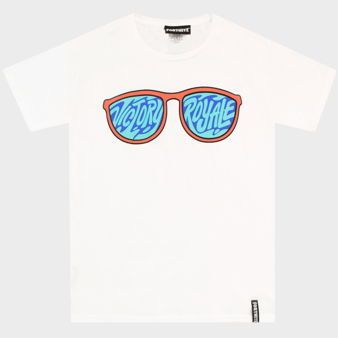 Fortnite fans can now celebrate their latest Victory Royale with this awesome Fortnite t-shirt! This white short sleeve tee showcases a vibrant graphic print of red sunglasses with the slogan 'Victory Royale' filling the frames in a fun blue design, and also features a black Fortnite tag on the hem. The coolest addition to your video gamer's wardrobe and the best top to wear into their next Battle Royale, this colourful top will go perfectly with their new Victory Crown!