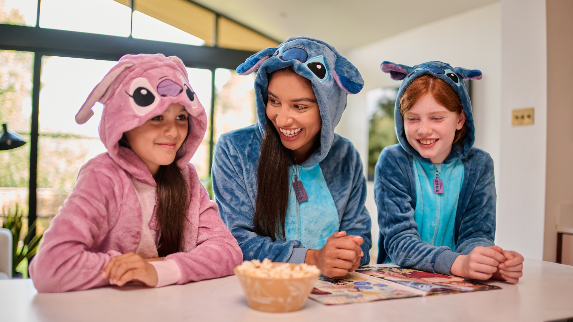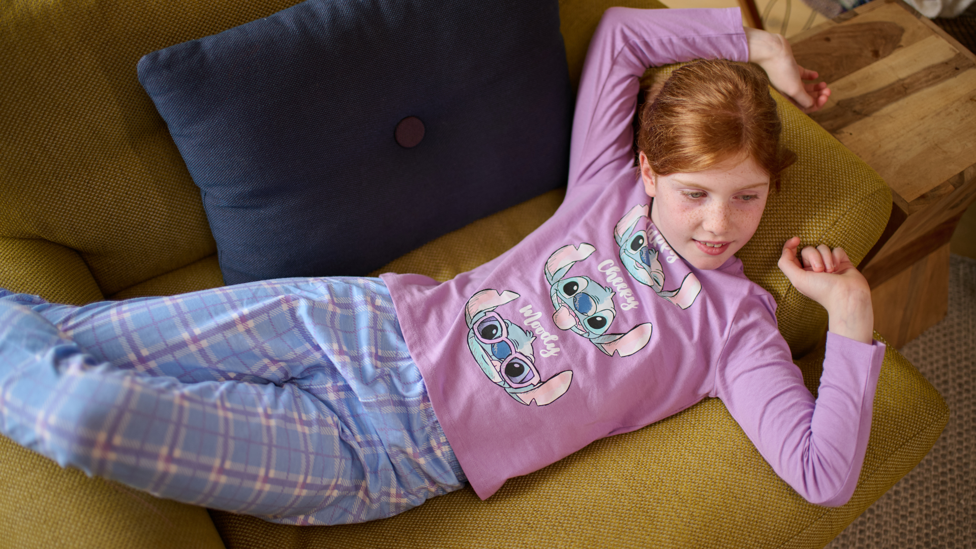 Child wearing a pink 'Stitch' themed nightshirt with Stitch and Angel cartoon characters on a blue background