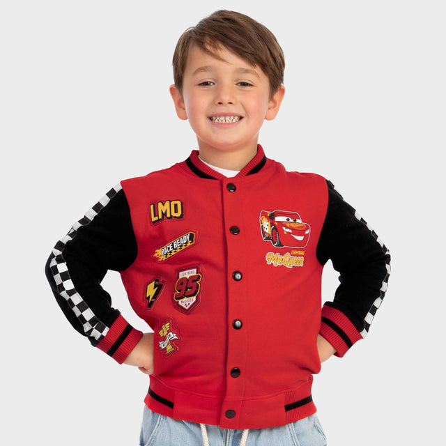 Child wearing a red shirt with a car design and 'Lightning McQueen' text on a red background