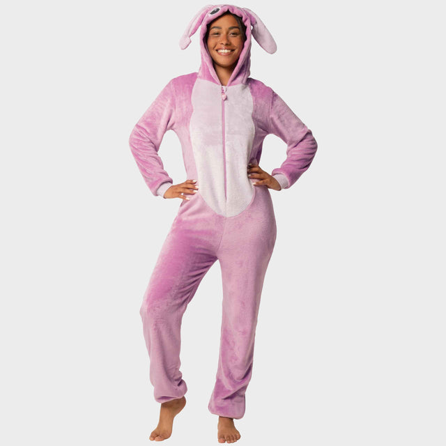 Child wearing a pink 'Stitch' themed nightshirt with Stitch and Angel cartoon characters on a blue background