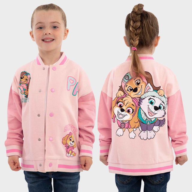 Girl wearing a pink and white striped PAW Patrol dress with Skye prints on a pink background with paw prints.