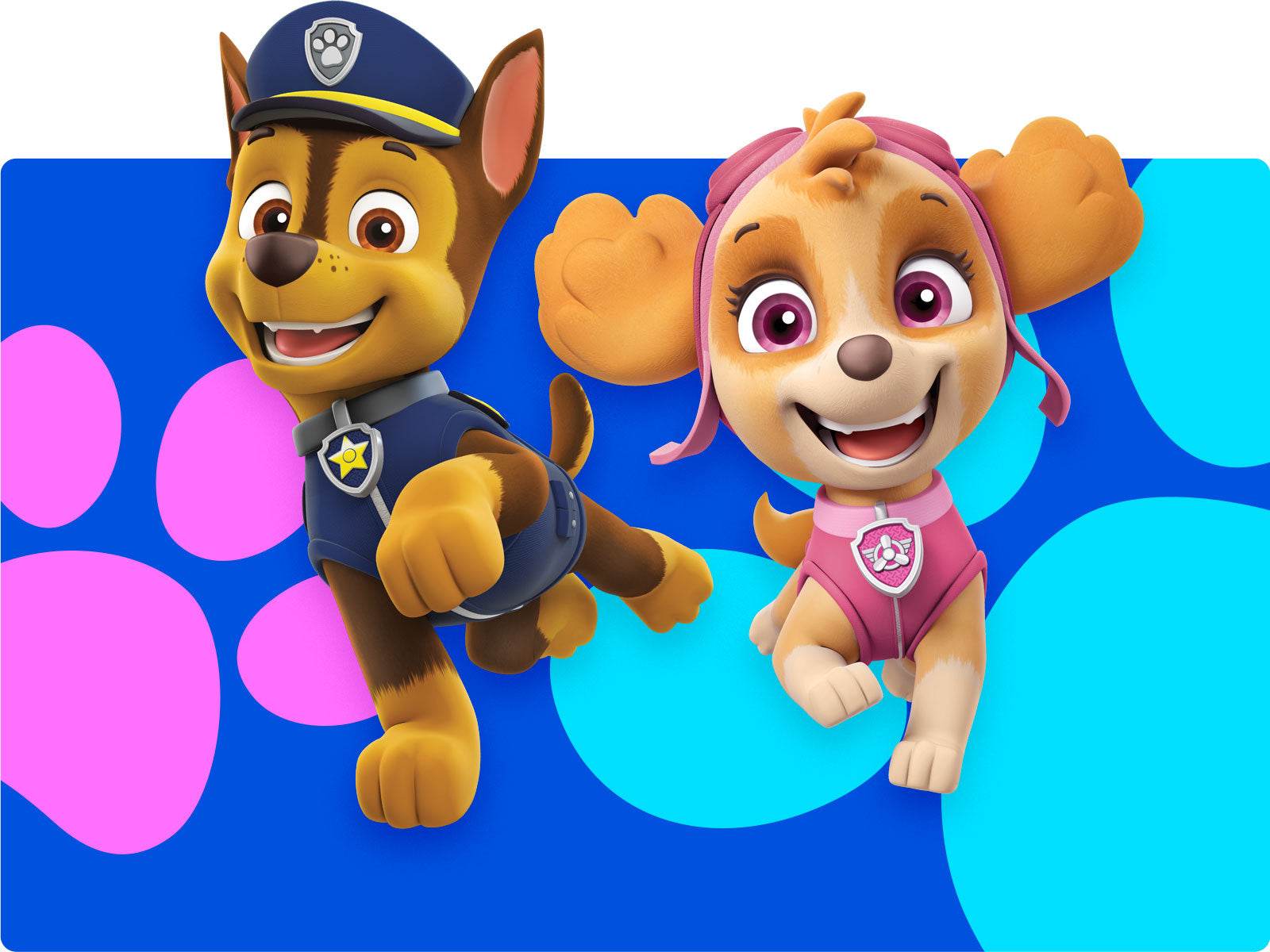 Chase and Skye from PAW Patrol running as if towards the camera on a Blue and pink background