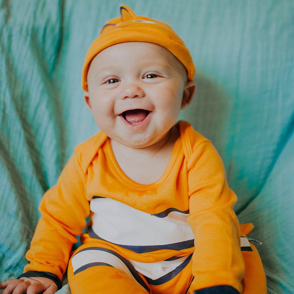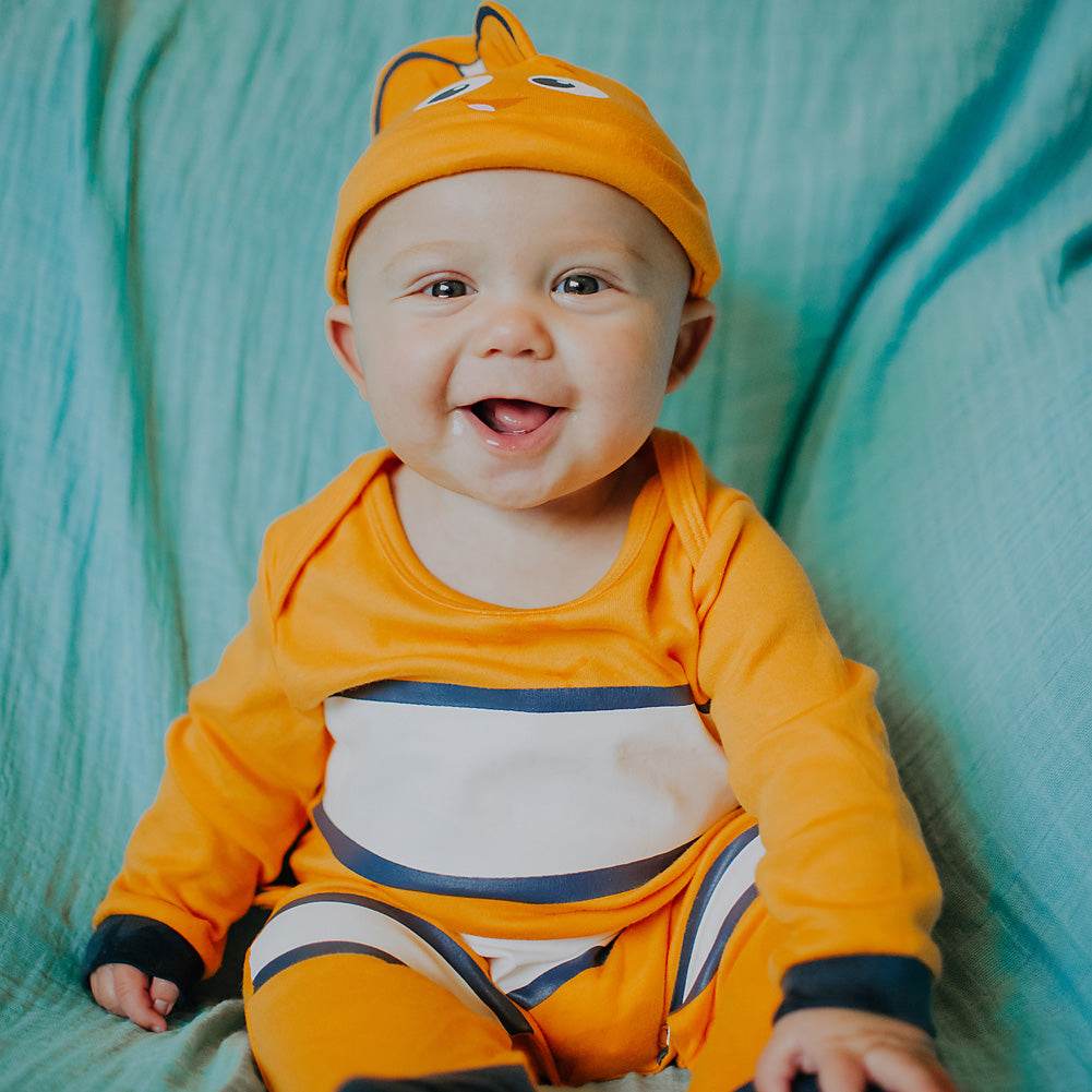 Fish are friends, not food! Your little clownfish will love squirming about in this adorable Finding Nemo onesie which mimics Nemo's orange and white striped patten and even includes his 'lucky fin'! Paired with a matching orange hat with Nemo's face and 3D fin on top, any Finding Nemo fan will want to dress their little squishy in this adorable babygrow!