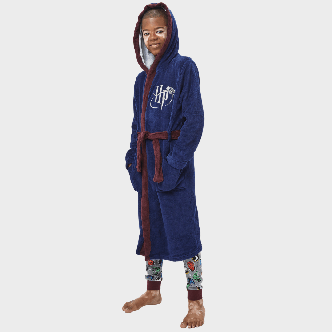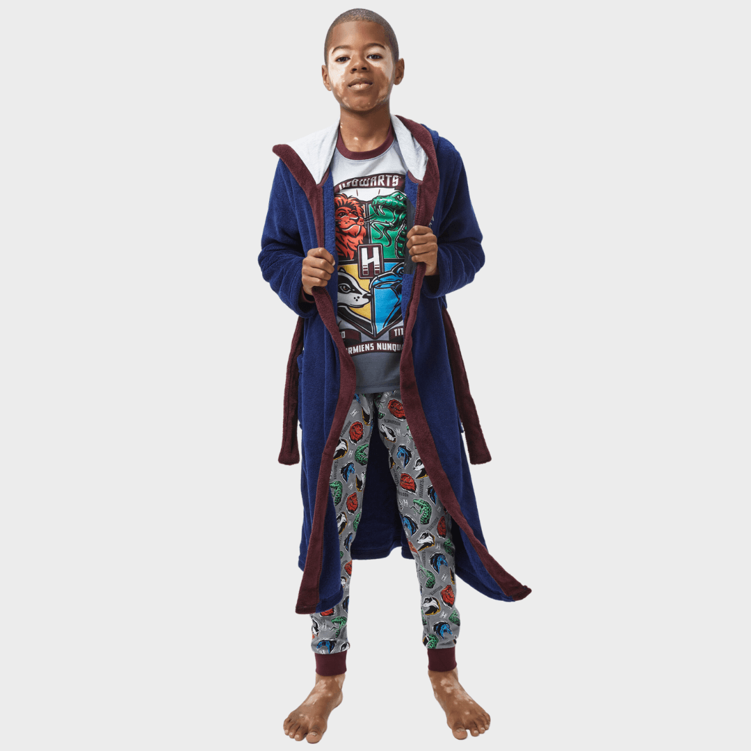 Don't send your little wizard off to Hogwarts without this Harry Potter pyjama and dressing gown set! Whether hes in Gryffindor, Slytherin, Hufflepuff or Ravenclaw, these pjs are a must-have for all Hogwarts students. The grey and blue top features the Hogwarts crest and the school motto 'Draco Dormiens Nunquam Titillandus', while the bottoms showcase a print of the animals of each House. Complete with a matching blue and burgundy dressing gown, your little wizard will be ready for a cosy night practicing spells in the common room!