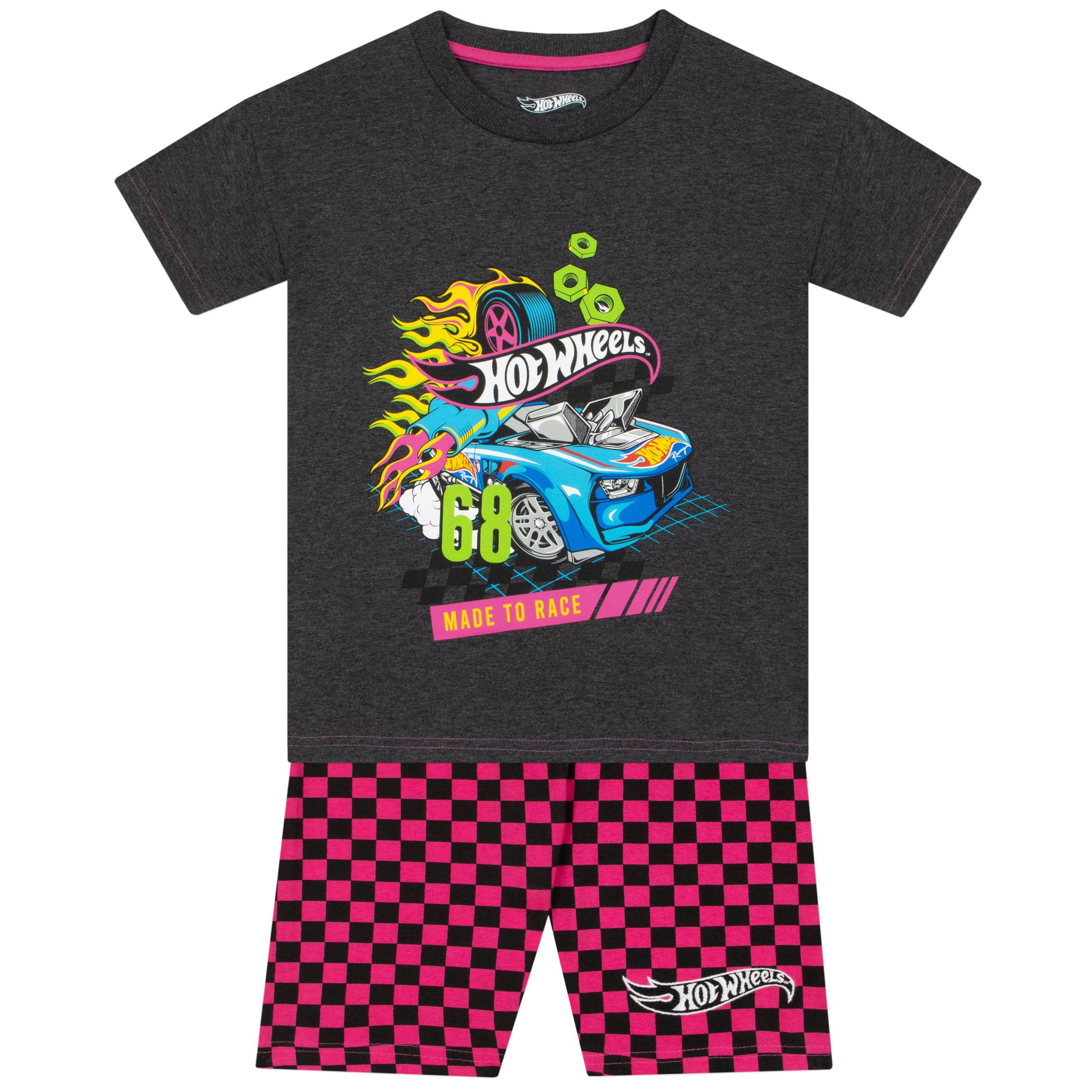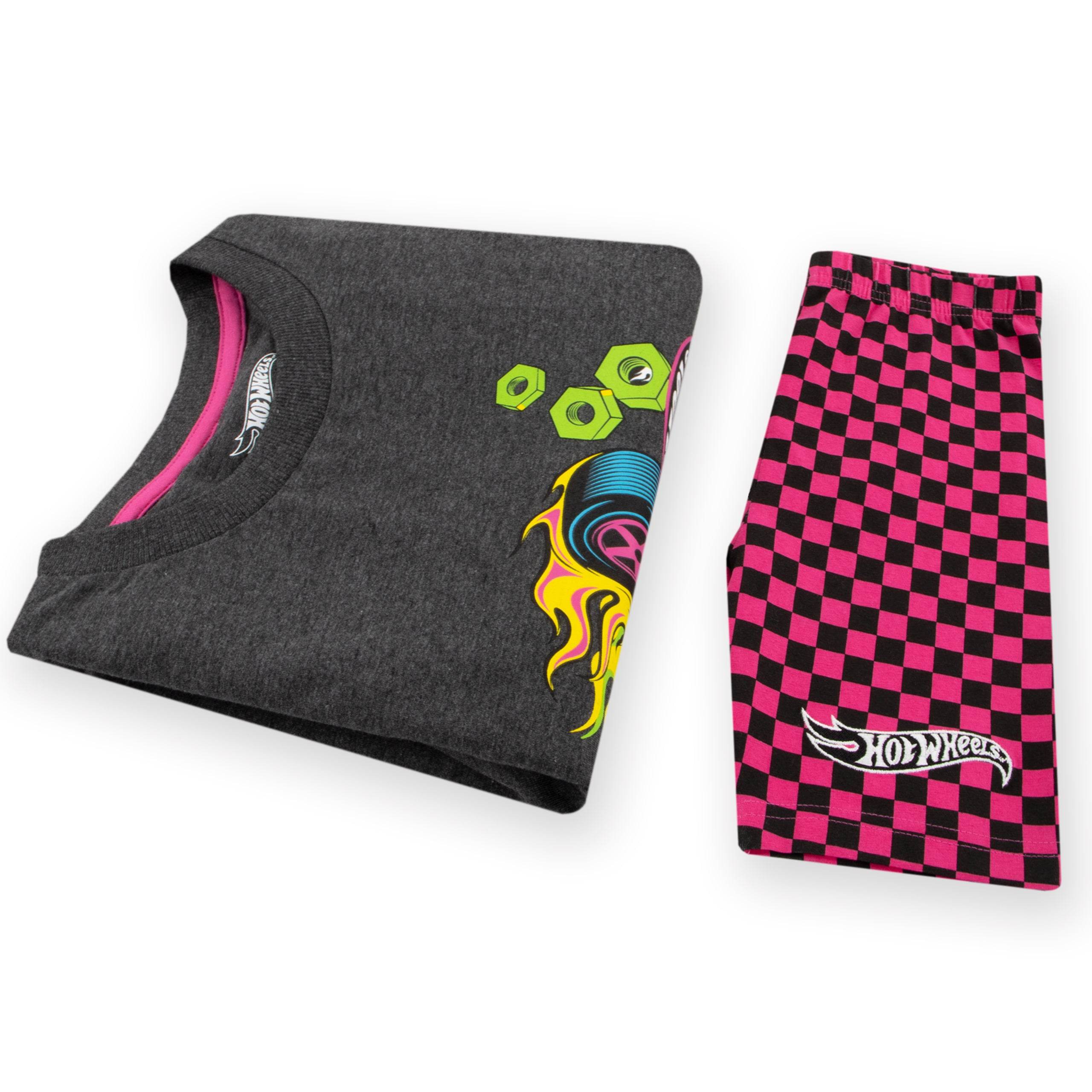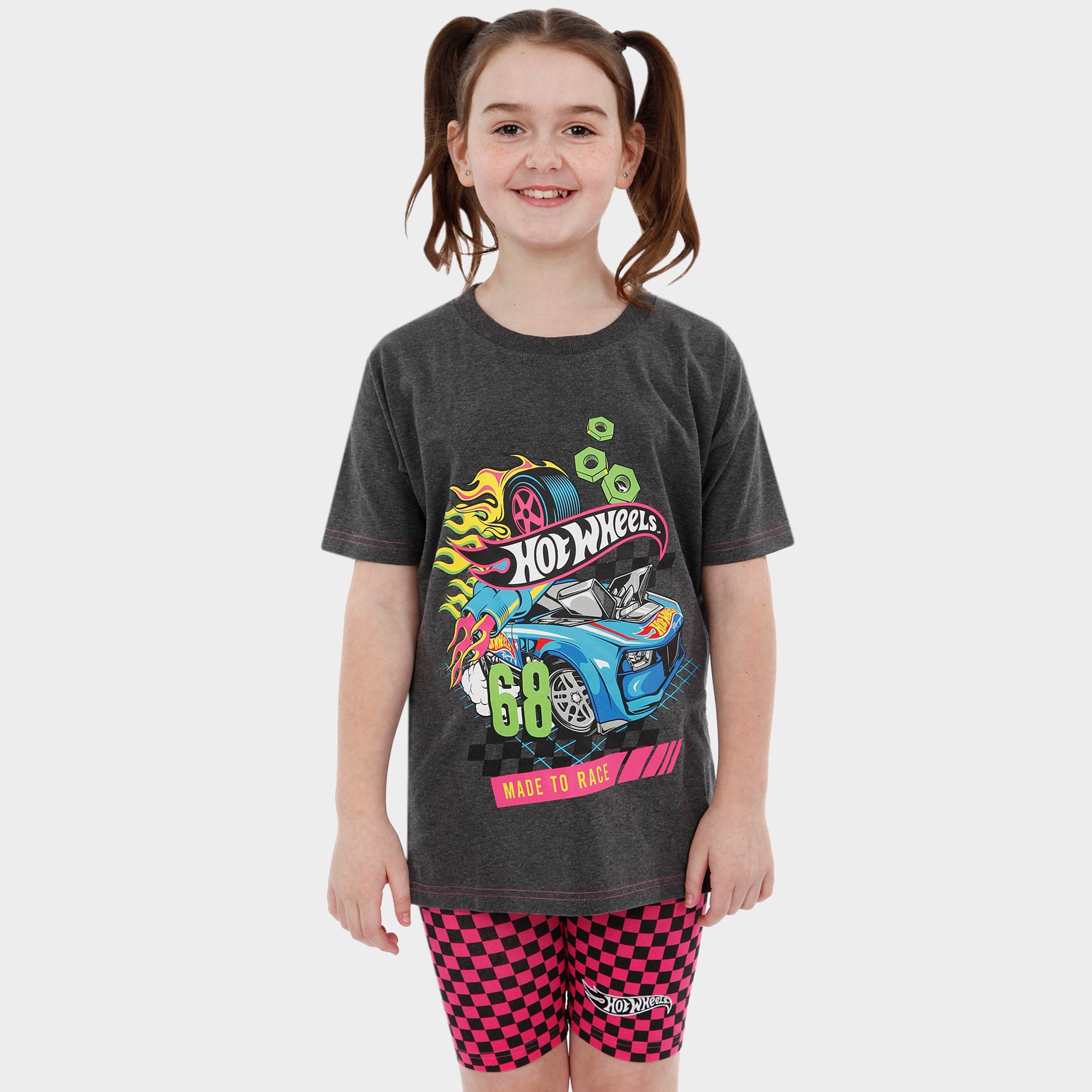 Rev up your little one's wardrobe with the Hot Wheels Tshirt and shorts set for girls. This exciting outfit combines a dark grey tee shirt showcasing a dynamic graphic of a blue Hot Wheels car speeding by, with the slogan "Made to Race" beneath. The set also includes trendy pink and black checkered cycle shorts, adorned with the Hot Wheels logo on one leg. As officially licensed Hot Wheels merchandise, it's the perfect ensemble for any young racing enthusiast.