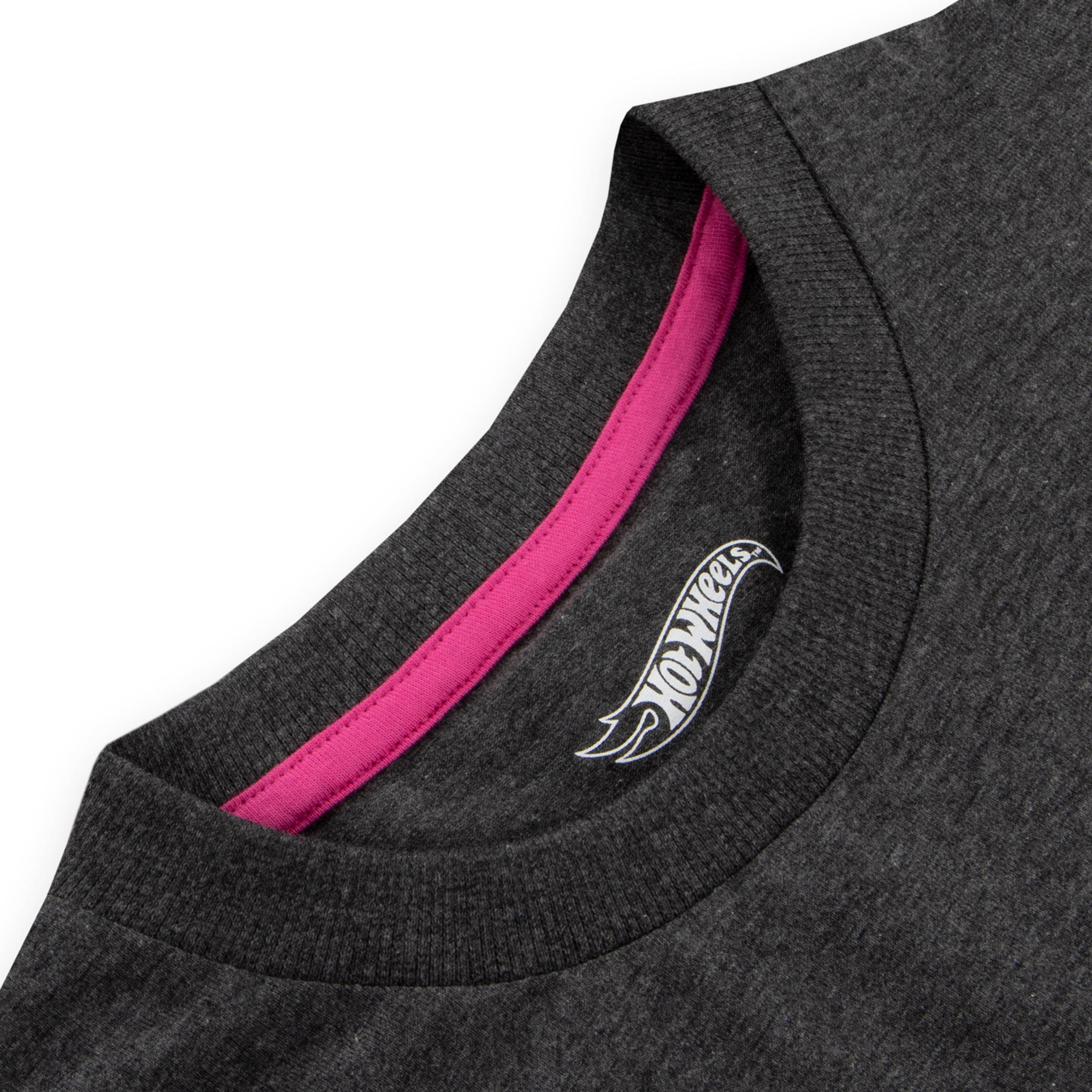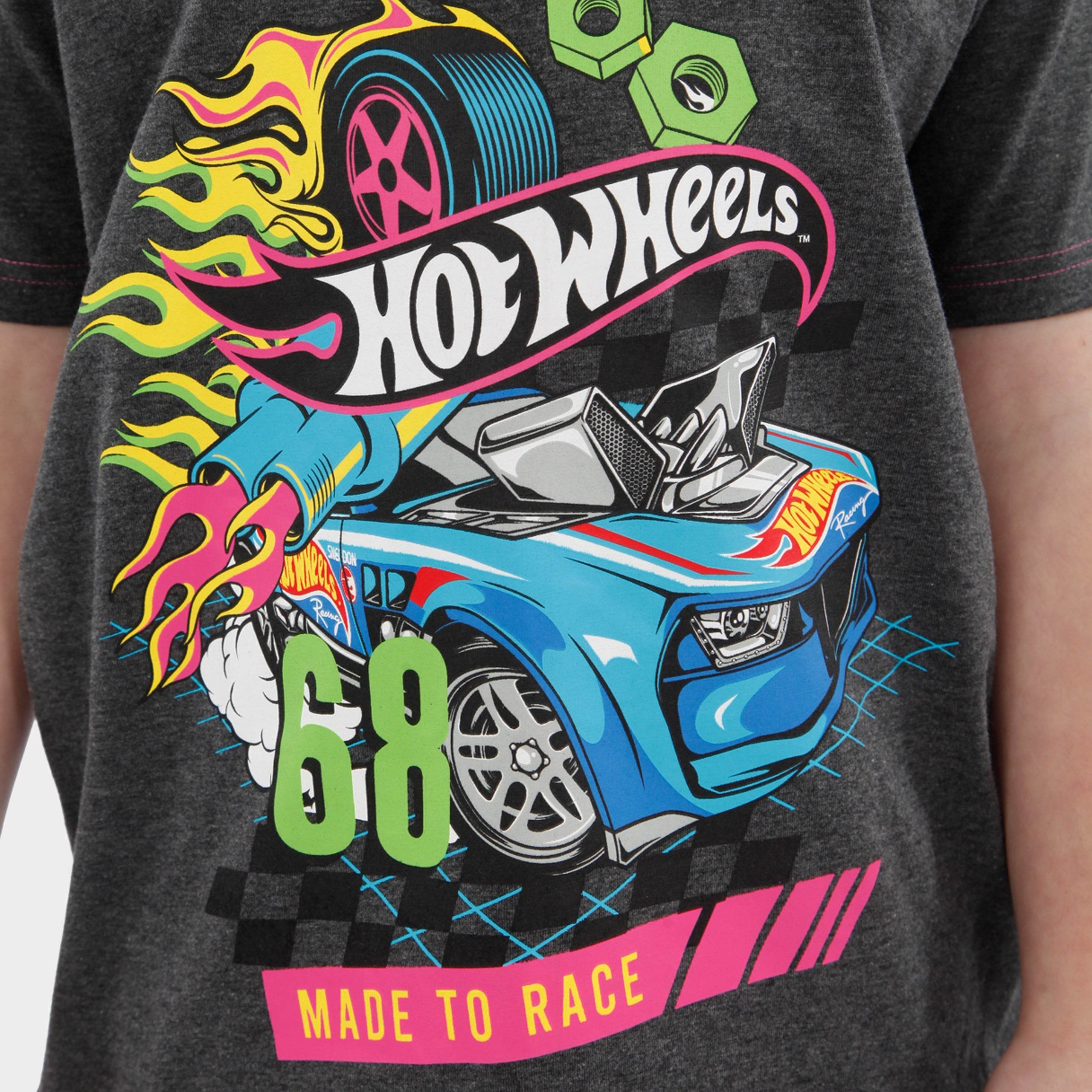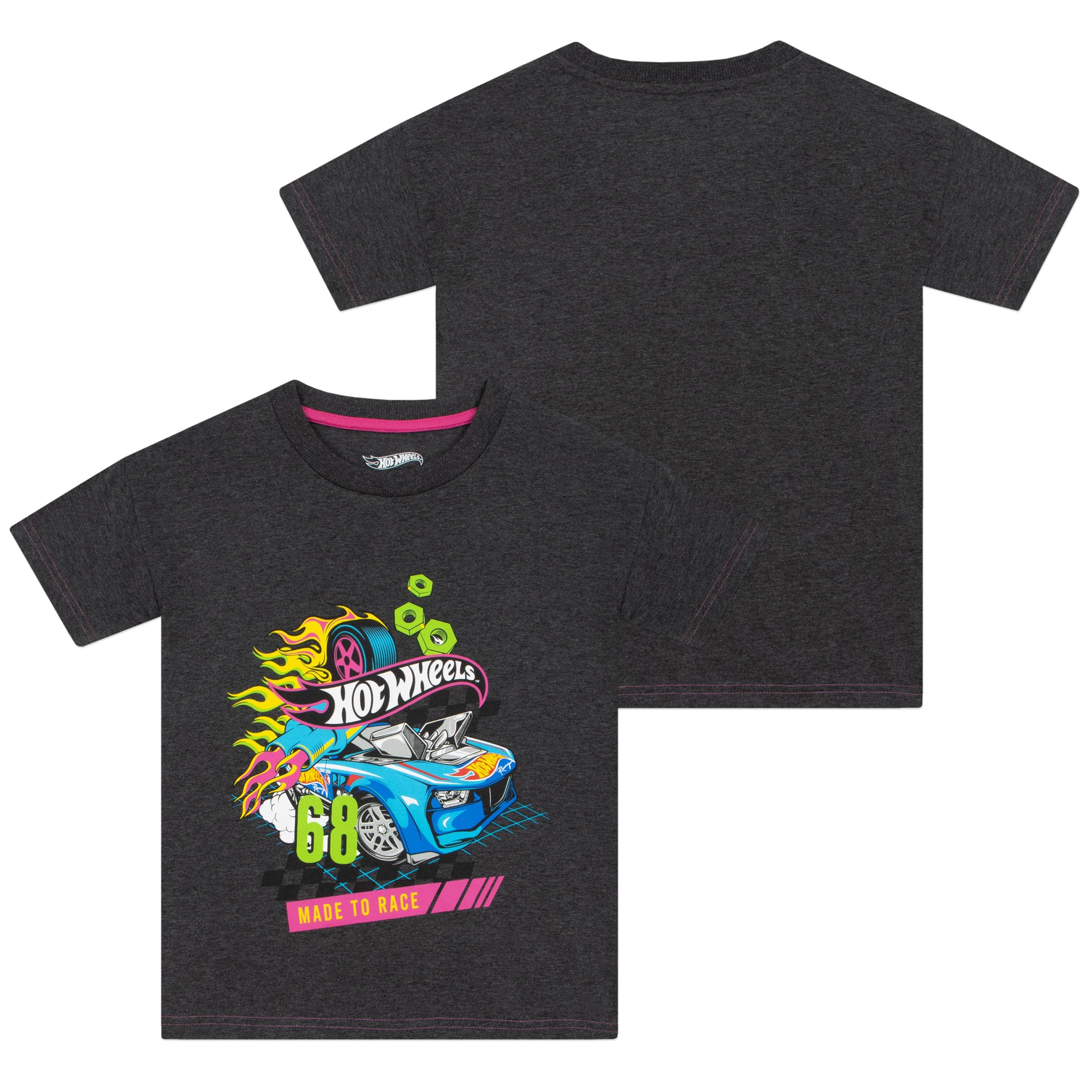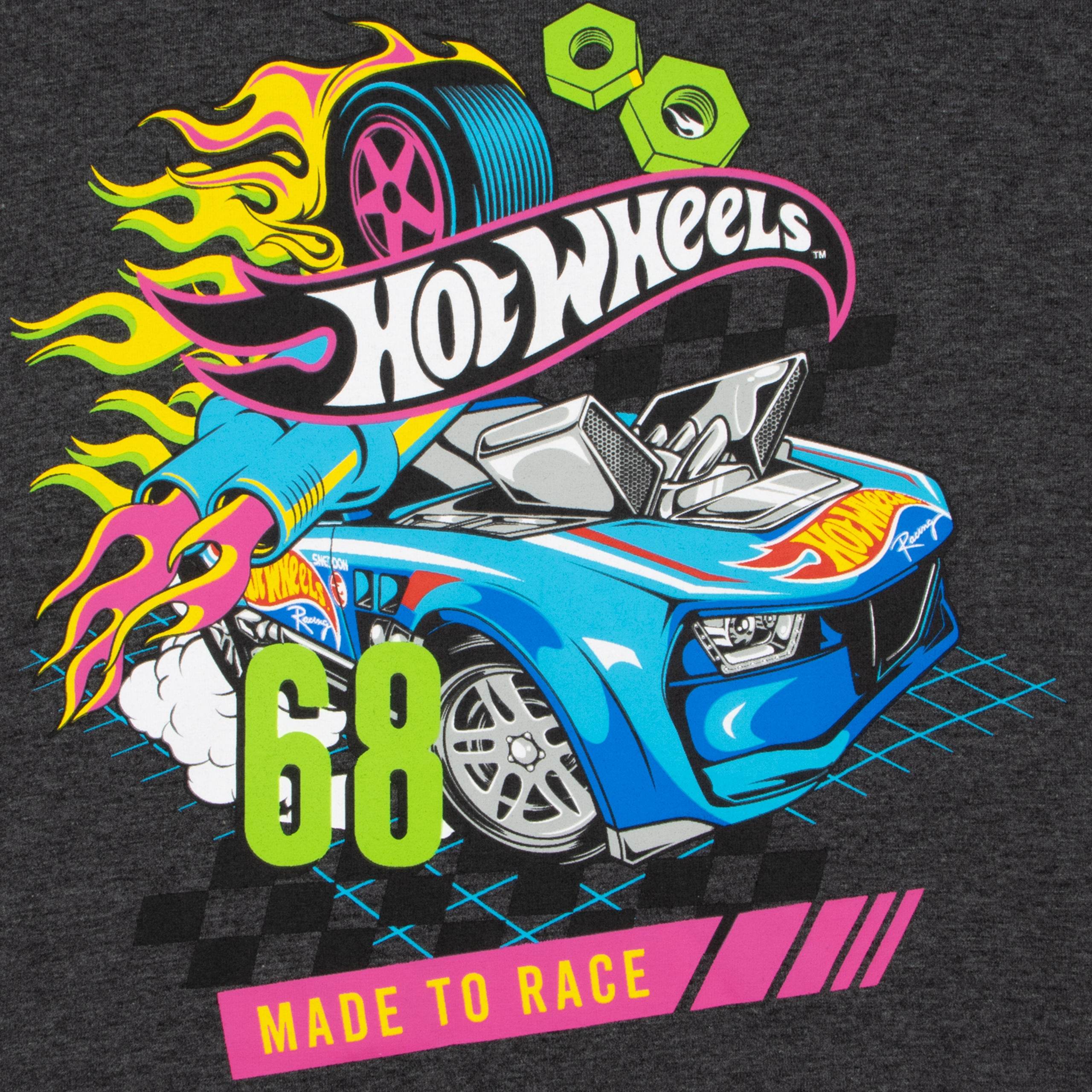 • Cool Car Action: Features a dark grey top with a vibrant blue Hot Wheels car and "Made to Race" slogan.