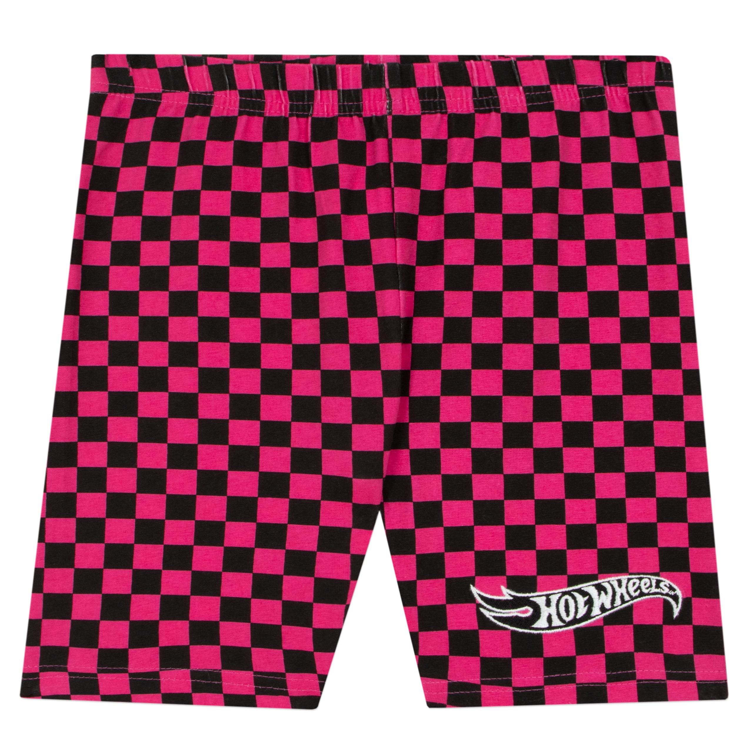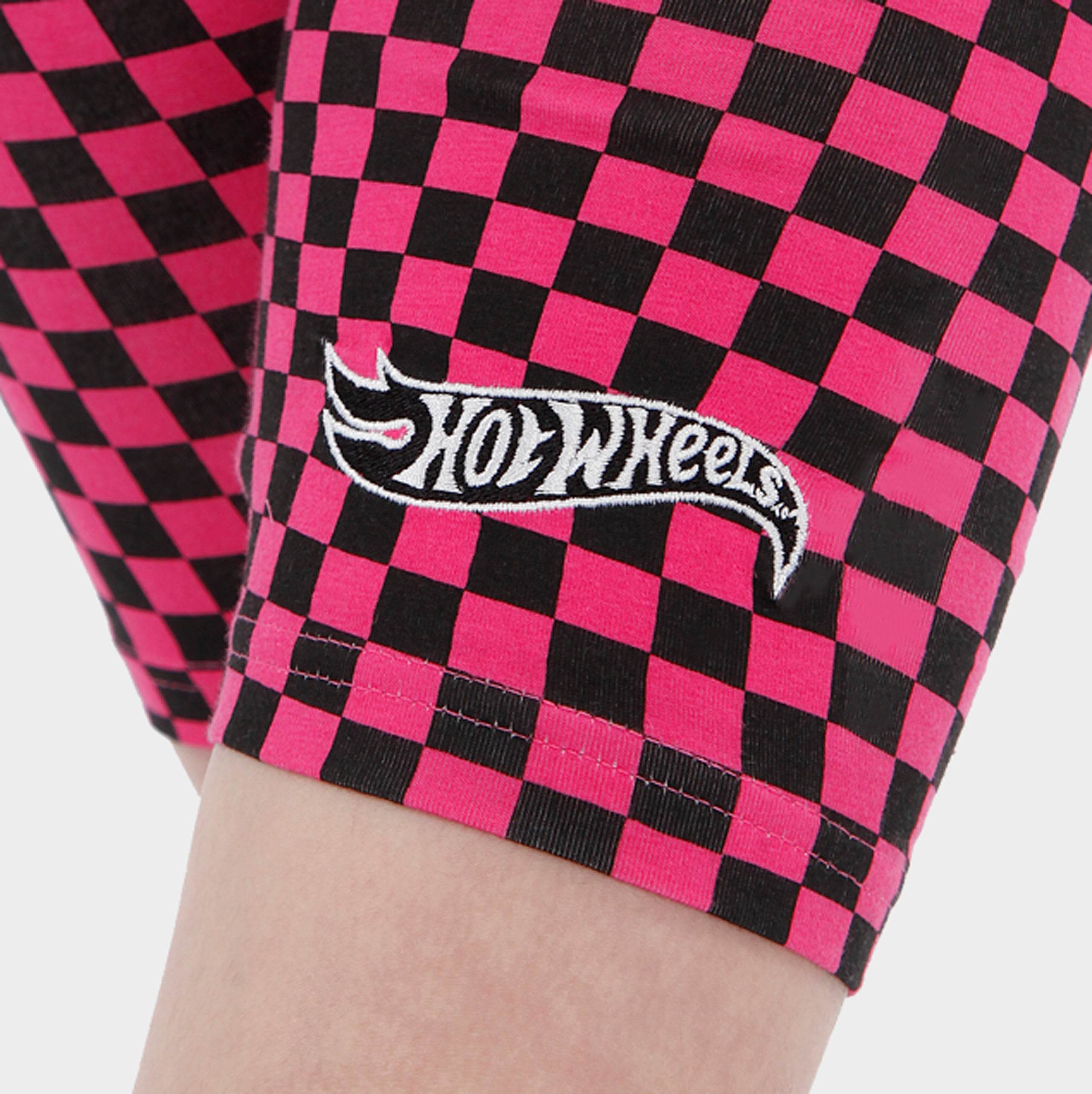 • Checkered Style: Includes pink and black checkered cycle shorts with the iconic Hot Wheels logo.