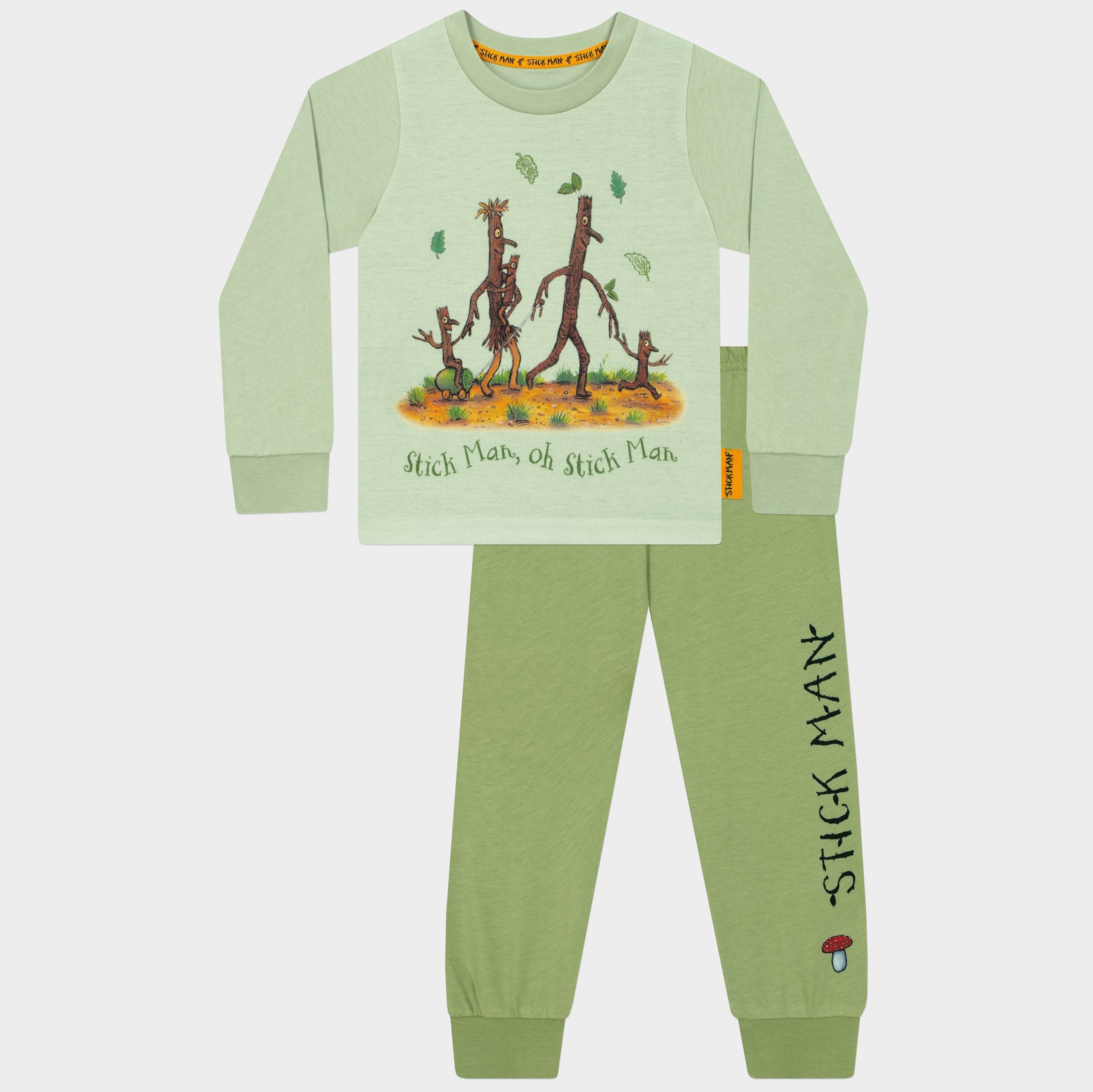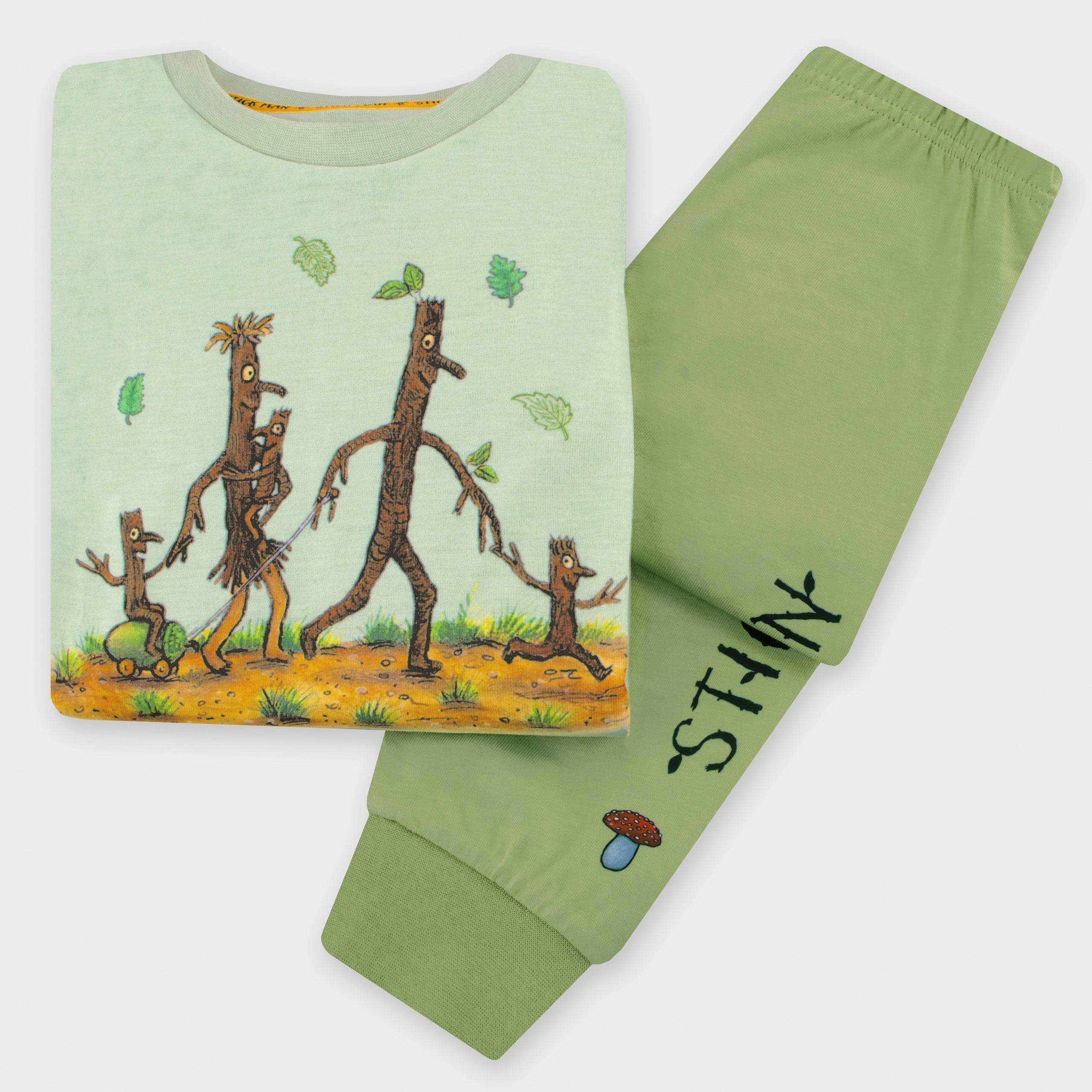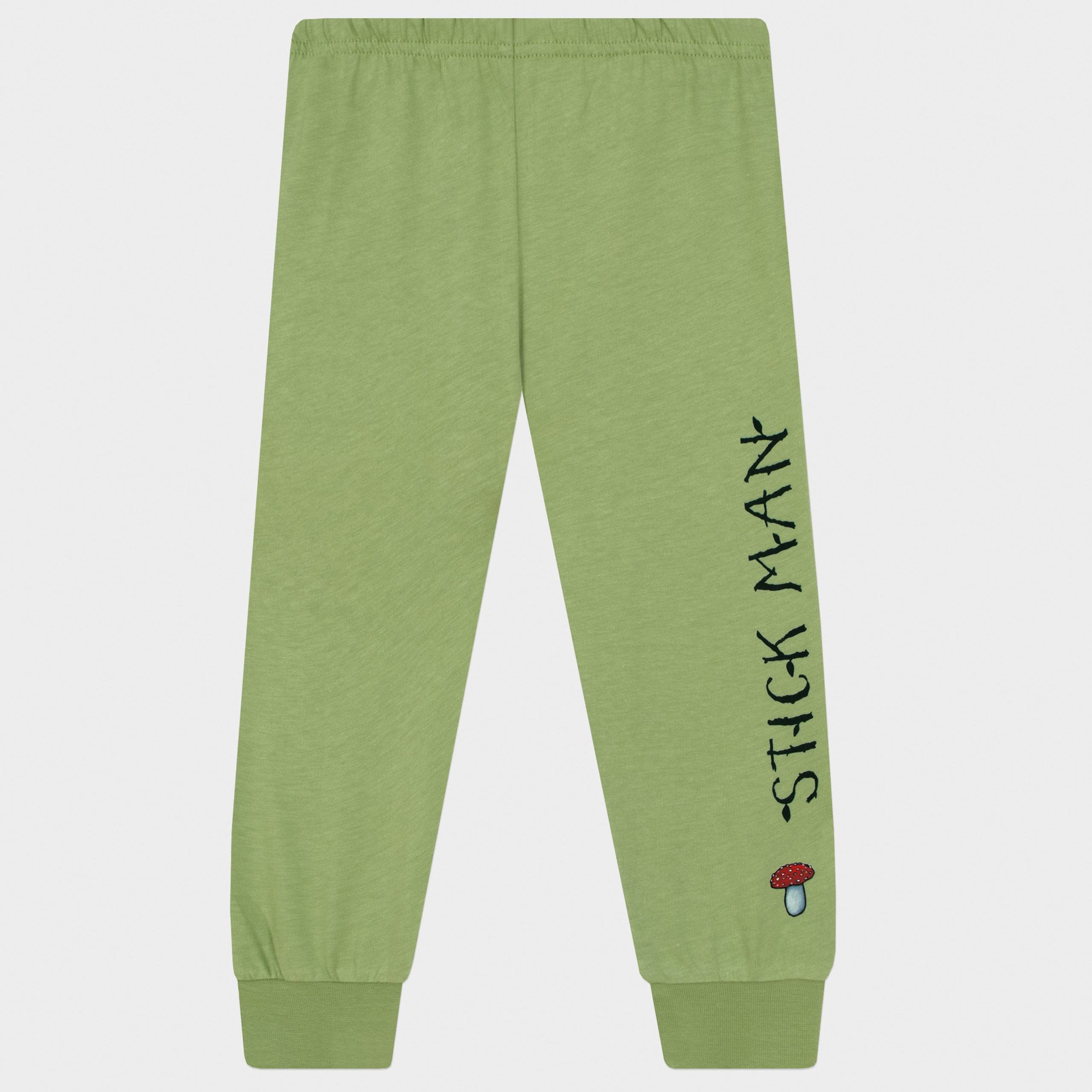 • Matching Magic Pyjamas: The darker green bottoms with "Stick Man" lettering and a cute mushroom detail complete the look.