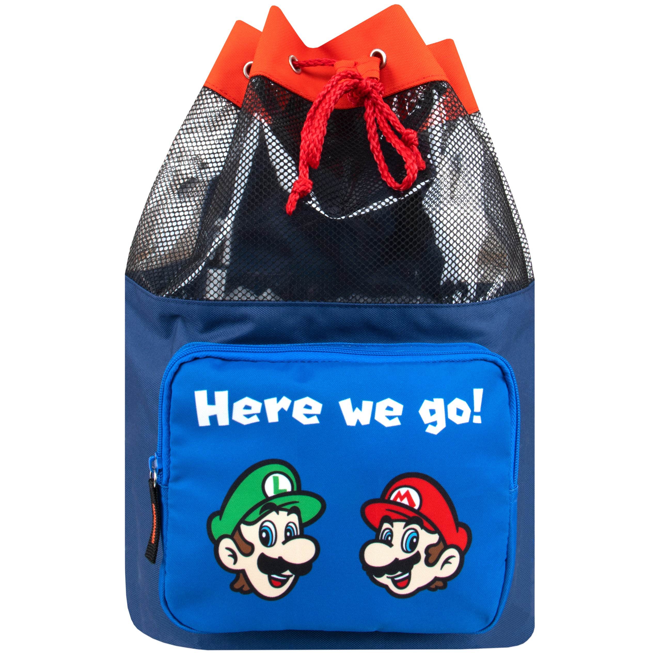 This Super Mario Swimming bag is perfect for carrying your little gamers swimming and summer items. Showcasing Luigi and Mario with the iconic he p"Here We Go!" on a dark blue background, it brings fun and functionality together. The red drawstring top on this rucksack adds a pop of Mario's colours. Get ready for summer adventures at the pool and beach with this cool, officially licensed bag!