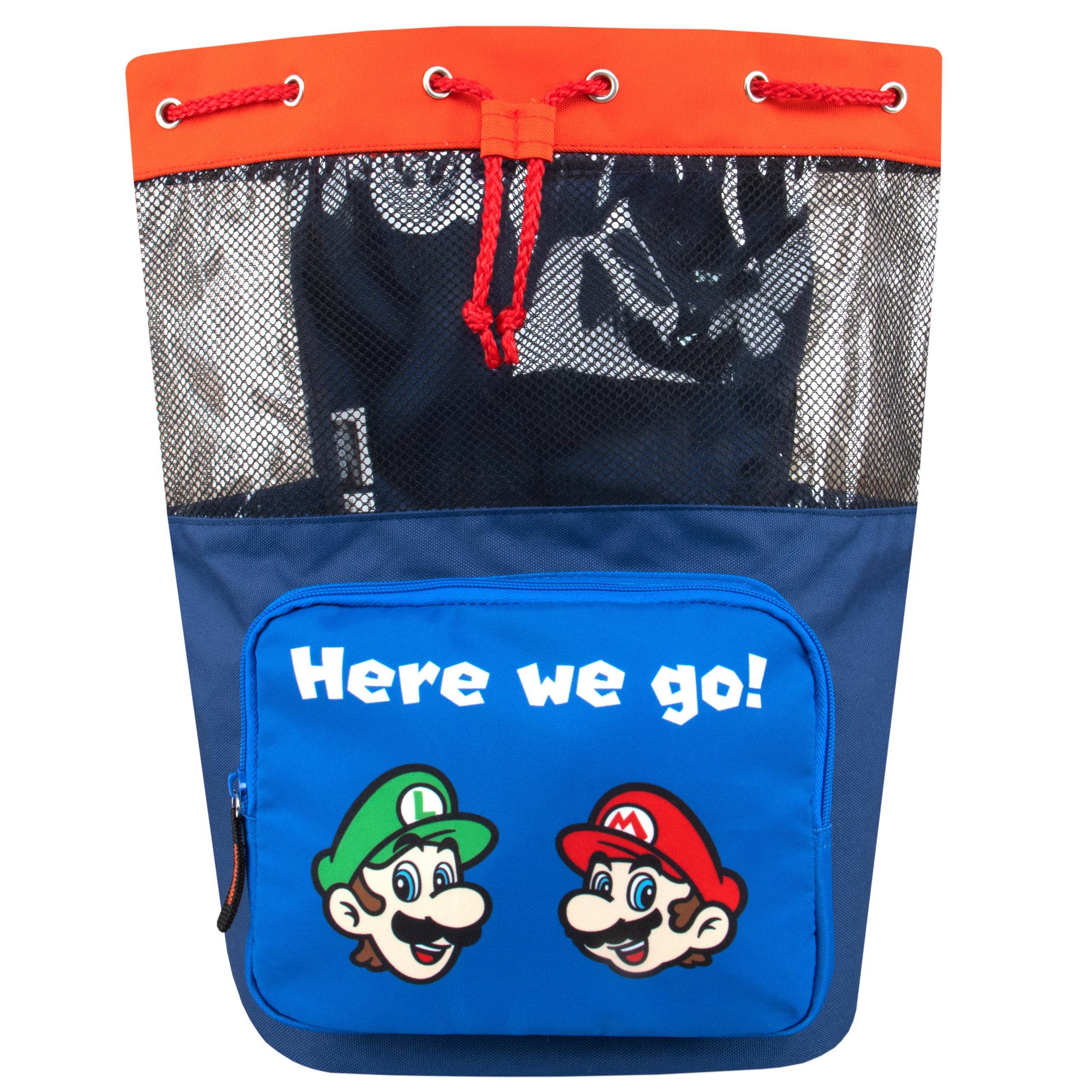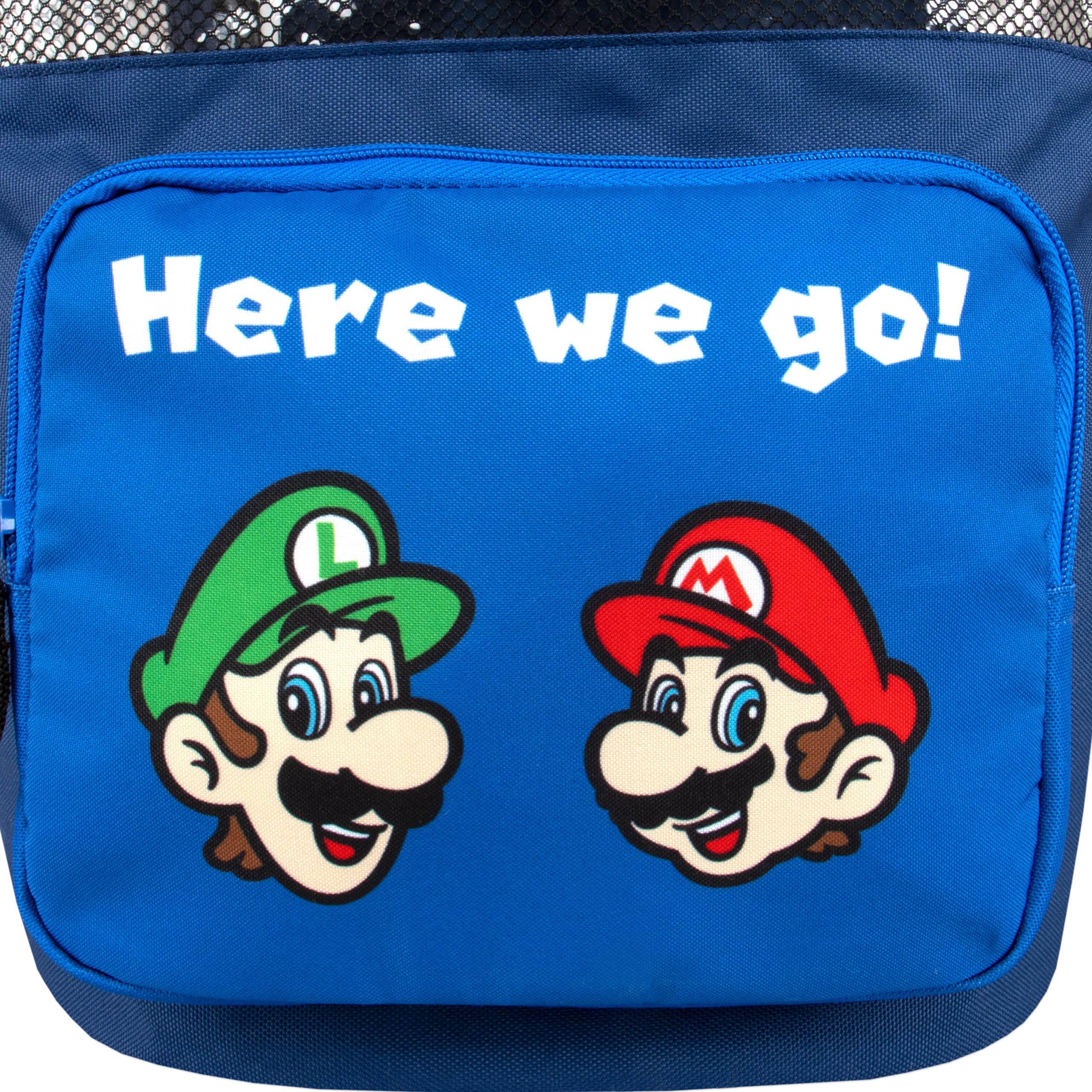 • Iconic Gaming Design: Featuring Luigi and Mario's faces with the words "Here We Go!" on a dark blue background, this swim bag embodies the classic Super Mario Games