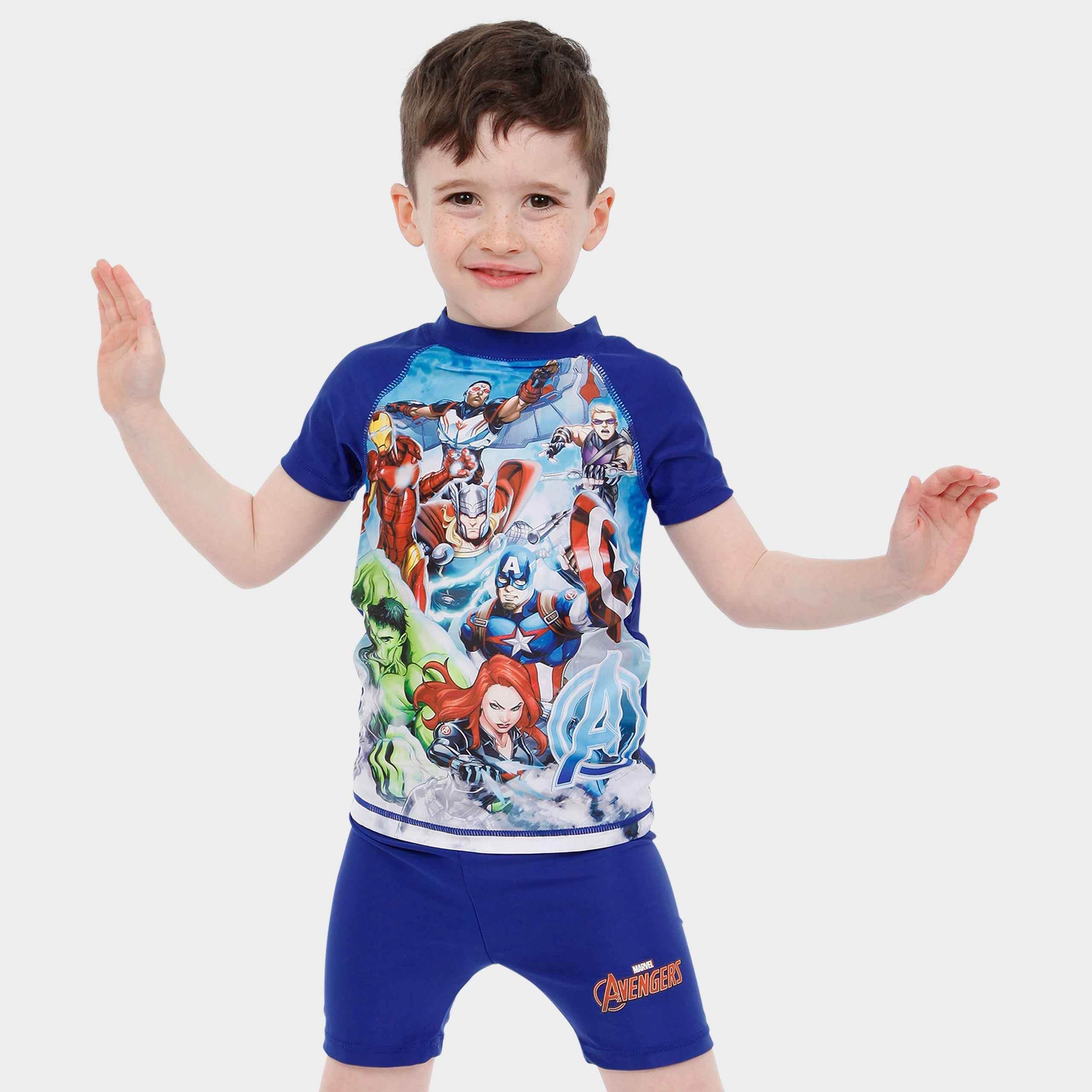 Get your little Avenger in training the coolest look for these holidays with this Marvel-ous two piece swim set. It features the Hulk, Black Widow, Captain America, Thor, Iron Man, Hawkeye and Falcon on a vibrant and eye-catching comic style print. These heroic Avengers bathers come with elasticated shorts complete with the Avengers logo. A summer of adventures awaits!