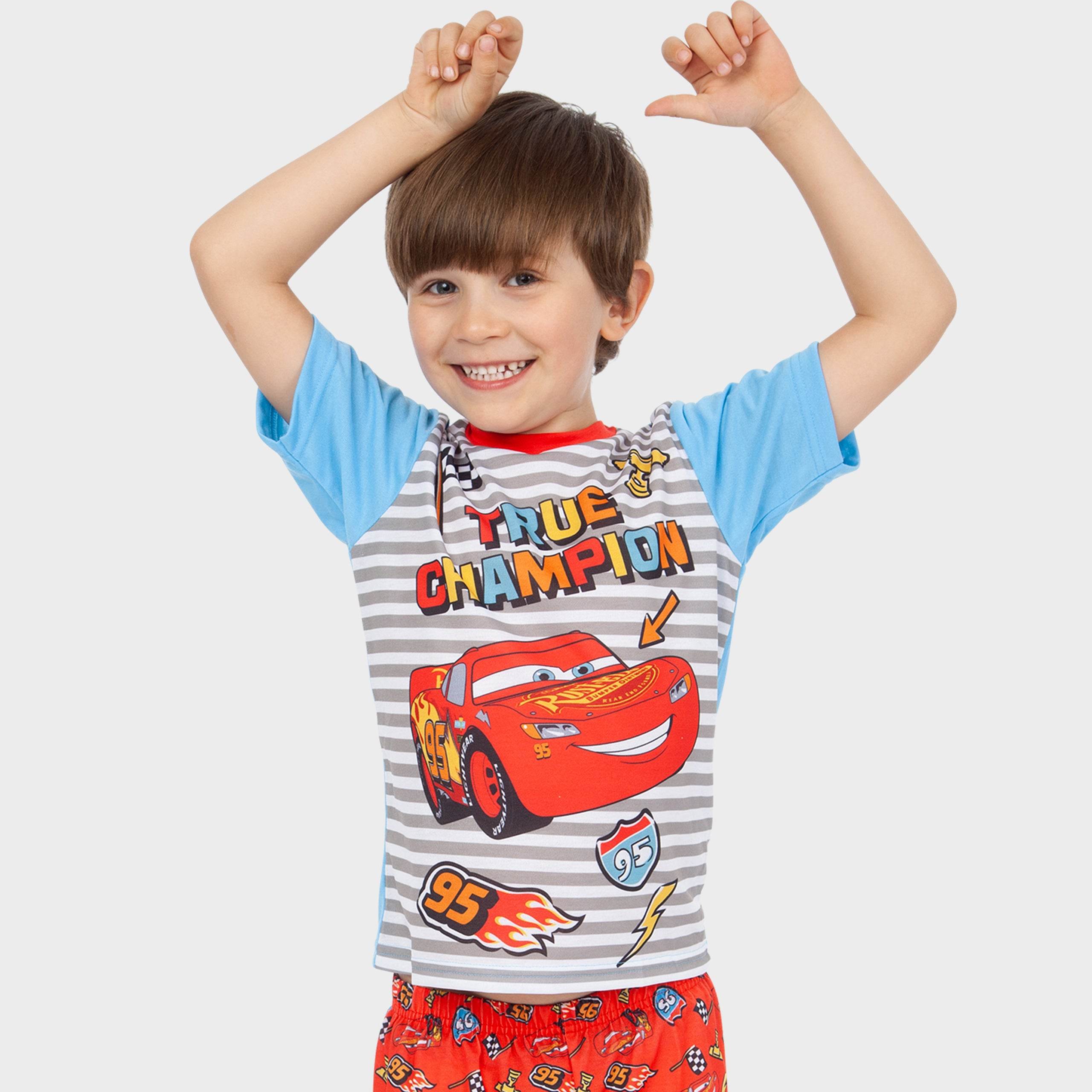 Dream of racing around Radiator Springs in this adorable Disney Cars pyjama set! These colourful PJs feature a print of Lightning McQueen on a striped background with 'True Champion' written above. Paired with red shorts showcasing an all-over print of lightning McQueen with racing flags, lightning bolts, and trophies! Make sure to make a pit stop for these jammies before racing into bedtime!