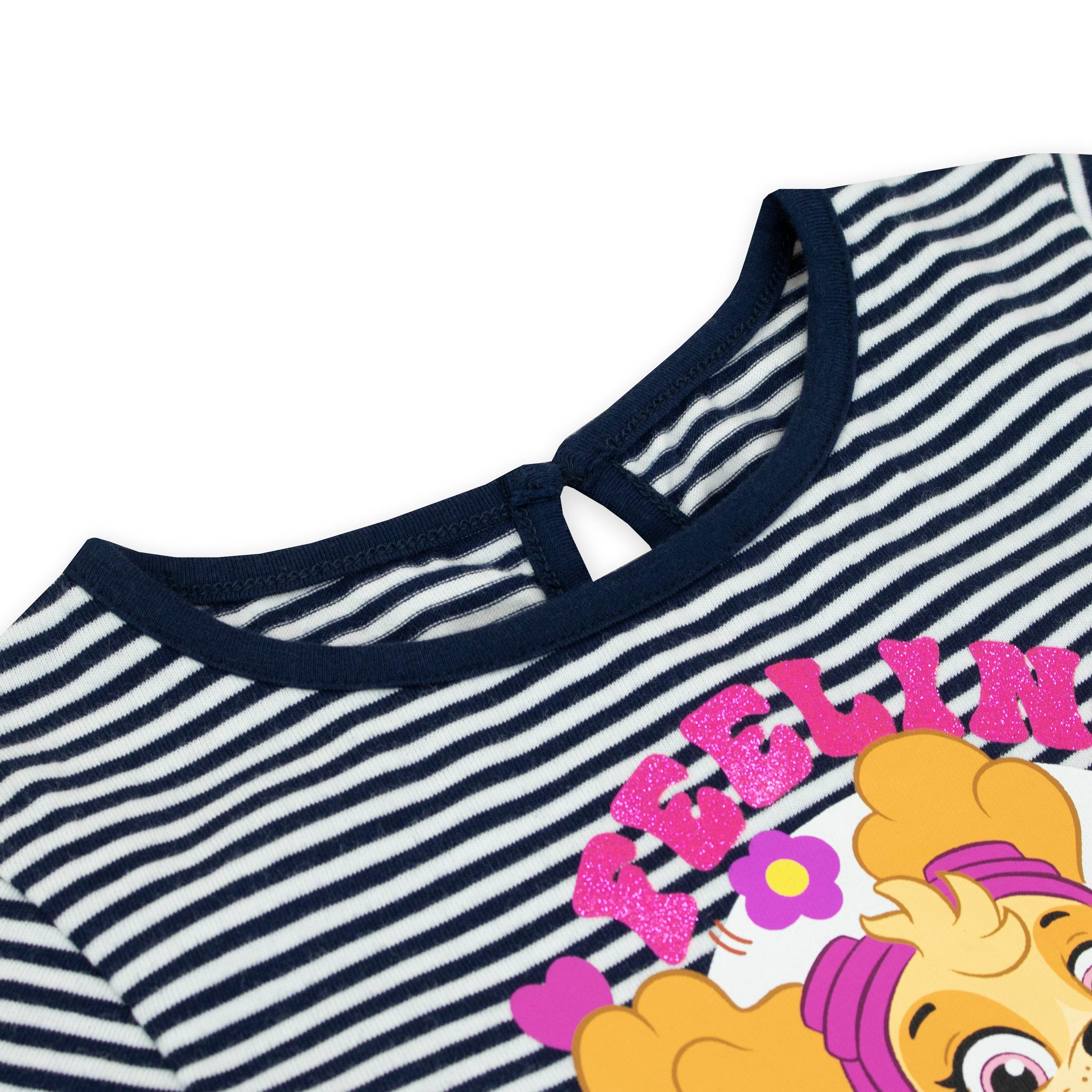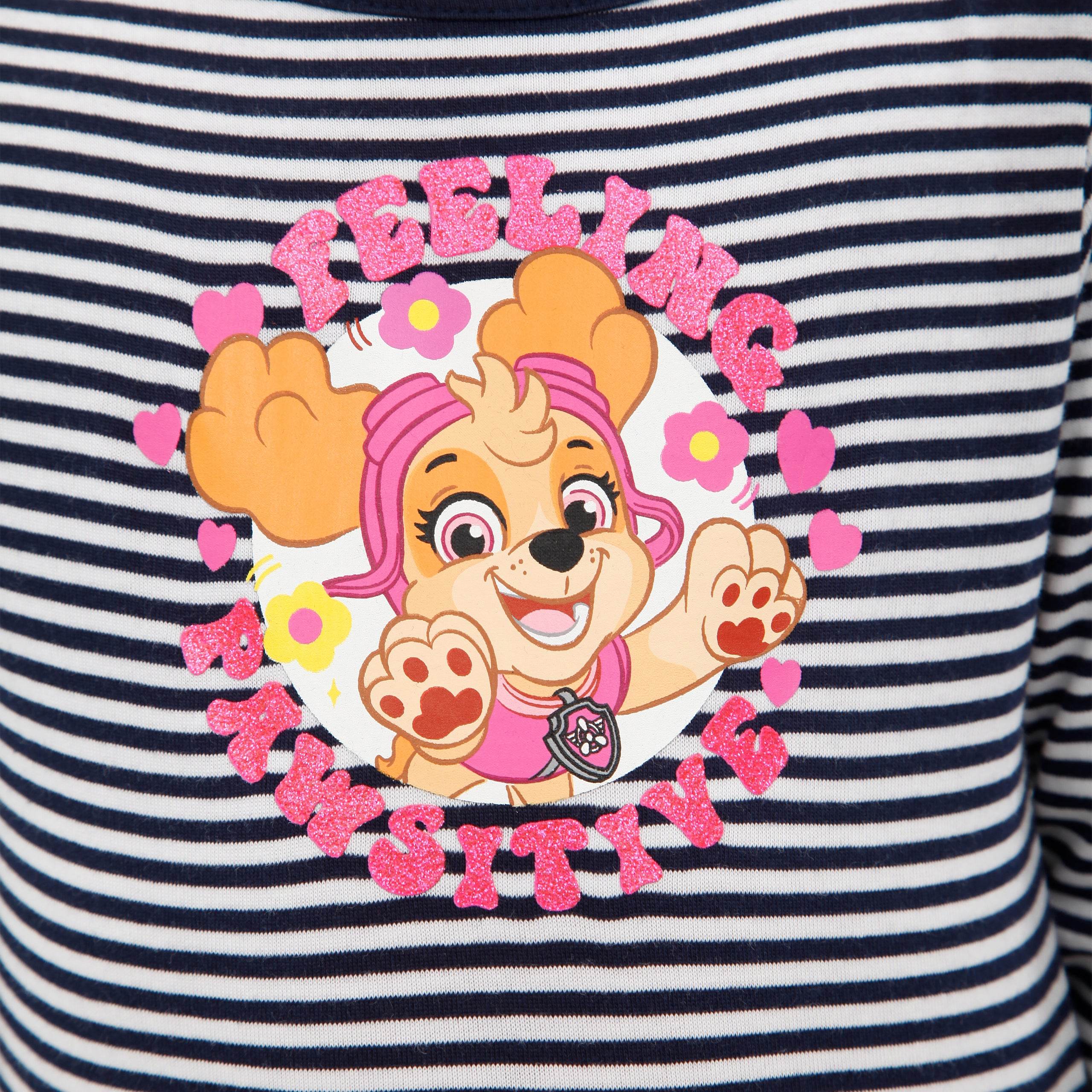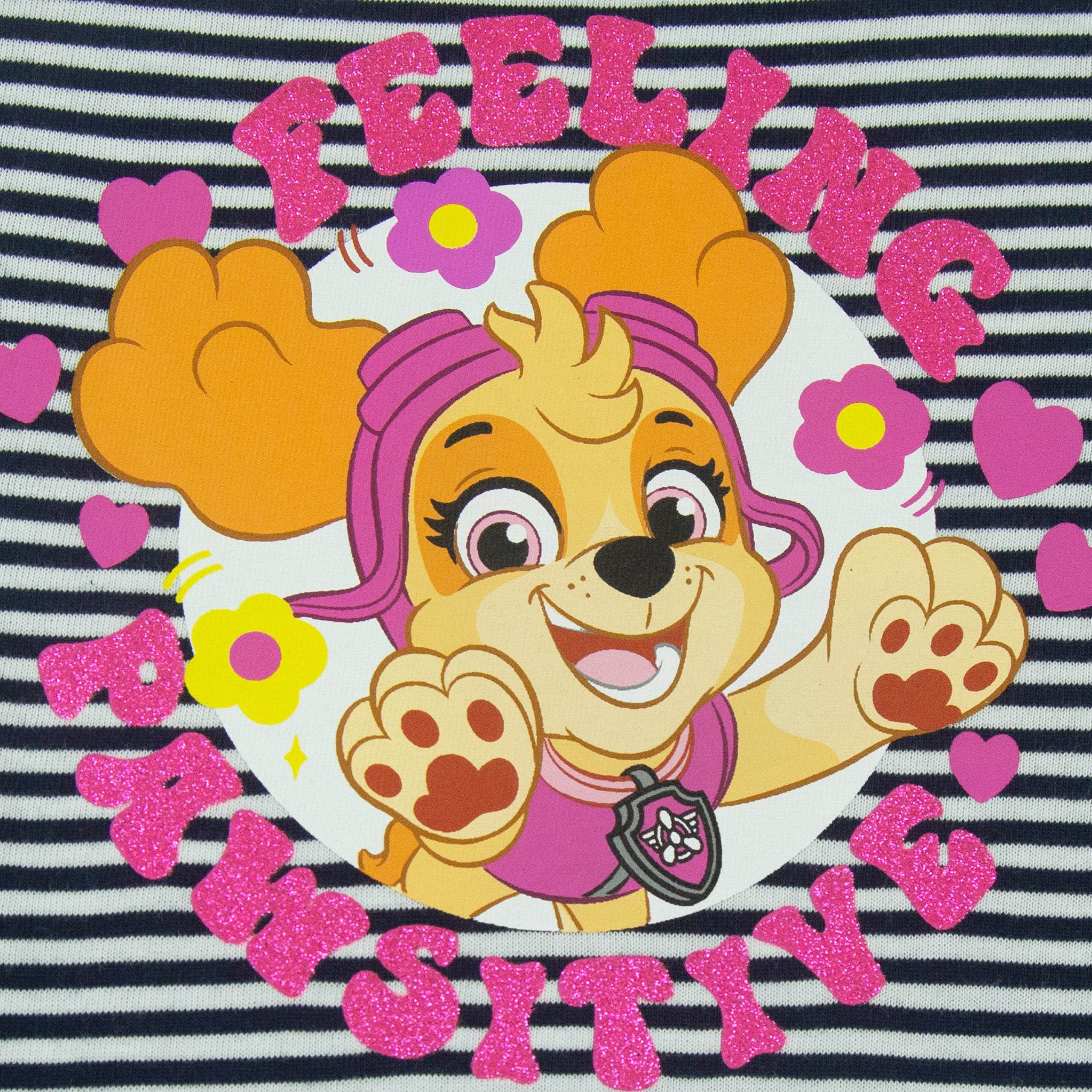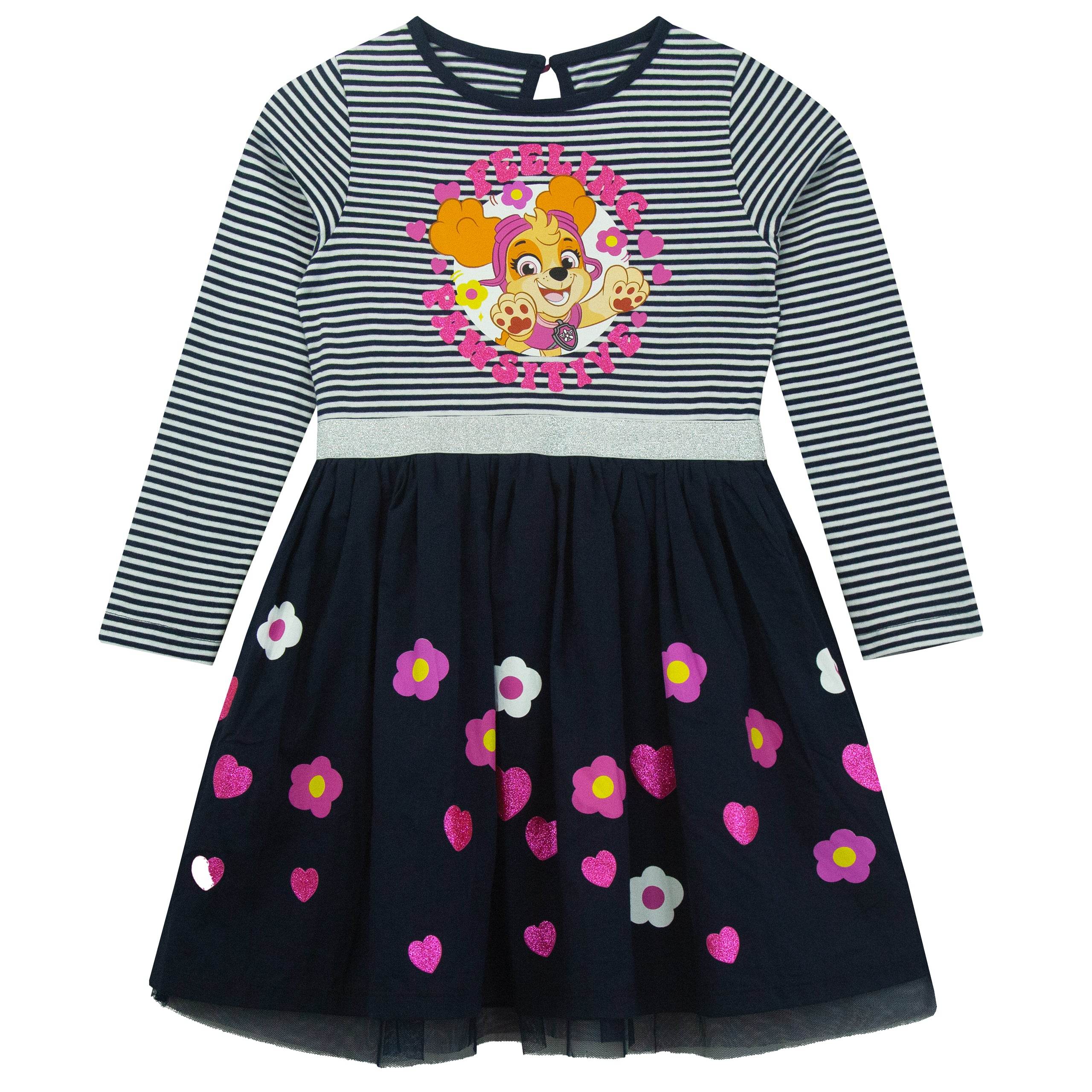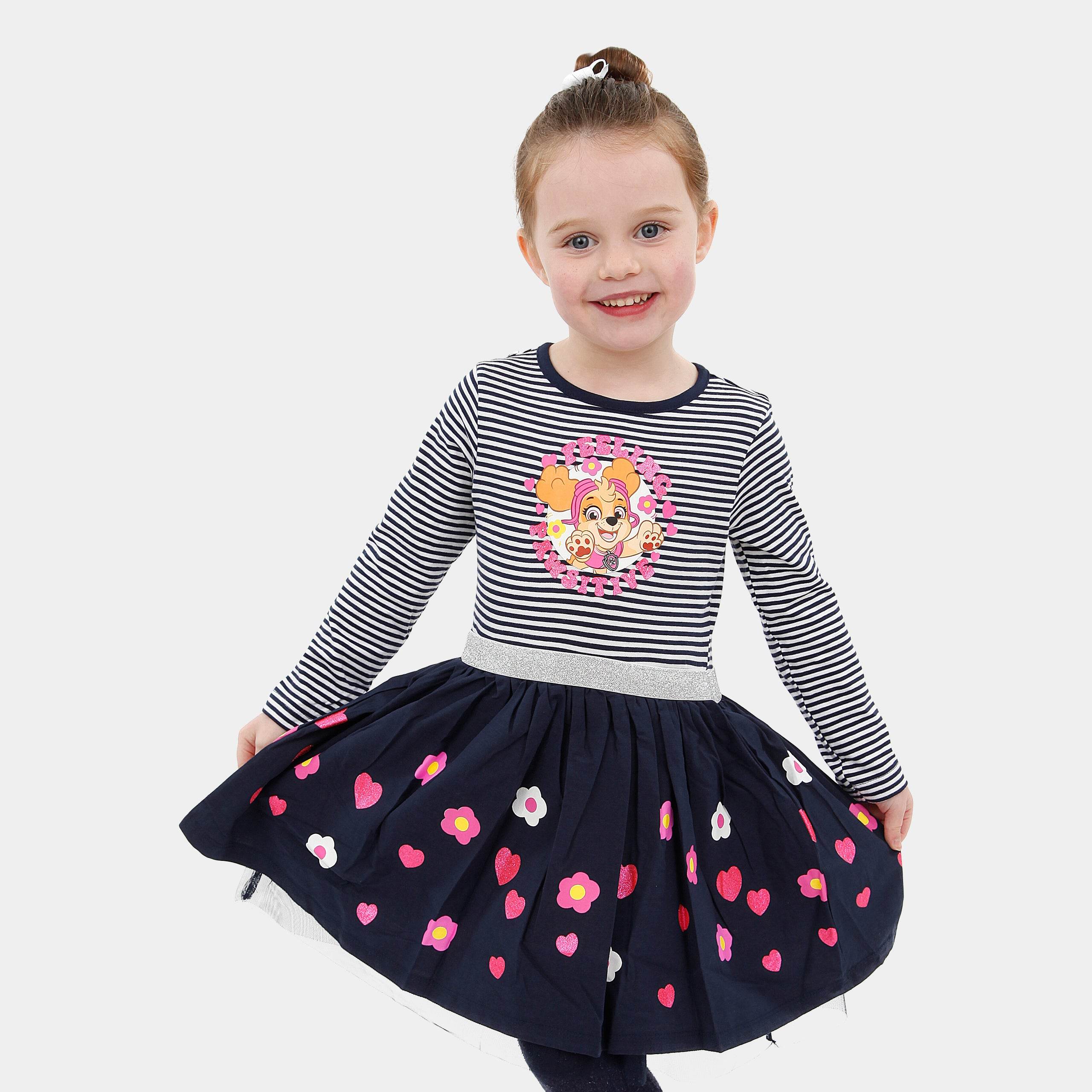 Discover the perfect blend of fun and fashion with our Paw Patrol Party Dress for girls! Featuring Skye playfully set amongst bright flowers and the sparkling message "Feeling Pawsitive". A striped top pairs beautifully with a floral navy skirt, brought together by a glitzy silver waistband. Dress your little one in positivity and shine for that special occasion in this girls dress!