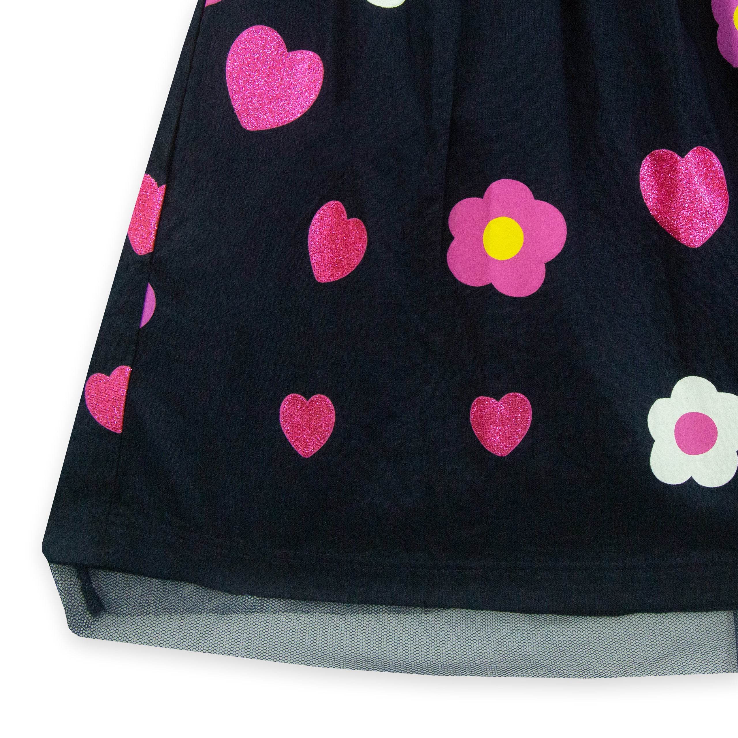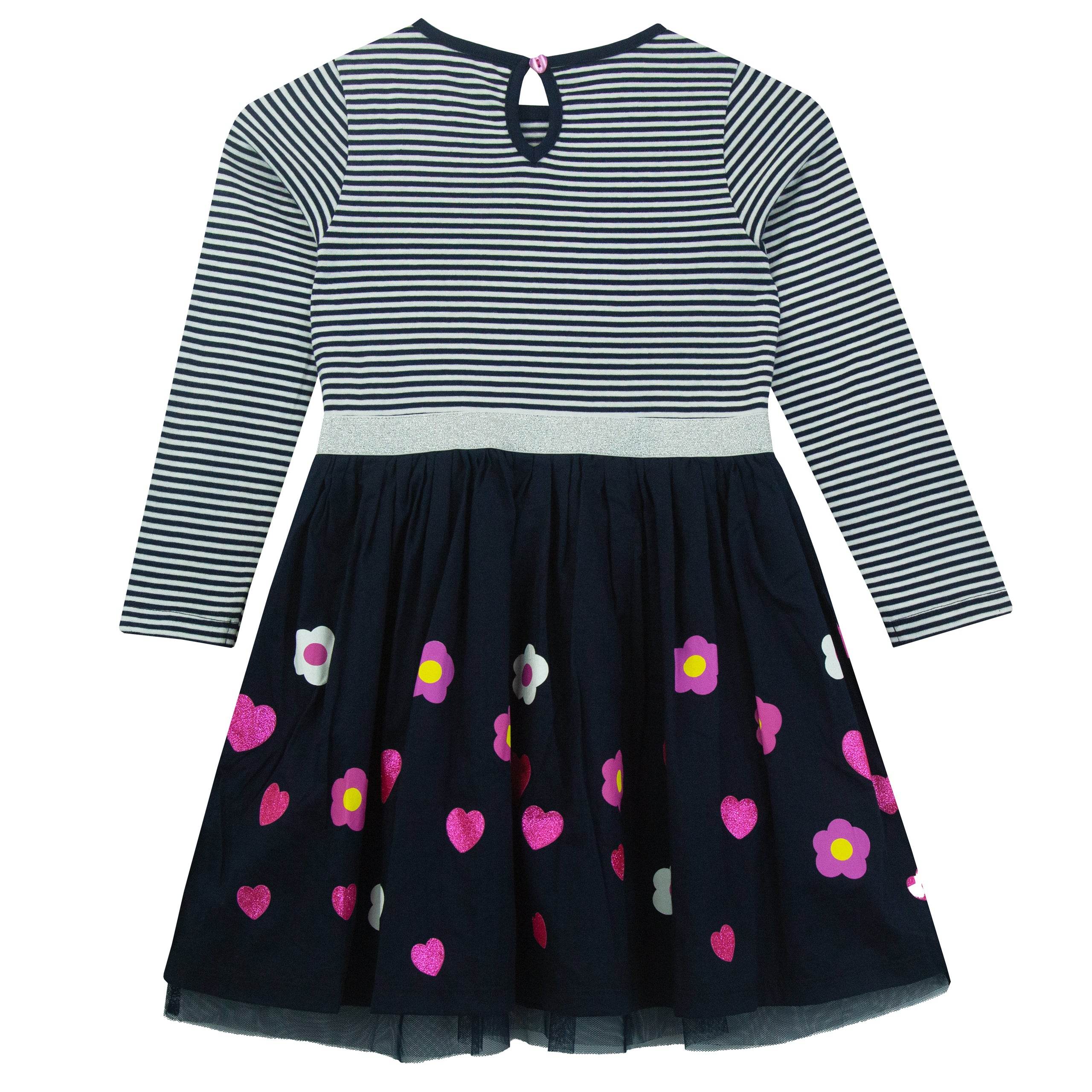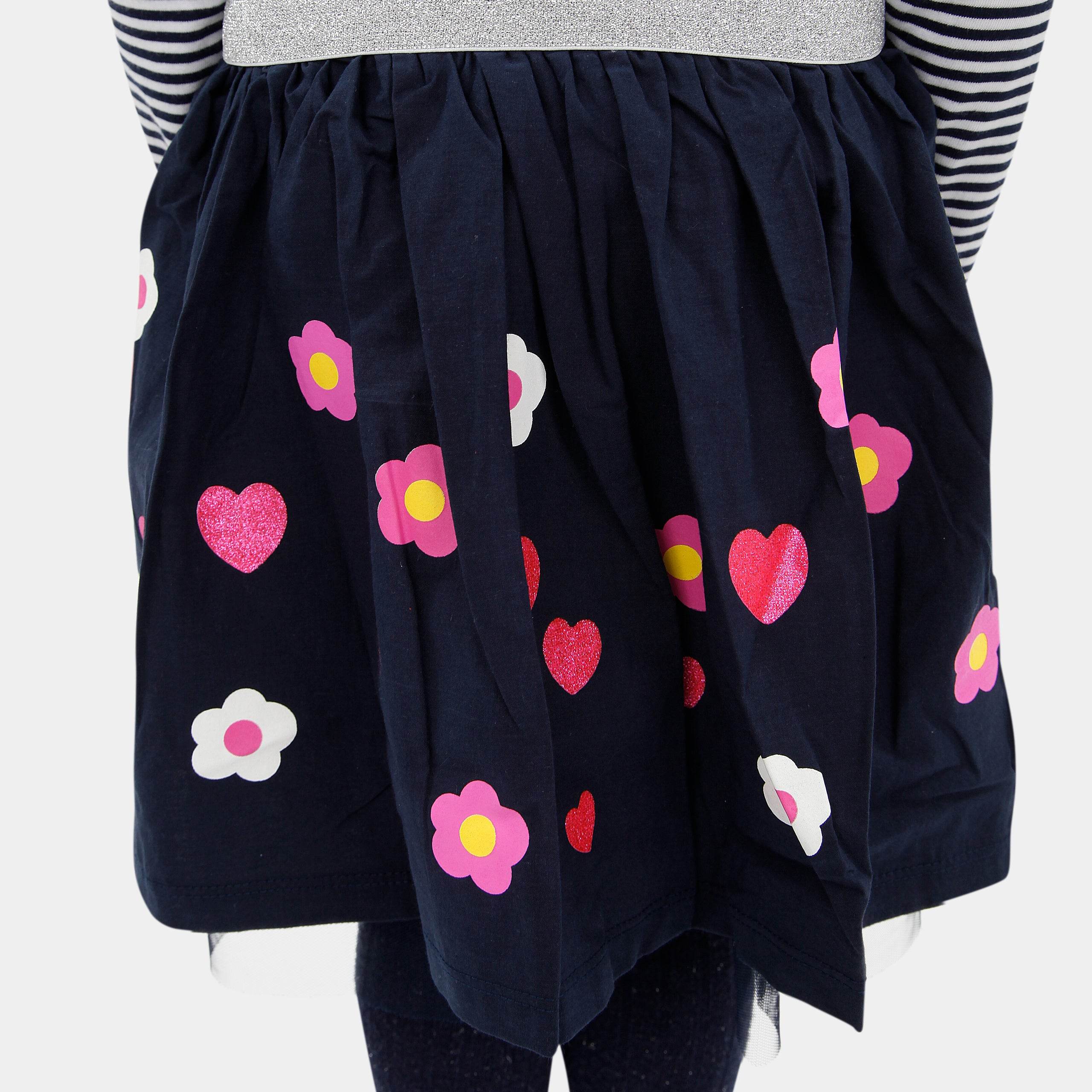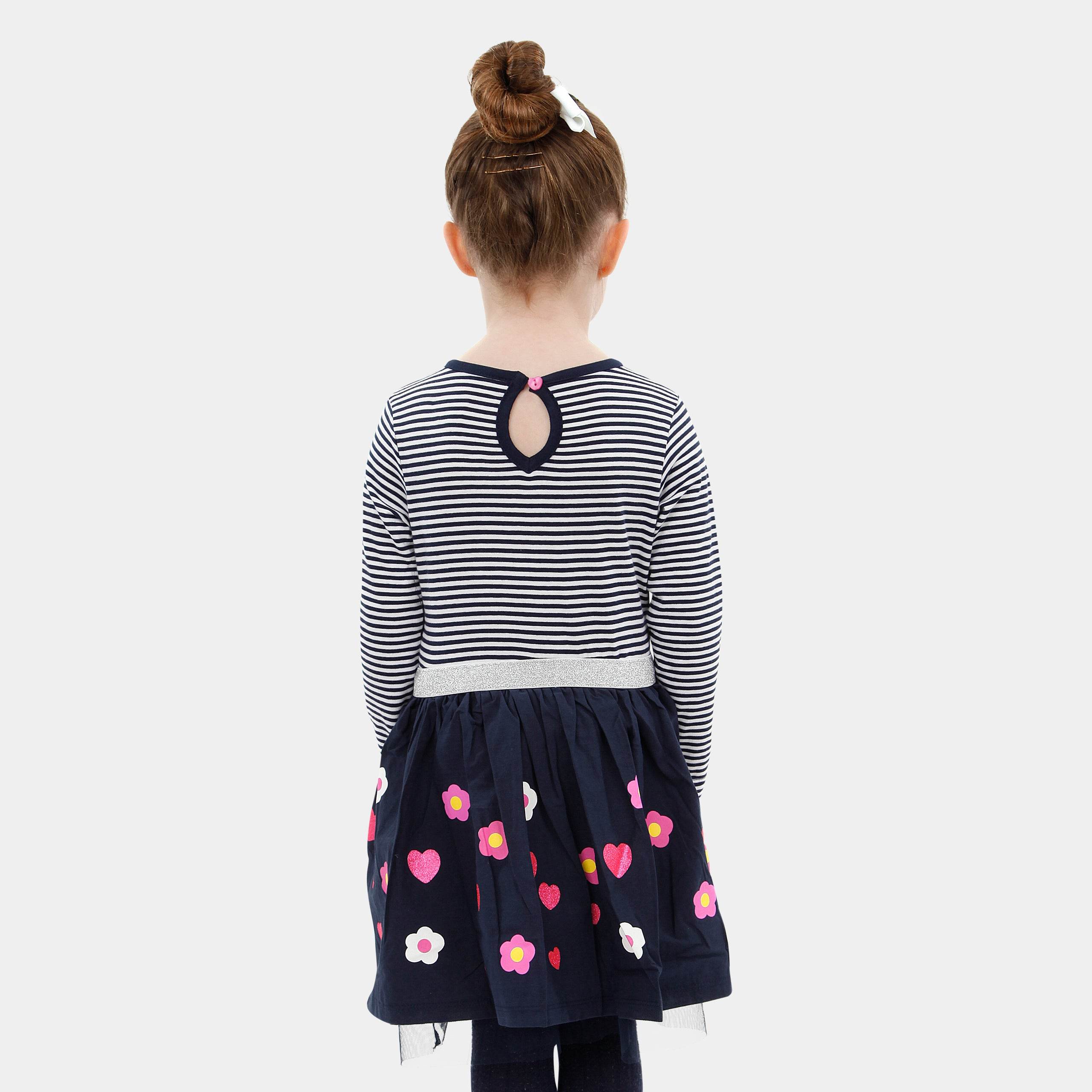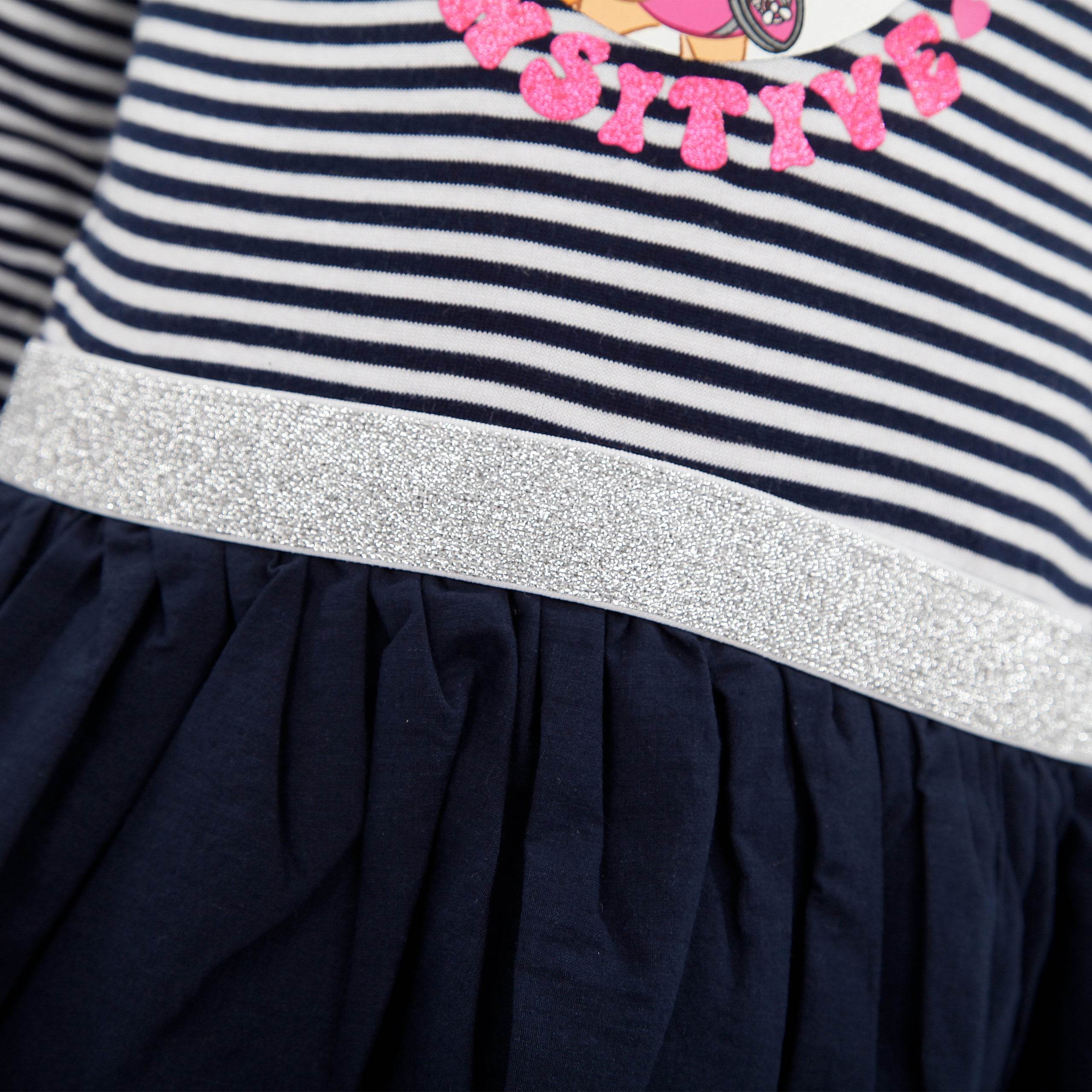 Discover the perfect blend of fun and fashion with our Paw Patrol Party Dress for girls! Featuring Skye playfully set amongst bright flowers and the sparkling message "Feeling Pawsitive". A striped top pairs beautifully with a floral navy skirt, brought together by a glitzy silver waistband. Dress your little one in positivity and shine for that special occasion in this girls dress!