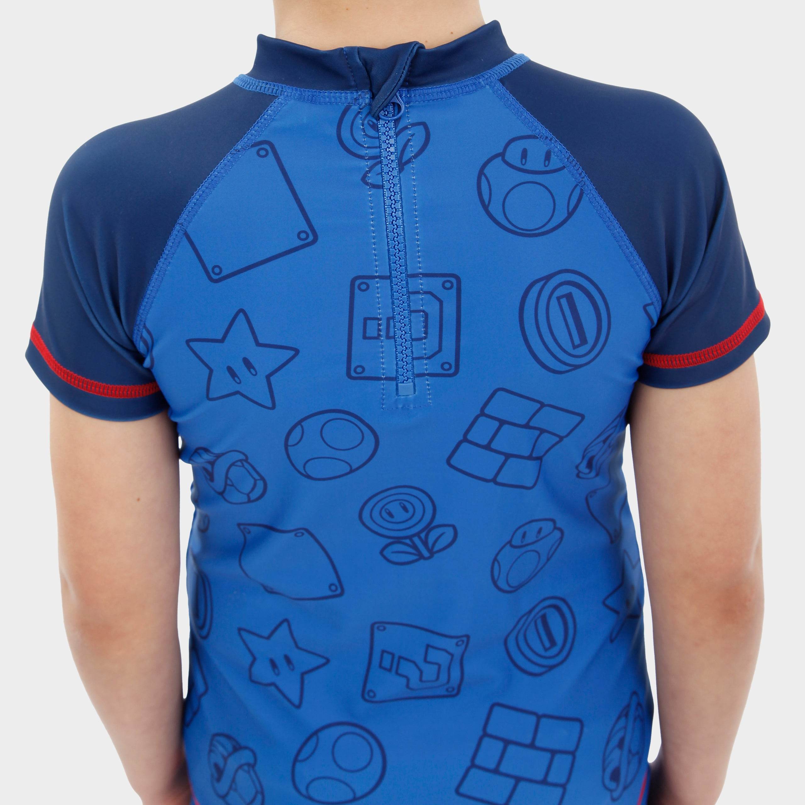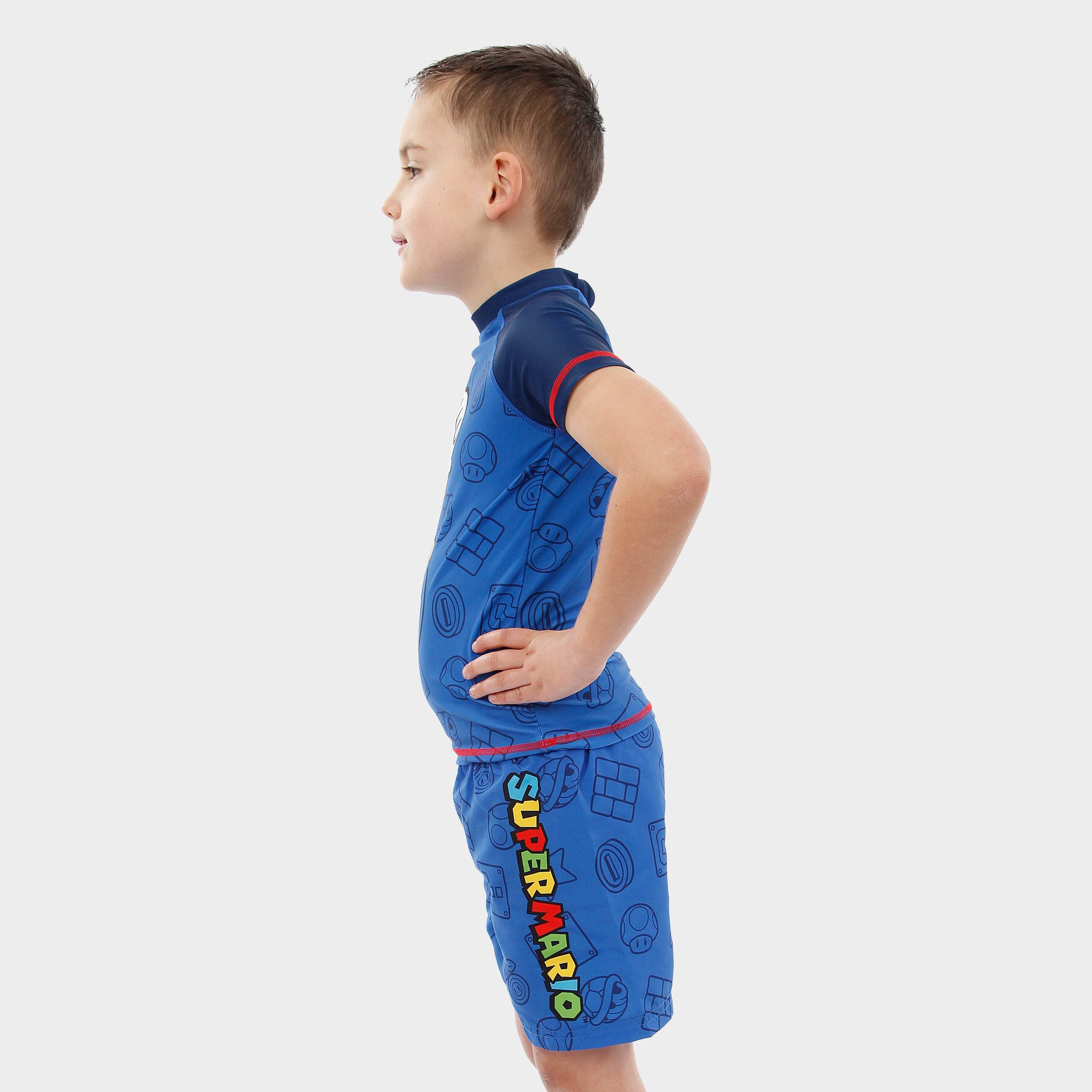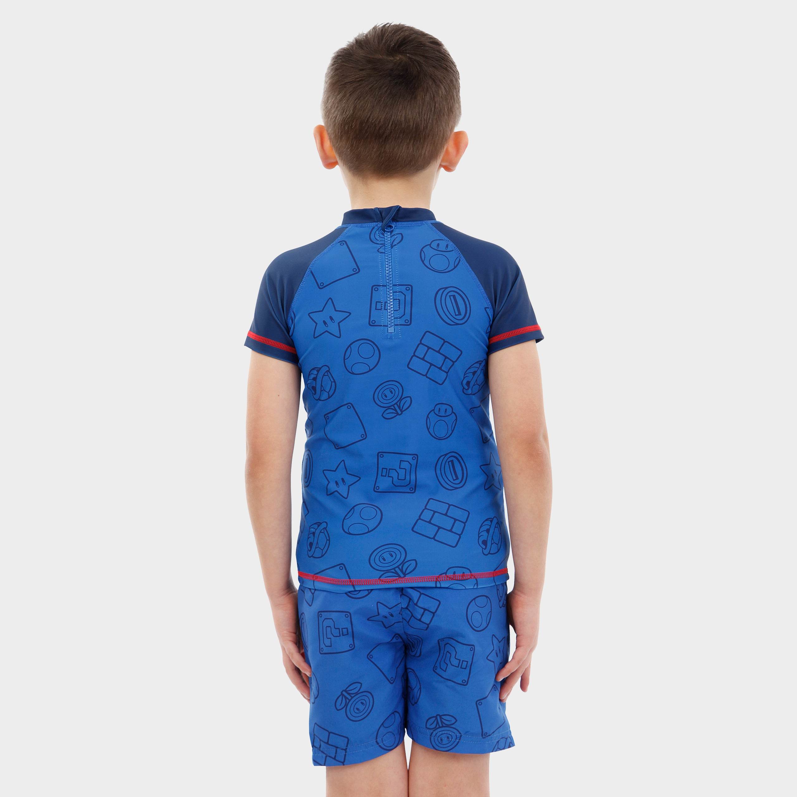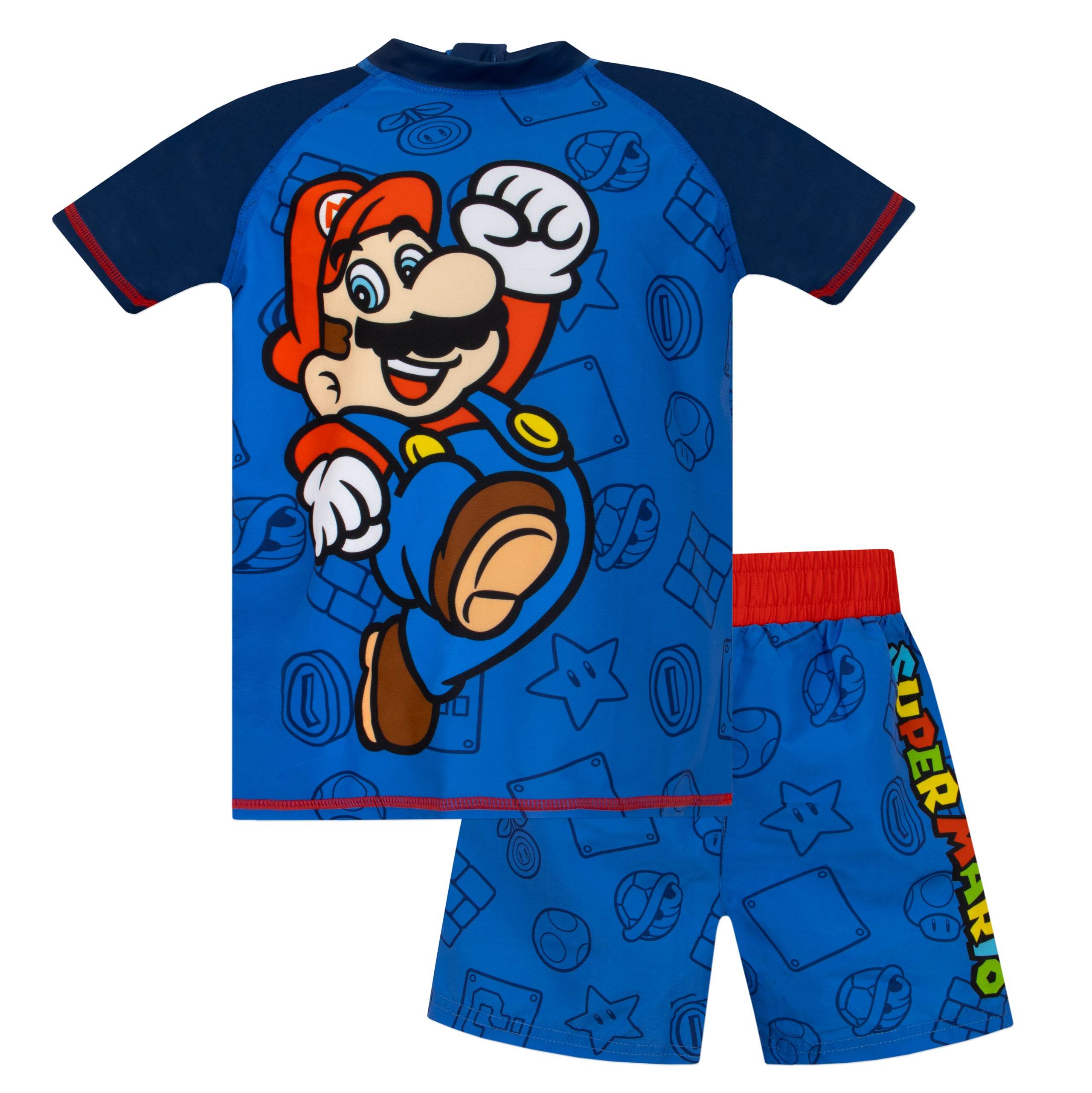 This fun Boys Super Mario Swim set is perfect for young fans of the iconic game. This swimming set includes a swim top with Mario in his famous pose, set against a background of game items like Coins, Stars, and Shells. Complementing the top are matching swimming trunks that showcase the same pattern, along with the Super Mario logo in rainbow hues on the left leg. The striking red waistband on the shorts adds a bold touch, making this swim set a standout choice for any poolside or beach adventure.