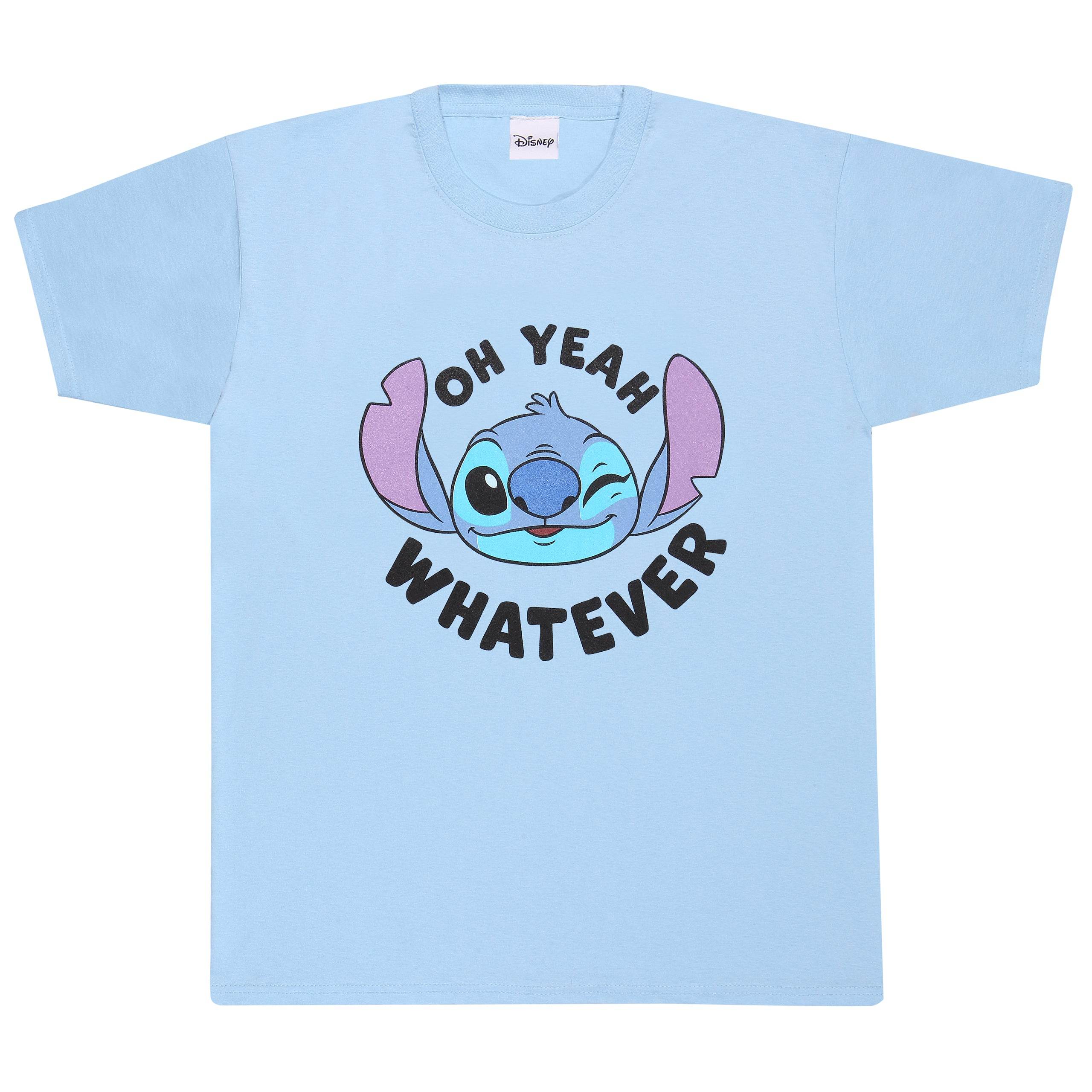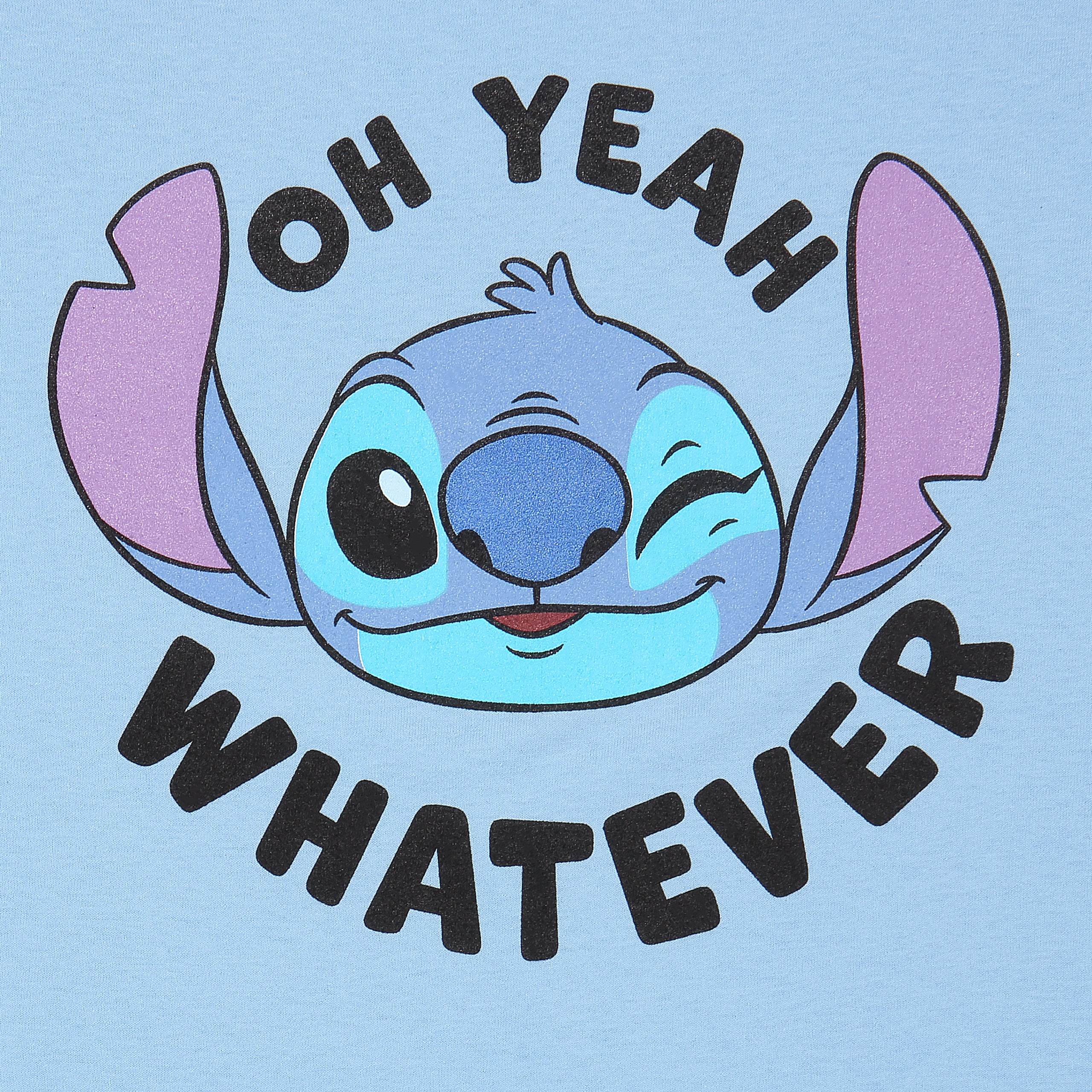 • Lively Stitch Design: This blue, short-sleeved women's Lilo and Stitch tshirt features your favourite character, Stitch, at the centre, along with a playful 'Oh Yeah Whatever' slogan in bold black font.