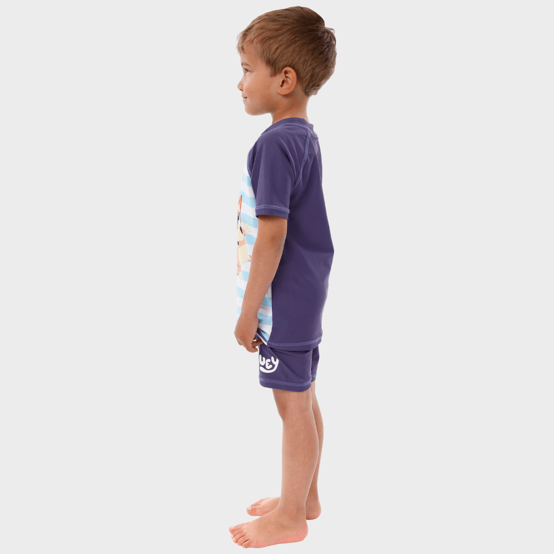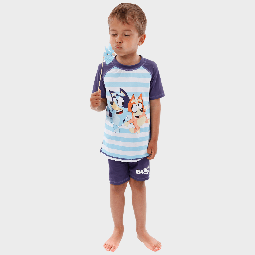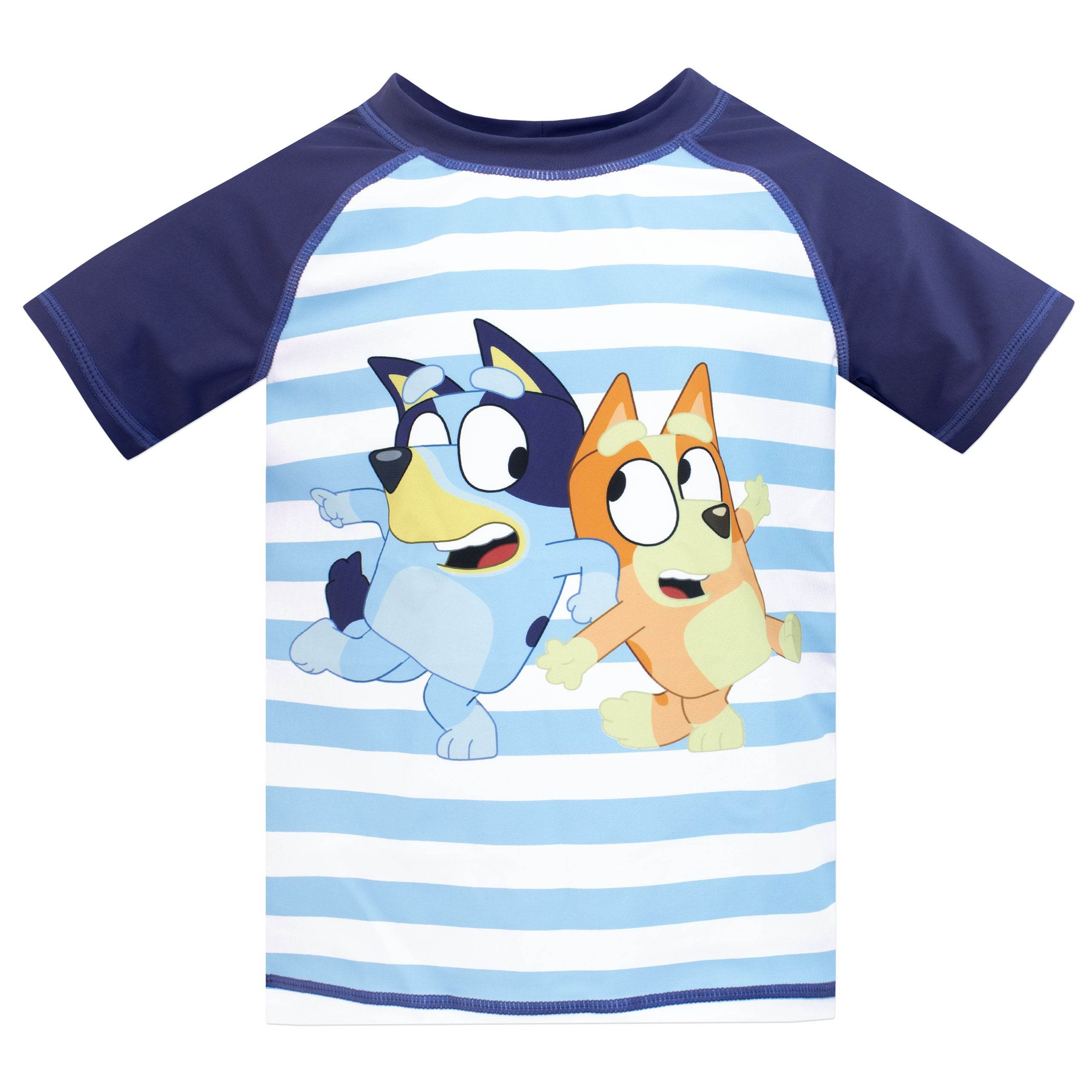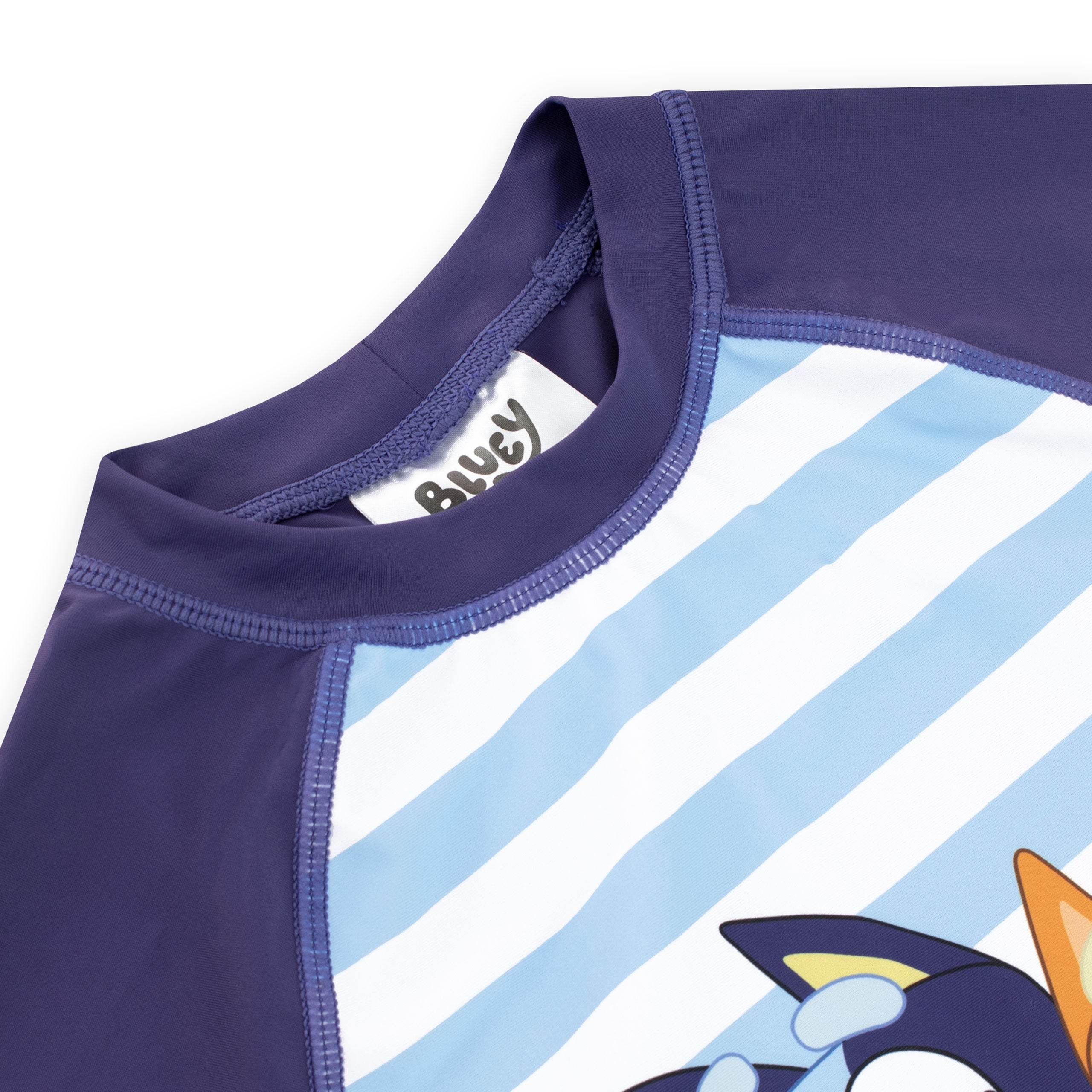 • Be Cool like Bluey: The Rash Guard Top Showcases Short Raglan Sleeves, Stripes, and Comes Paired With Swim Shorts Featuring the Awesome Bluey Logo on the Leg