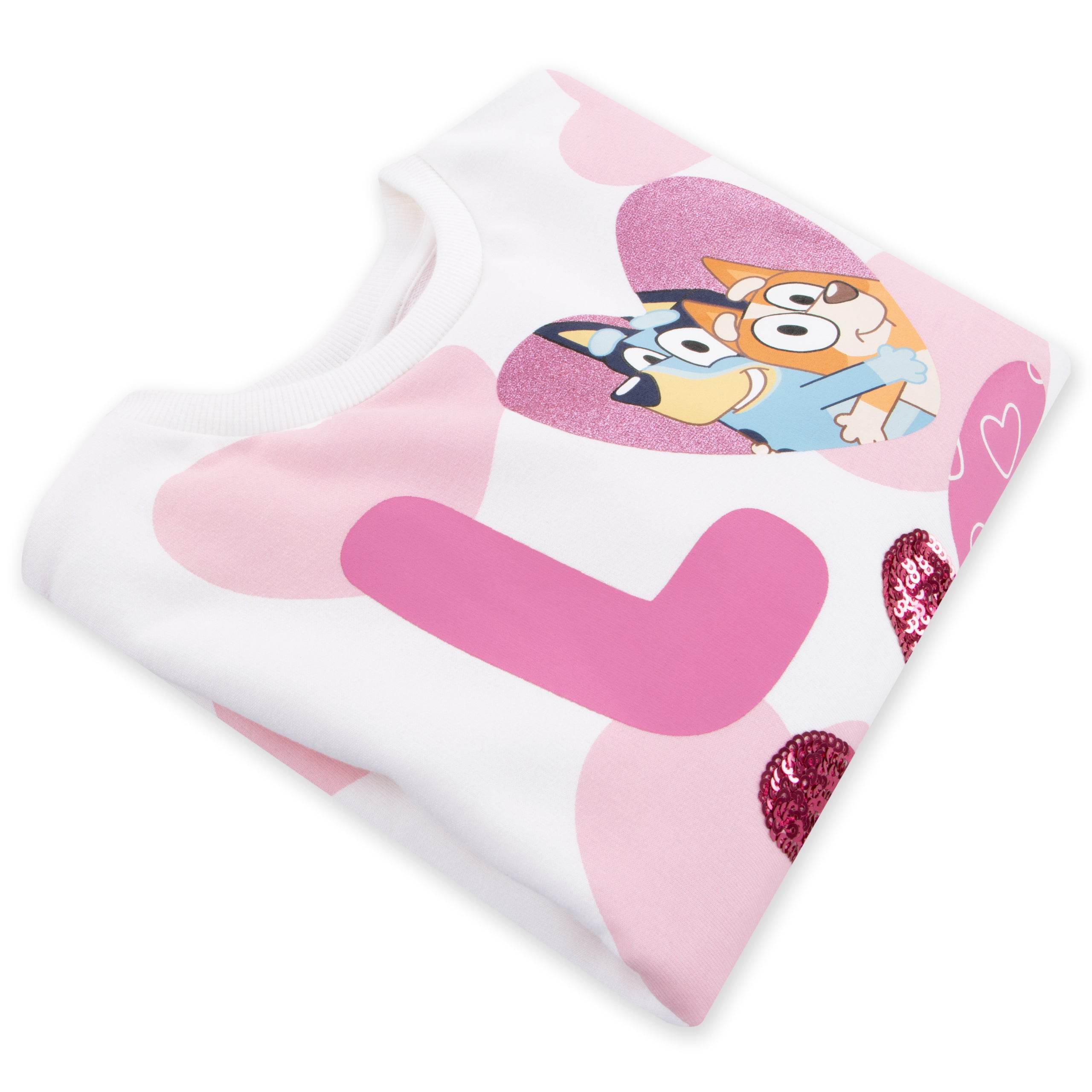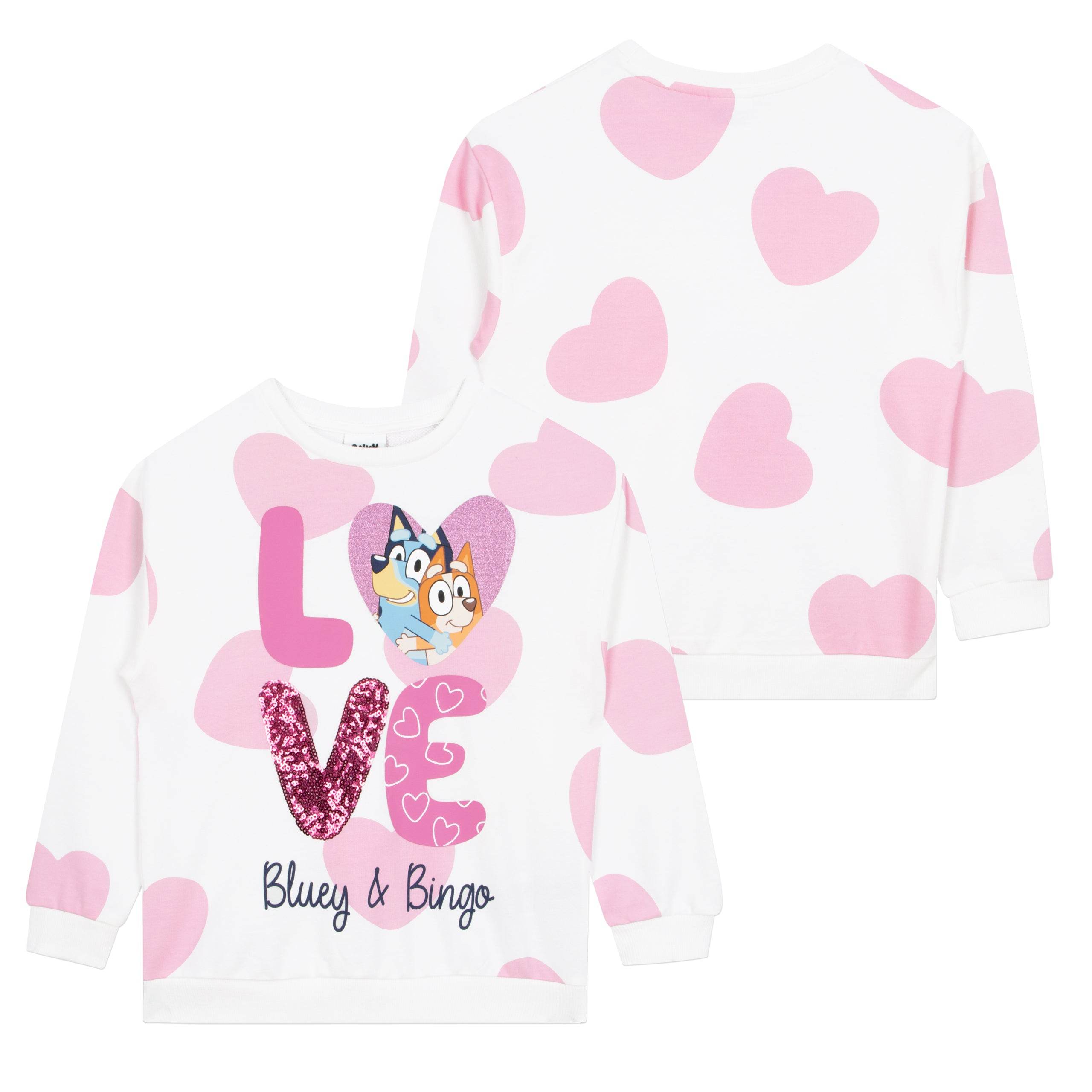 This officially licensed Bluey sweater is a cosy embrace from the beloved characters of the hit TV show. Crafted with 100% soft cotton and featuring a heartwarming graphic of Bluey and Bingo, this sweatshirt is perfect for keeping your little one warm during chilly days while also adding a sprinkle of magic with glitter or sequin accents. Let your child's love for Bluey shine bright as they spread joy and warmth wherever they go.