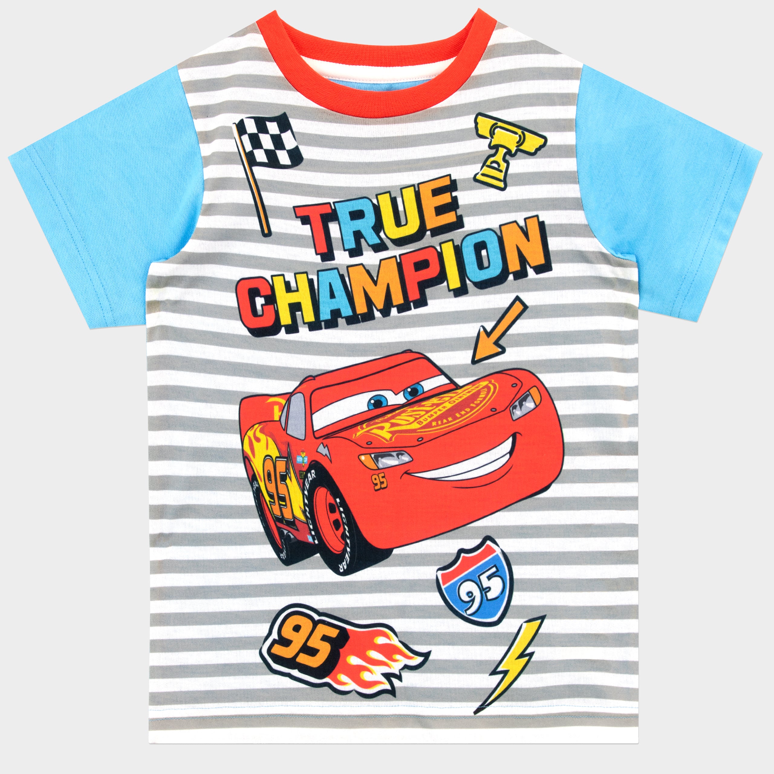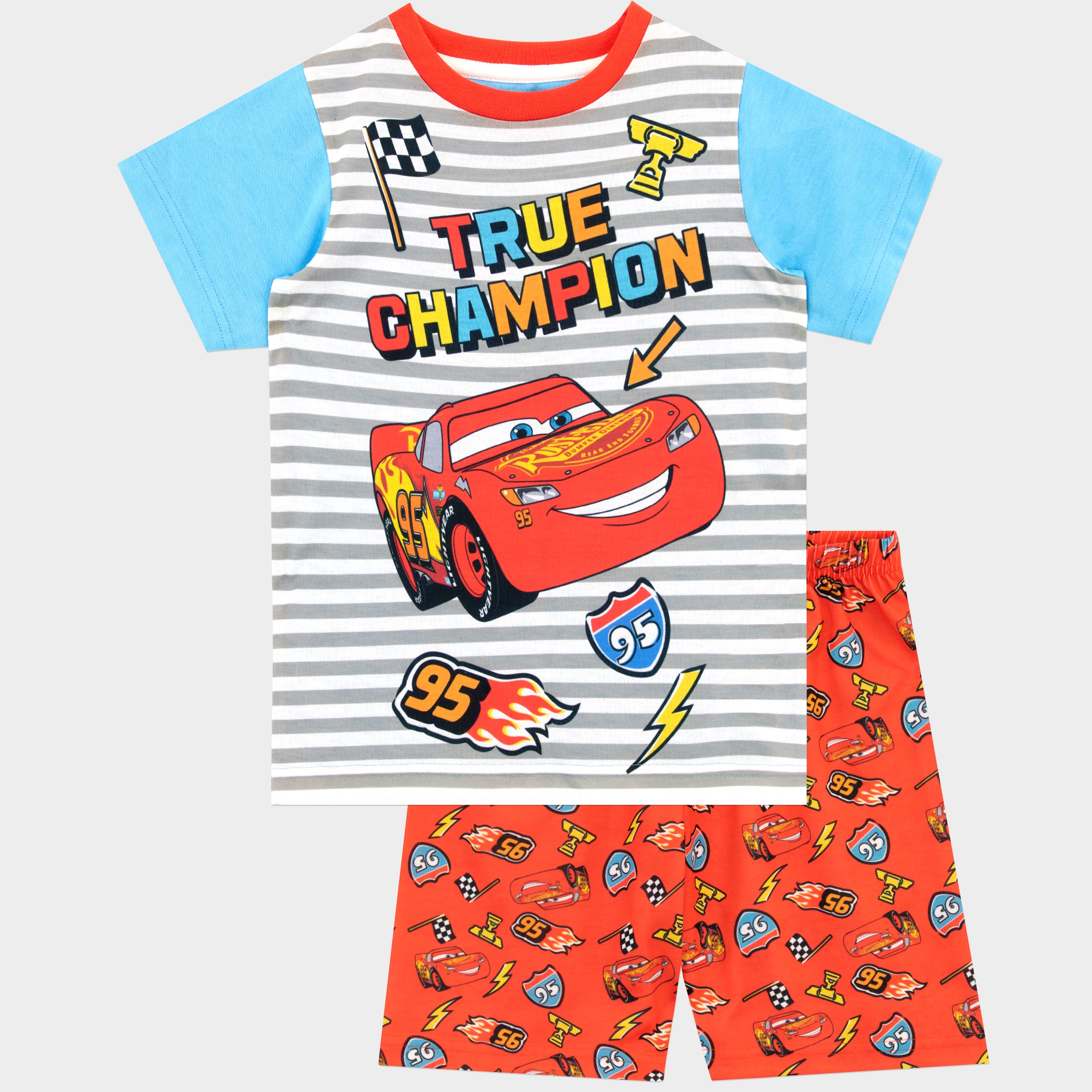 Dream of racing around Radiator Springs in this adorable Disney Cars pyjama set! These colourful PJs feature a print of Lightning McQueen on a striped background with 'True Champion' written above. Paired with red shorts showcasing an all-over print of lightning McQueen with racing flags, lightning bolts, and trophies! Make sure to make a pit stop for these jammies before racing into bedtime!