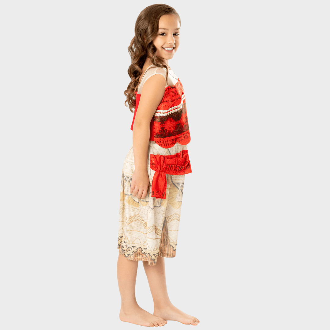 Capture your little voyager's adventurous spirit with this amazing Moana fancy dress costume! This pretty party dress resembles Moana's classic outfit, including a red fabric belt stitched onto the front of the skirt. The top part of the dress is sheer mesh with Moana's red top layered over, with a print of her special necklace that carries the heart of Te Fiti! The skirt is patterned just like Moana's, and has a red fabric belt stitched onto the front. Completing the outfit is a cute flower hair clip just like the flowers on Moana's island of Motunui! When the ocean calls to your little voyager, they'll love to dress up as their favourite Disney heroine with this charming Moana party dress!
