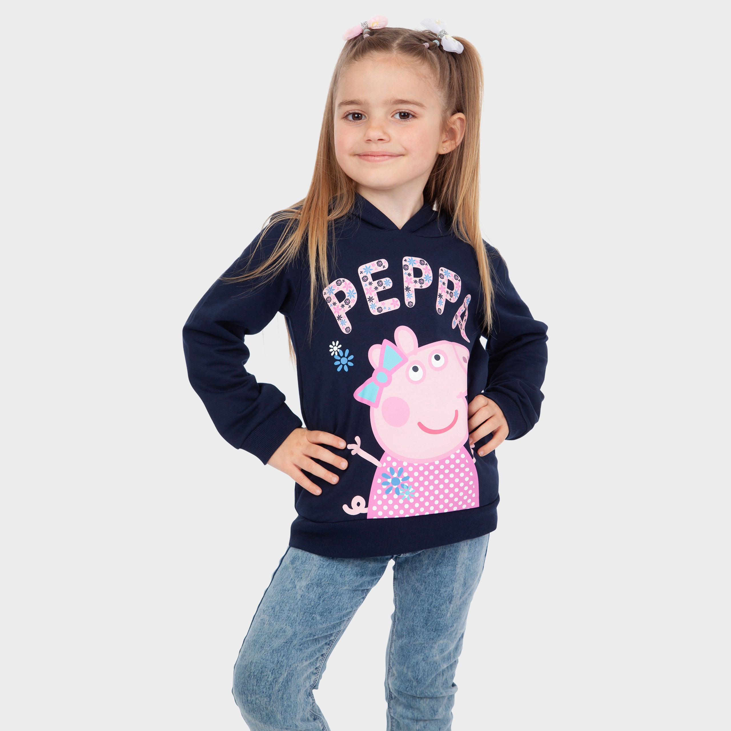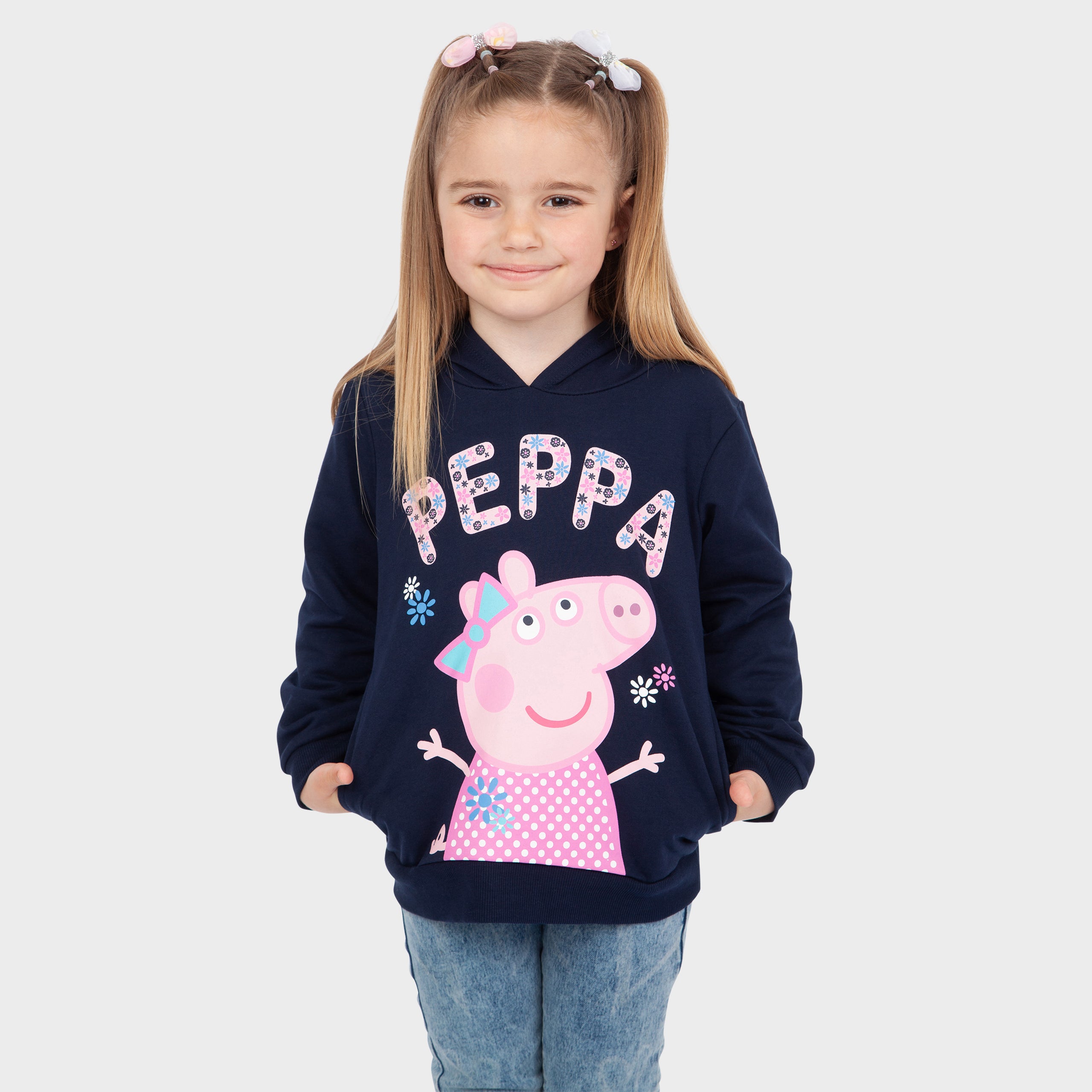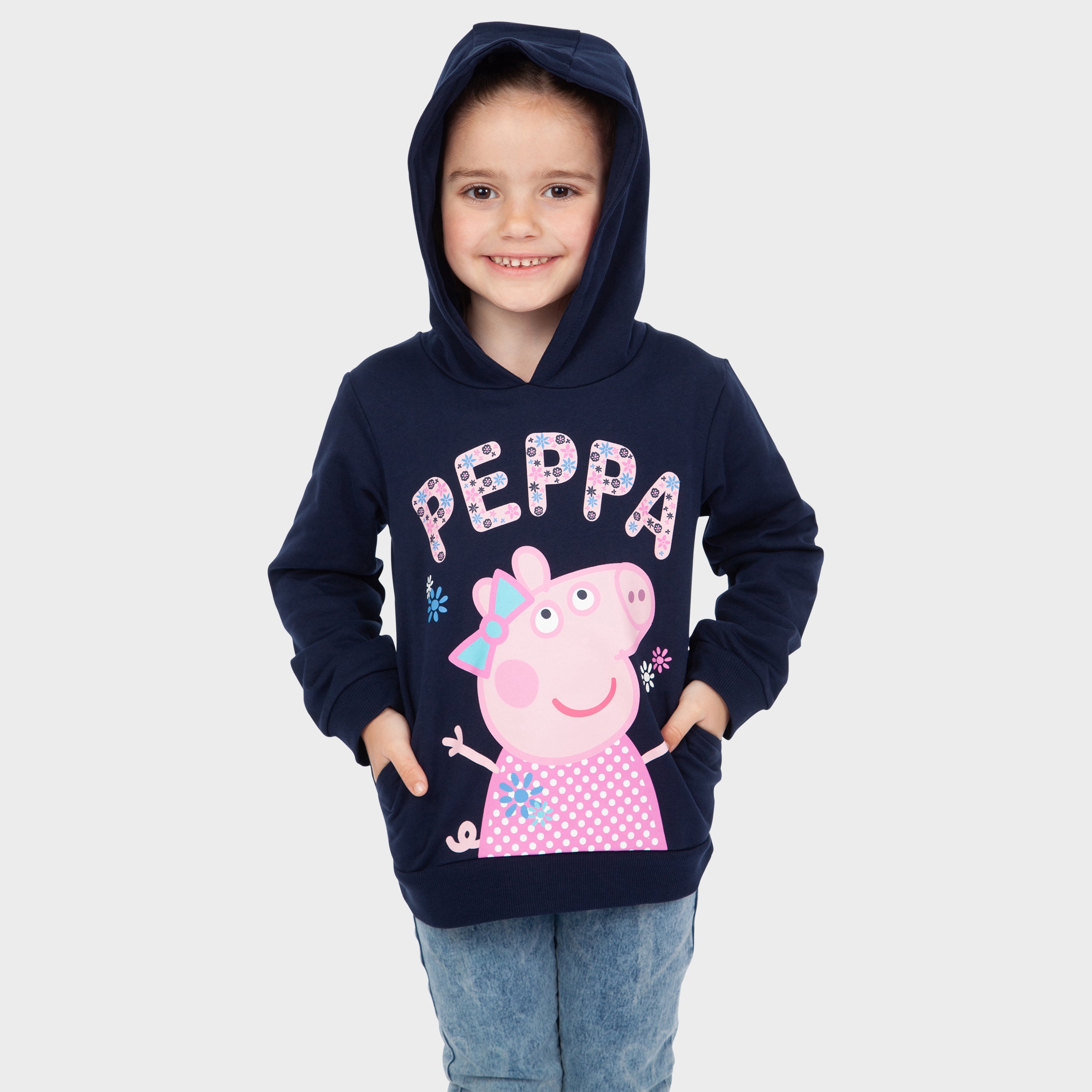 Any little Peppa Pig fan will love staying snug in this adorable navy Peppa Pig hoody! A cute sweatshirt that features a large print of the lovable piglet with her name in pink surrounded by flowery detailing. This comfy jumper is made of a high quality cotton blend and comes with a cosy hood and side pockets. Make going out look extra cute with this Peppa-tacular sweater!