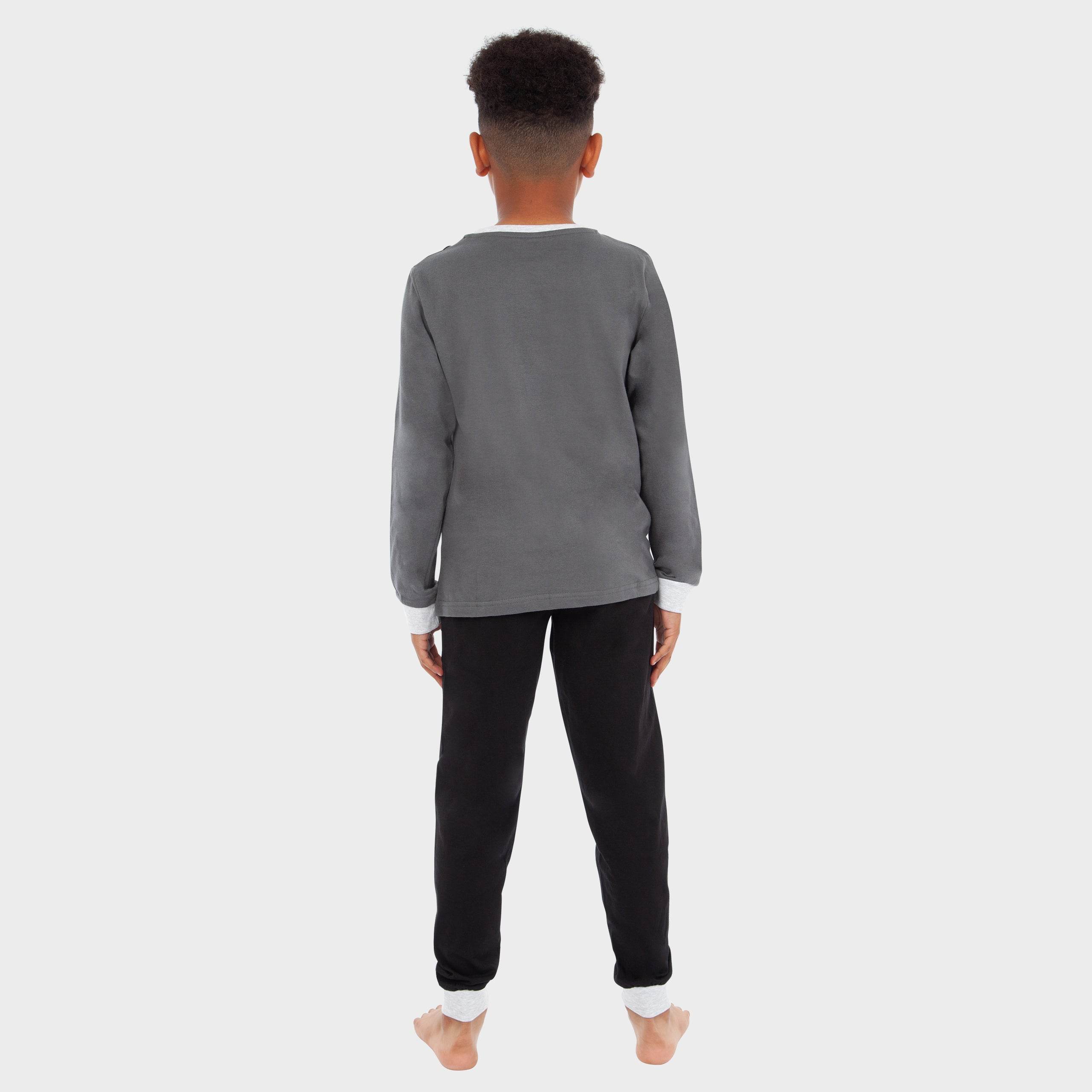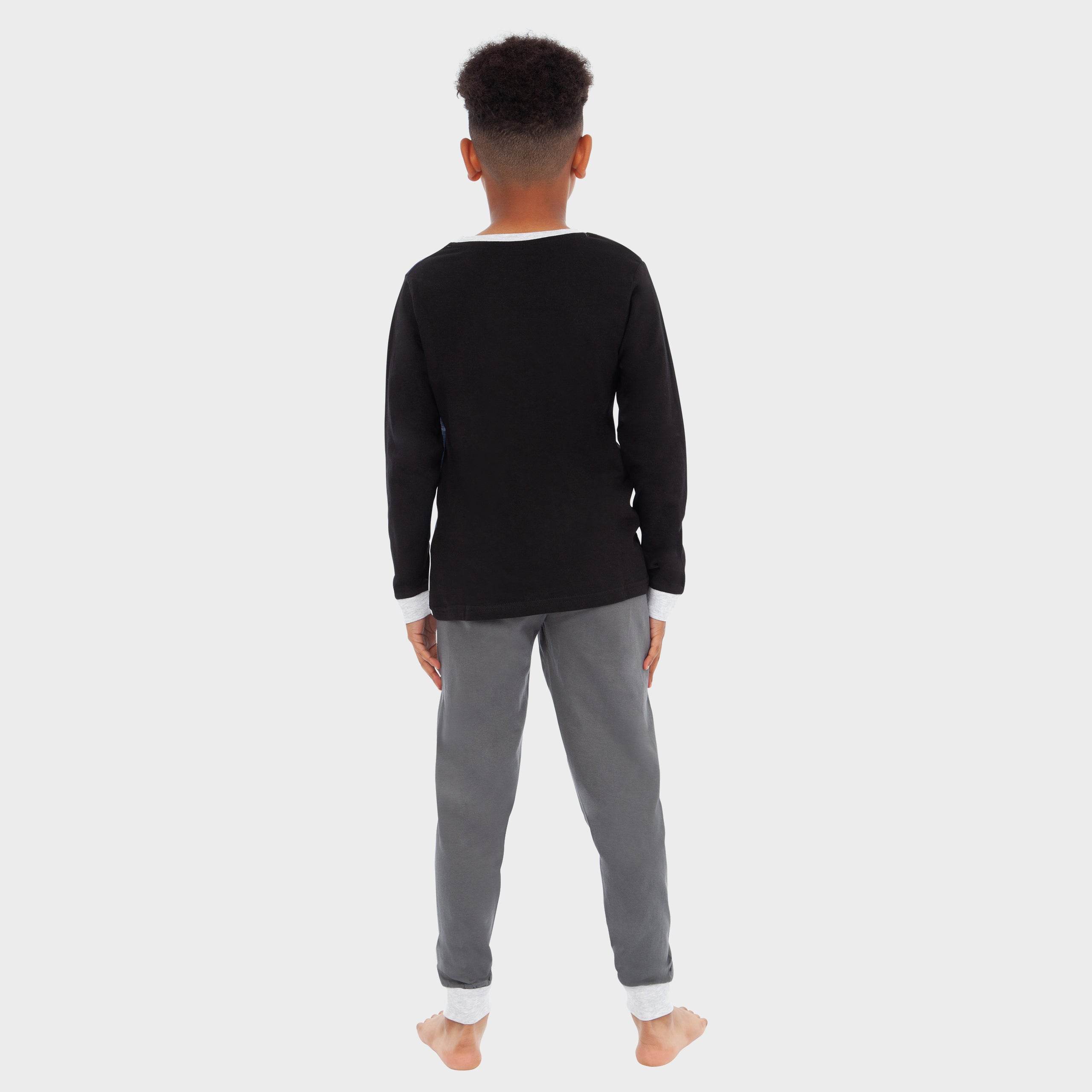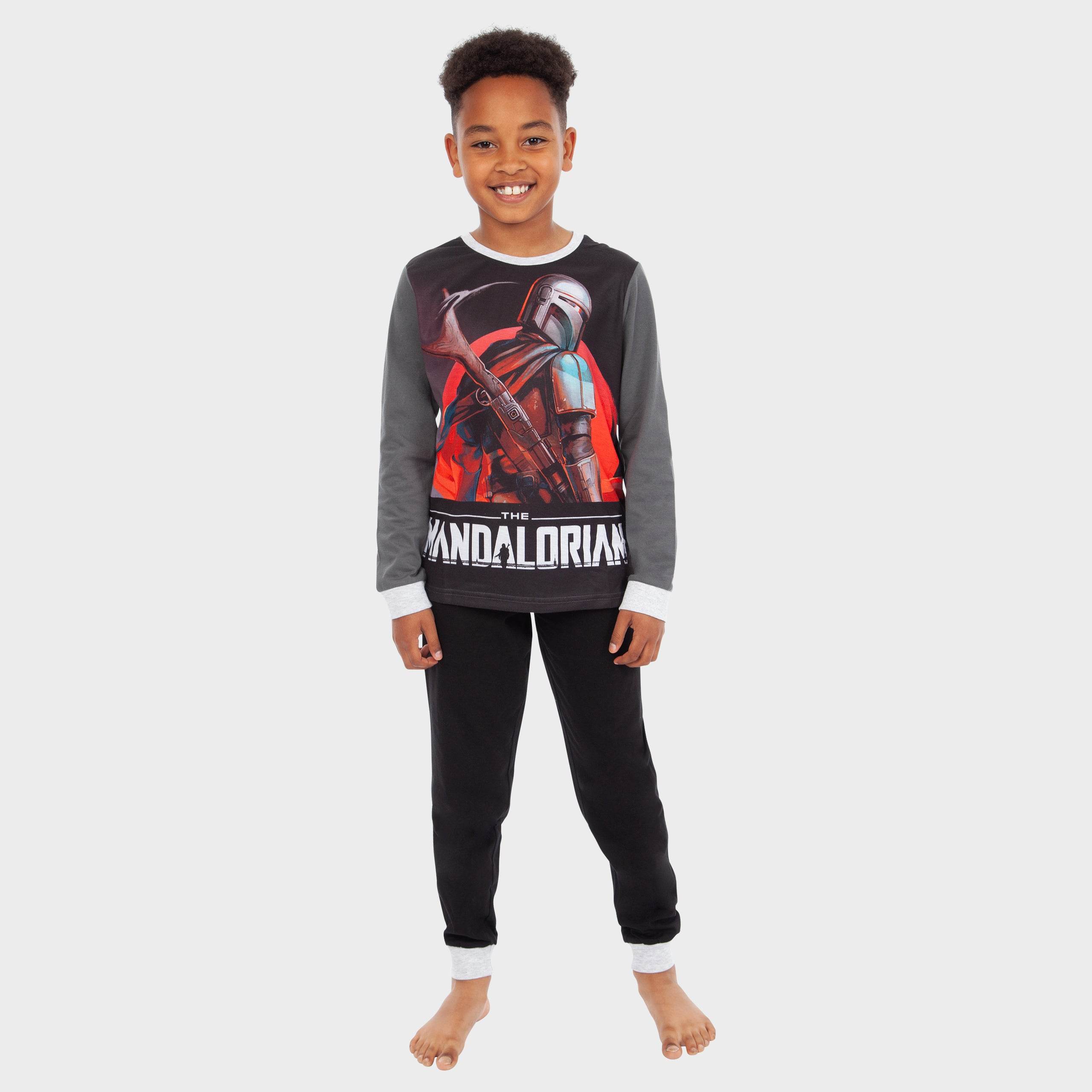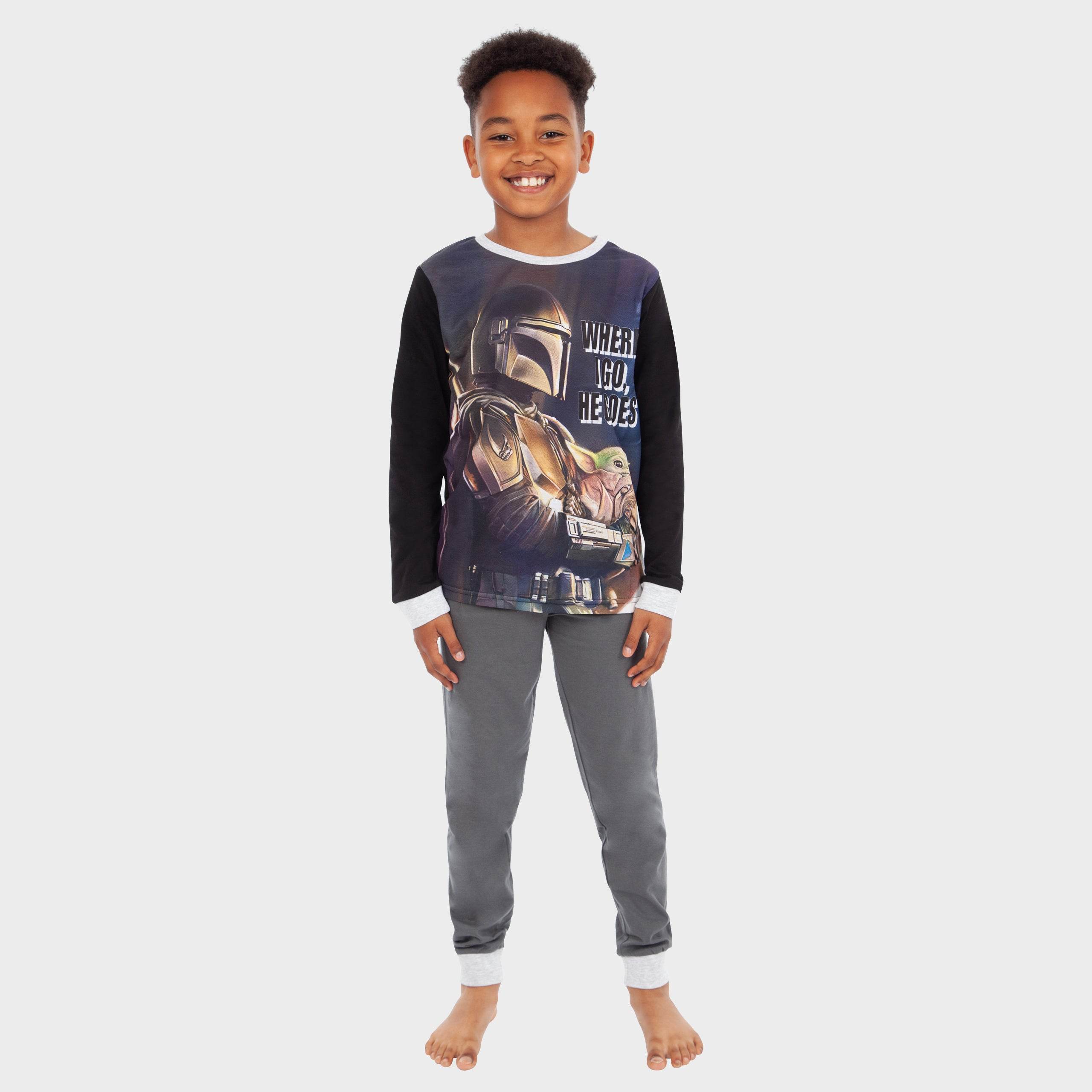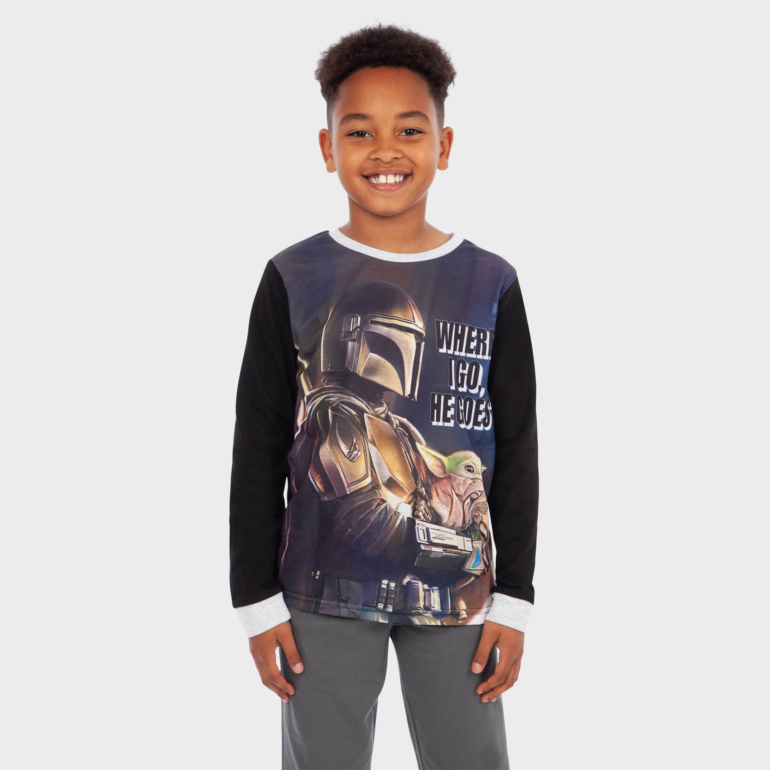 Send your little bounty hunter on epic dreamland adventures aboard the Razor Crest with this twin pack of The Mandalorian pyjamas! These long sleeve pjs include a grey set that showcases a graphic print of Mando and 'The Mandalorian' logo printed beneath, and a black set that features the Mandolorian holding Grogu with the slogan 'Where I go, he goes'. Both pyjama tops are complete with matching pj bottoms that have cosy ankle cuffs and a comfy elastic waistband. Essential nightwear for fans of Star Wars and The Mandalorian!