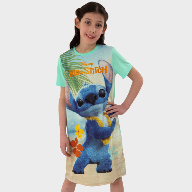 Child wearing a pink 'Stitch' themed nightshirt with Stitch and Angel cartoon characters on a blue background