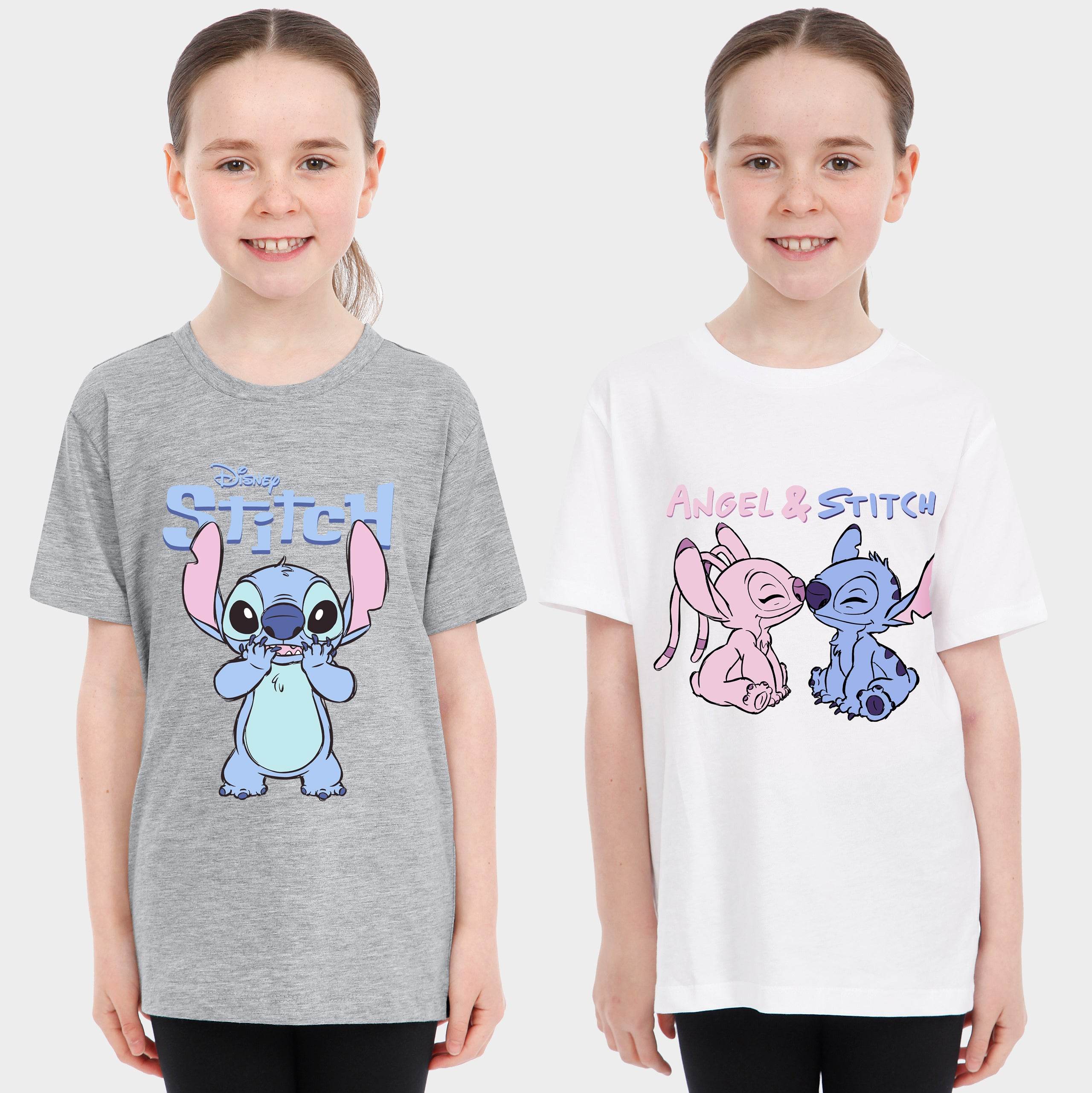 Perfect for the little Disney enthusiast in your life, this 2-pack of girls' Disney t-shirts offers adorable and playful designs. Each set includes a white t shirt with both Stitch and Angel playfully depicted alongside their names in cheerful colours, and a grey tshirt with a solo Stitch and a stylish logo. These tees are not only fun but also versatile, making them great for everyday wear or for showing off Disney love during playdates and casual outings.