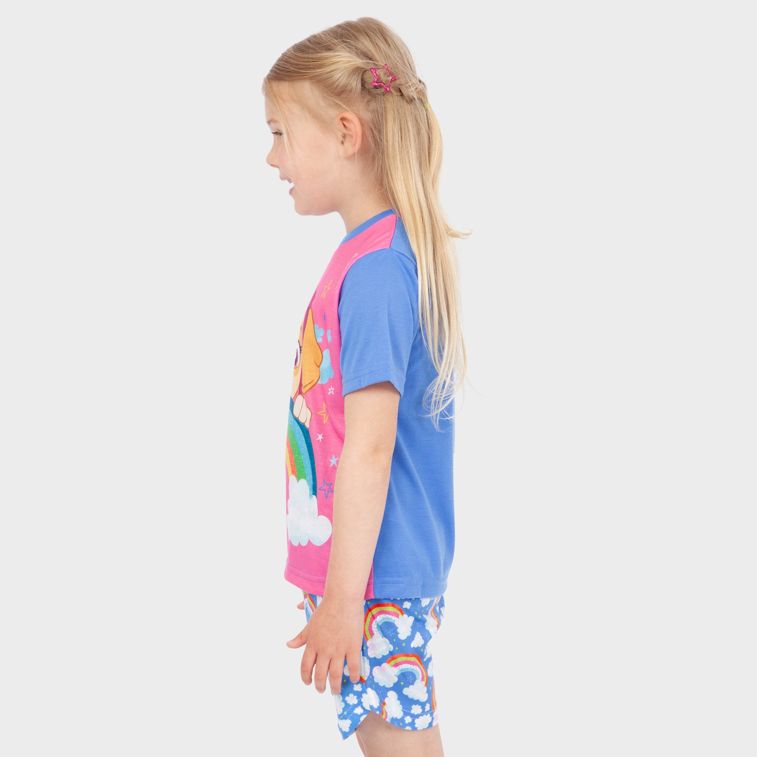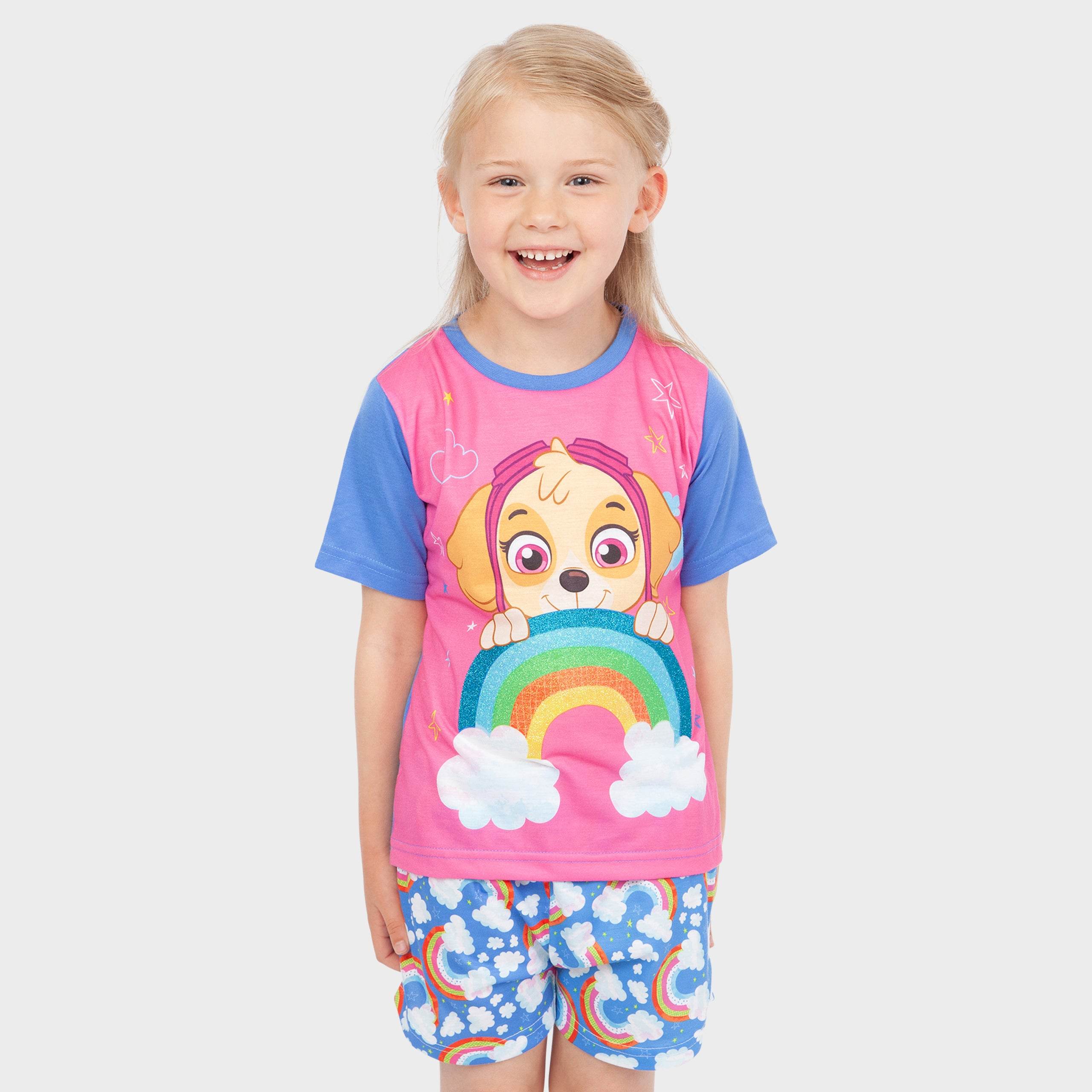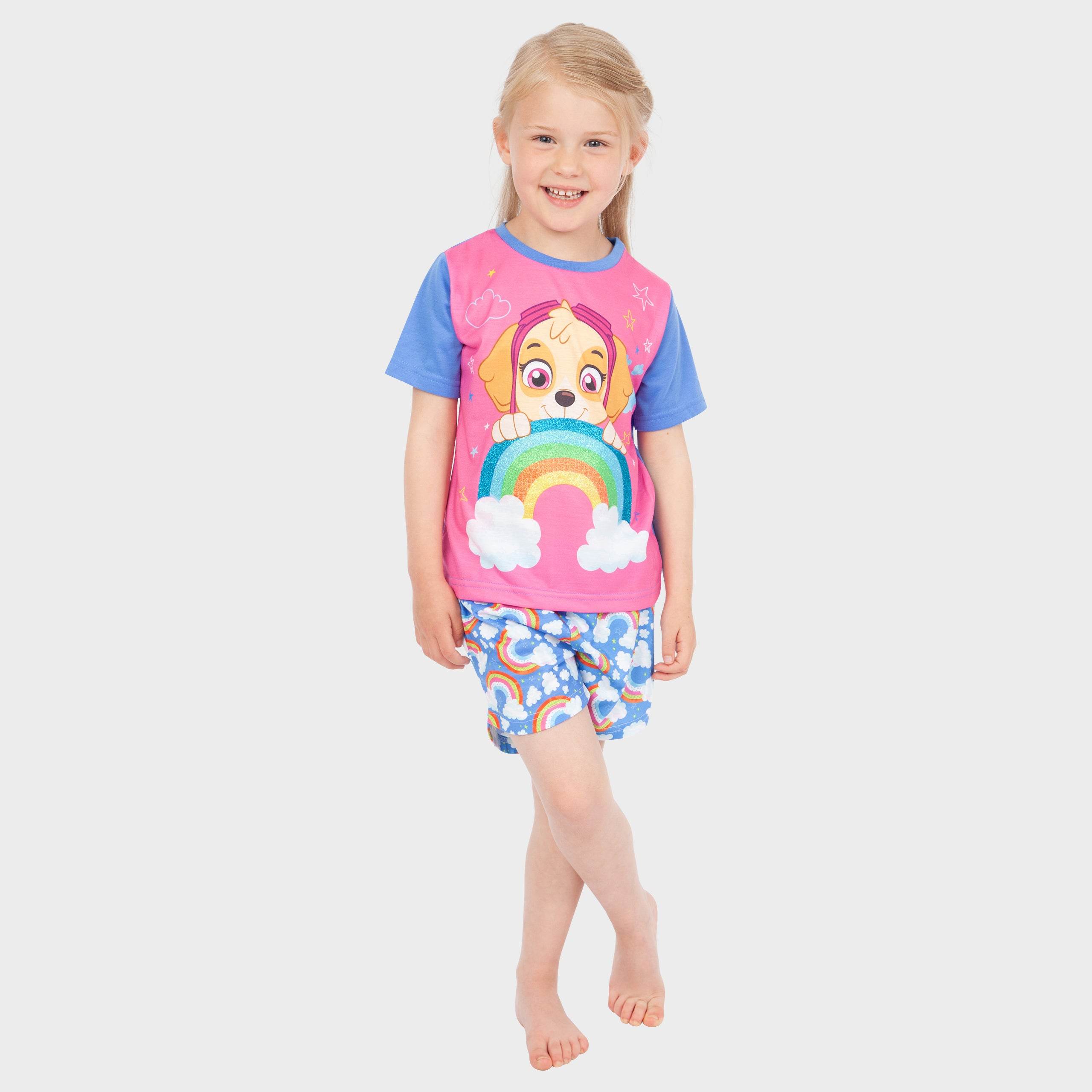 Your little pup's dreams will take to the sky in this bright and colourful PAW Patrol pyjama set! A bright pink top with contrasting blue sleeves showcases everyone's favourite Cockapoo, Skye, with stars, clouds, and a glittered rainbow. Teamed with sky blue shorts featuring an all-over rainbow motif, these short PJs are perfect for warmer nights and dreaming of sky-high adventures!