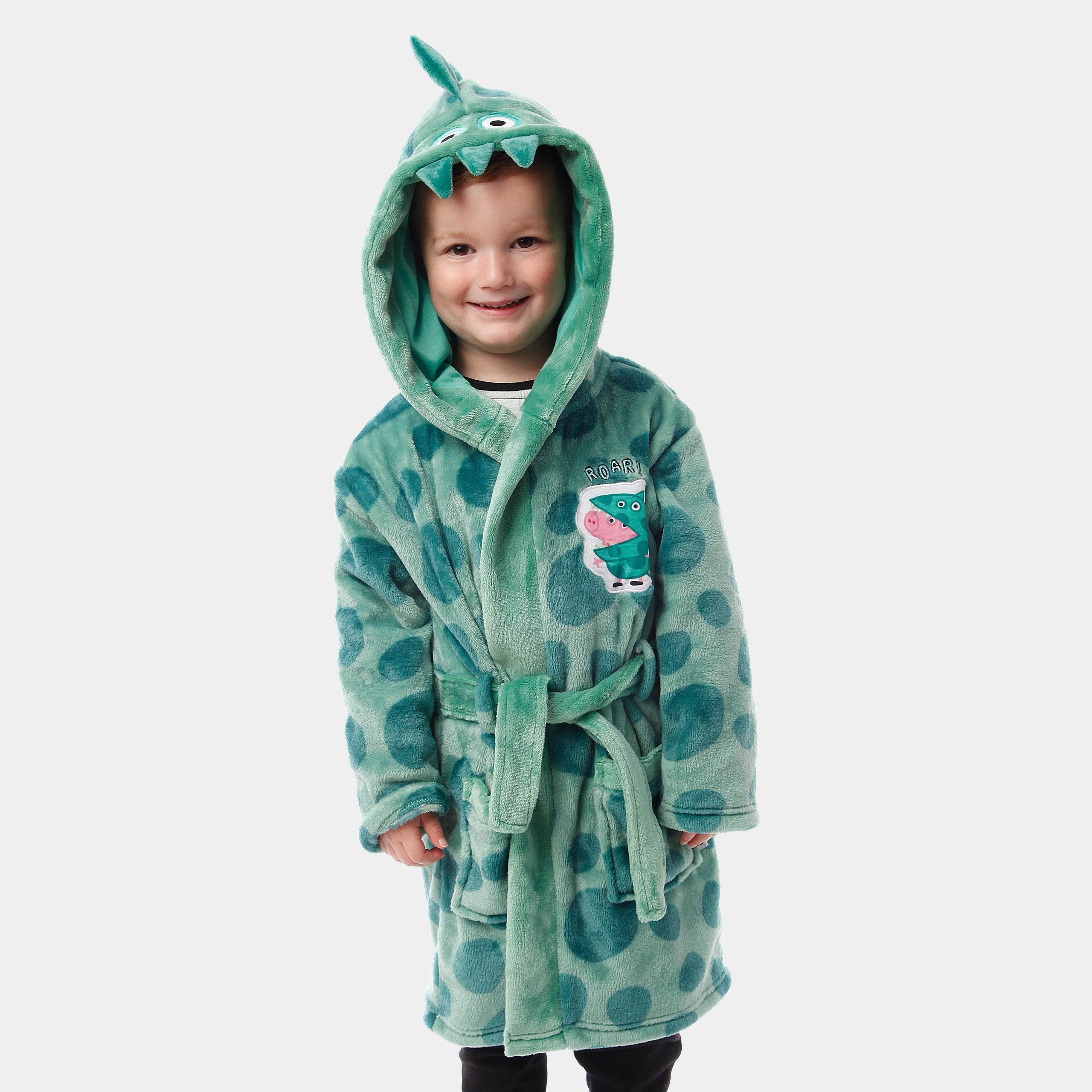 • Stay cosy and stylish: With an all-over print of green dinosaur scales on the Boys George Pig Dressing Gown!