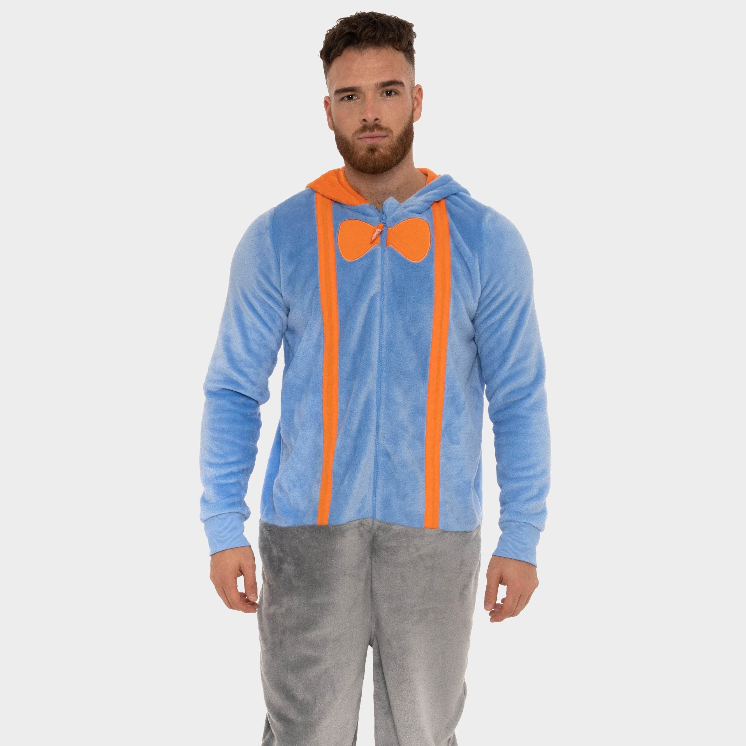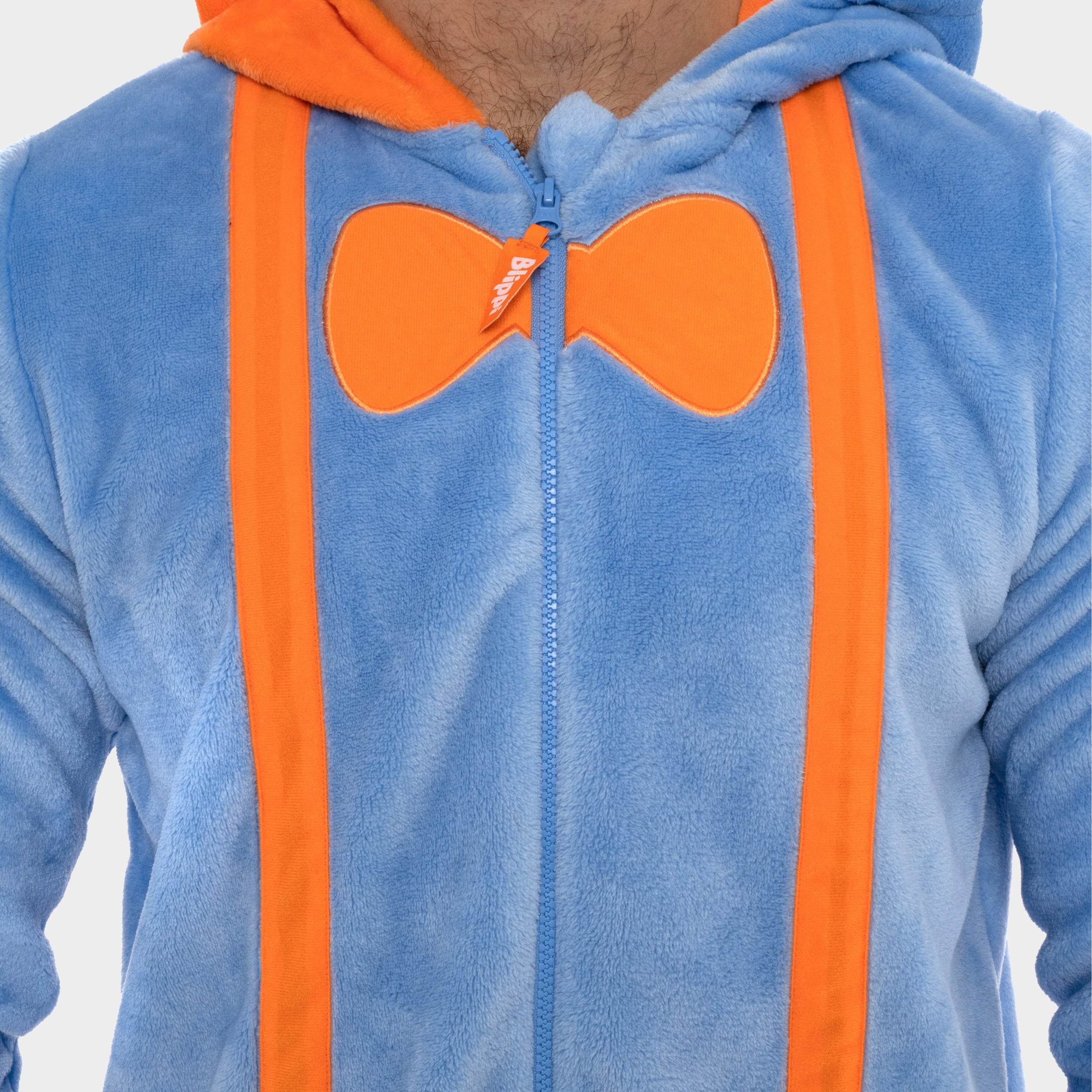 • Brave The Cold With Blippi!: Embrace your inner child with the men's Blippi onesie, sporting the iconic blue top, grey bottoms, and even a quirky print of his infamous orange bow tie and braces!