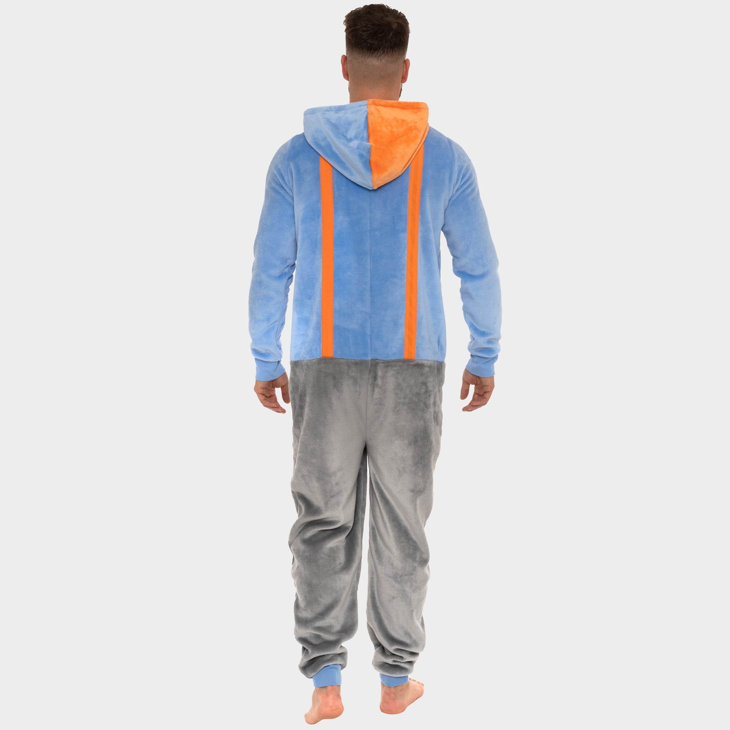 Snuggle into nostalgia with this playful men's Blippi onesie! Designed to mirror the beloved character's outfit, it features a bright blue upper half with long cuffed sleeves and grey trouser-like lower half,also featuring a print ofBlippi's distinctive orange bow tie, braces, and his official glasses logo on the bottom left leg. The hood adds a whimsical touch, split into Blippi's orange and blue hues. It's the perfect loungewear for any parent whose little one can't get enough of Blippi's educational adventures!