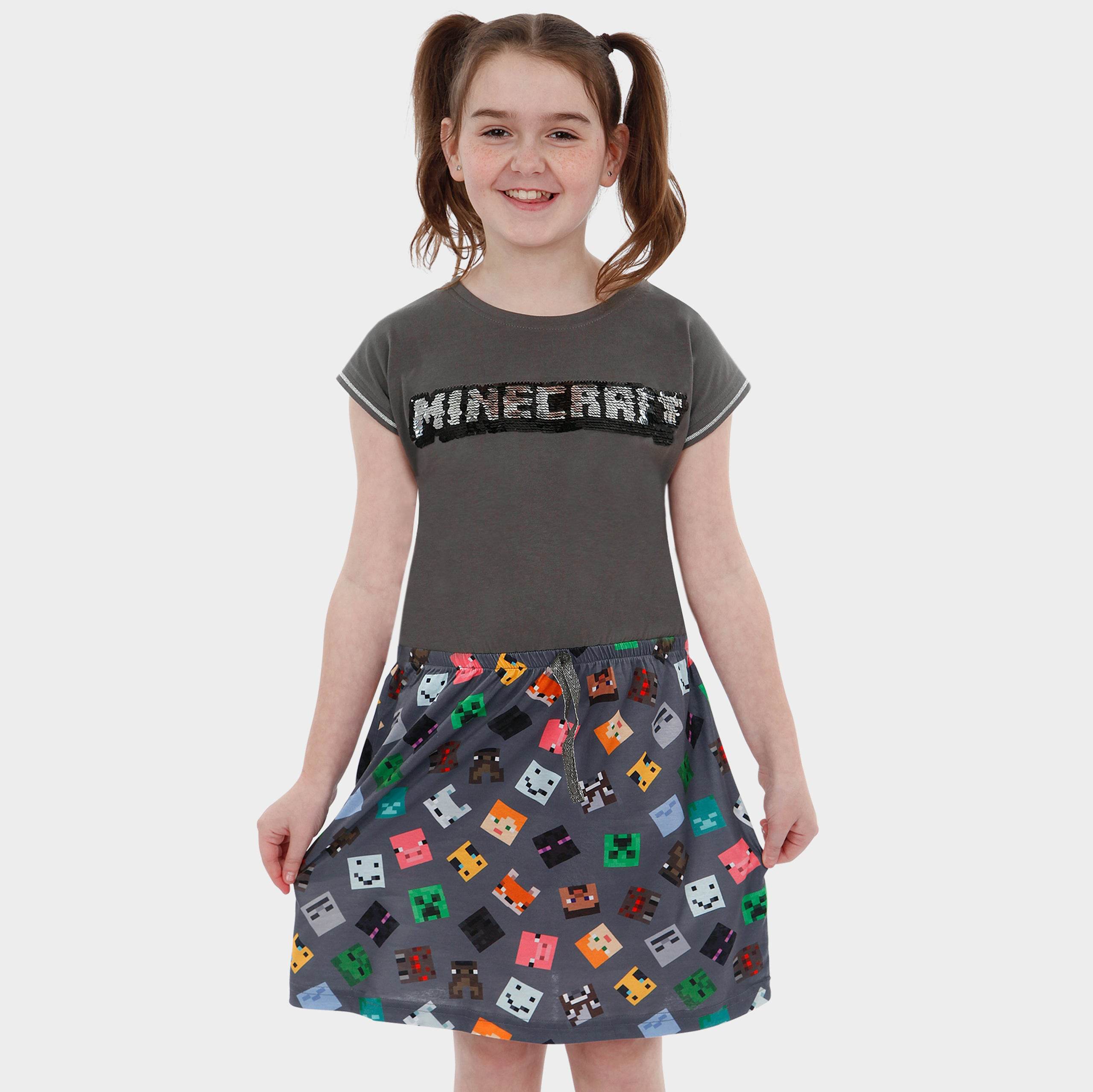 Grab your pickaxe! Perfect for the most serious block builder, your Minecraft maniac will surely 'dig' this awesome Minecraft dress! This gorgeous grey dress features the iconic Minecraft logo in a reversible sequin design that transforms into an inverse version of the logo! Metallic silver trims and drawstring add to the glitz and glamour of this cool dress and is completed by the skirt with an all over motif of all their favourite characters.