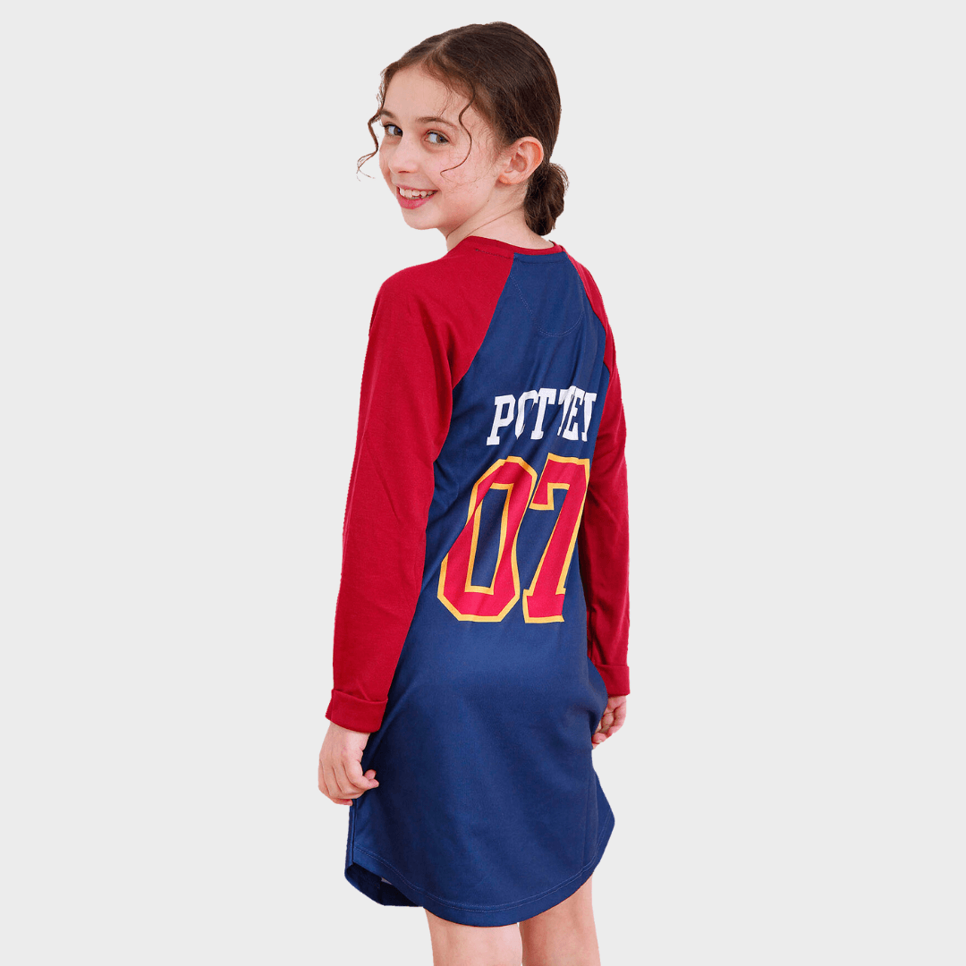 This wizards nightdress is ideal for a night in the dormitories at Hogwarts. The navy and burgundy colour complements the house emblem of Gryffindor printed on the front. The back of the pyjama is styled as a sports jersey with Harry Potter's Quidditch number 7 printed in bold writing. The long raglan sleeves are finished with a rolled cuff detail to give somewhere to tuck your wand to protect yourself from the Dark Arts during night time.