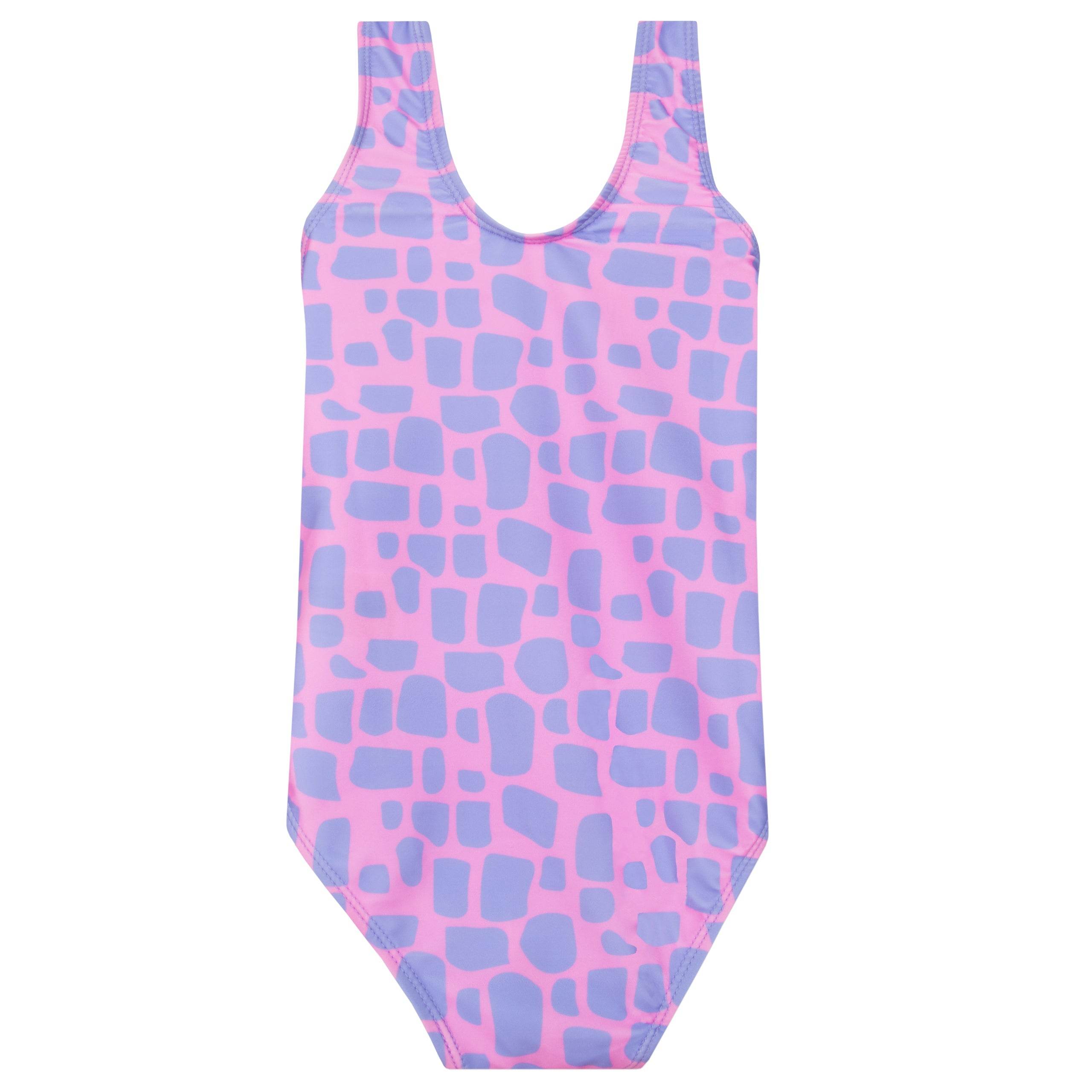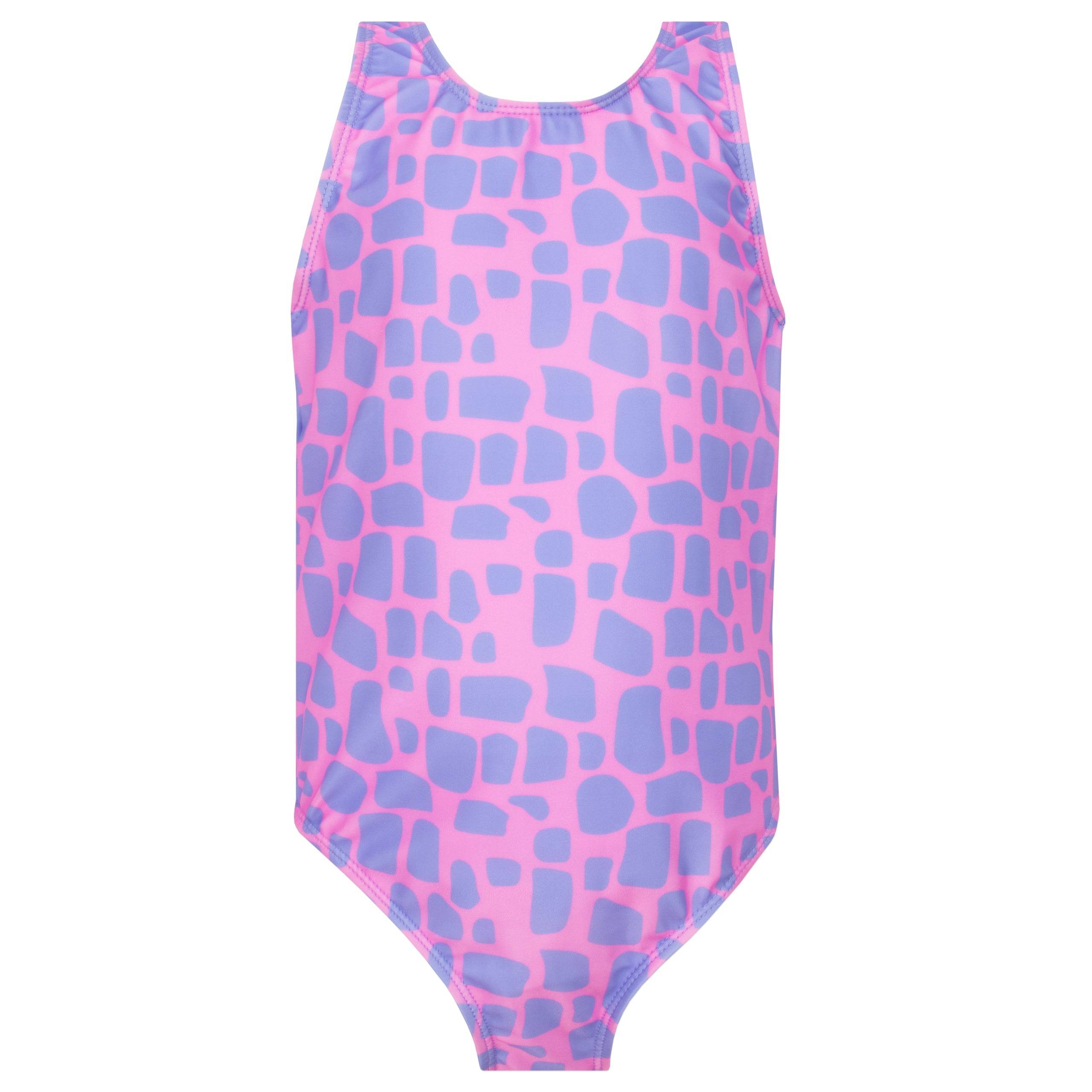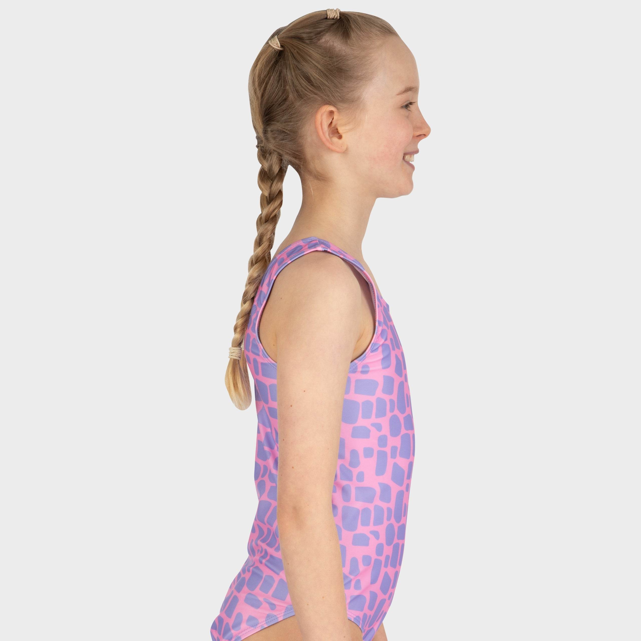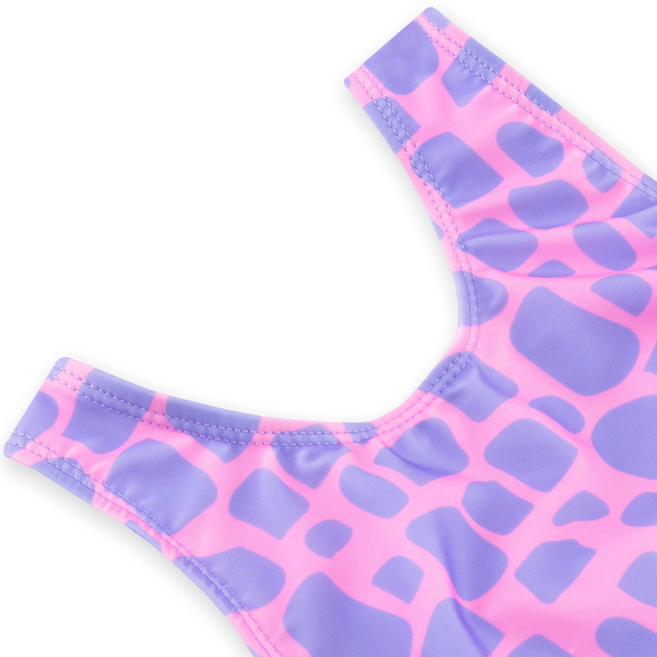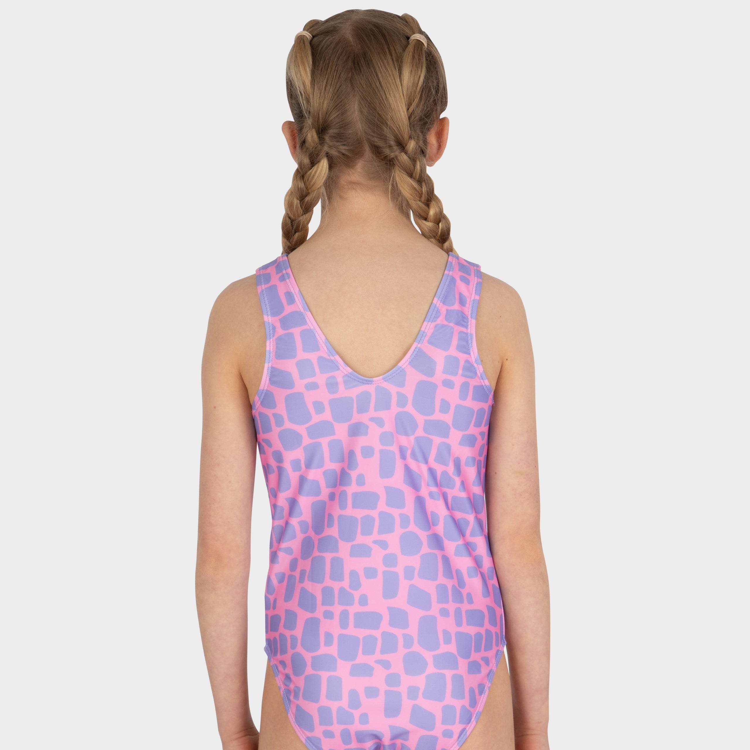 This girls' one-piece swimming costume brings a splash of style to any summer adventure. Its vibrant pink colour adorned with cheerful purple animal print spots is sure to make a statement. Designed for comfort and durability, this girls bathing suit is simply perfect for energetic days in the sun. Dive into a season of fun and fashion with this standout swimsuit!