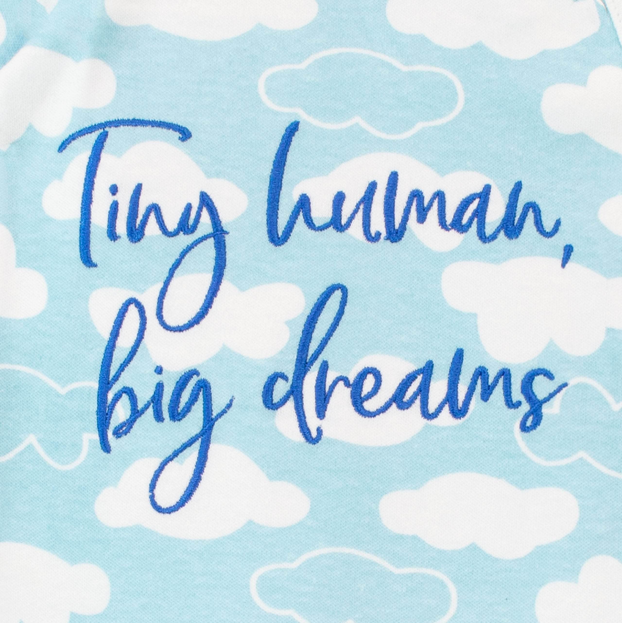 Put your little dreamer to bed in this adorable all-in-one and they'll float off to dreamland on fluffy white clouds! Designed by Harry Bear, this baby blue sleepsuit features an all-over pattern of white clouds and the slogan 'Tiny human, big dreams' embroidered in blue, and has a popper fastening for easy dressing. No matter how tiny your little one seems, in this cute onesie they'll have the biggest of dreams!