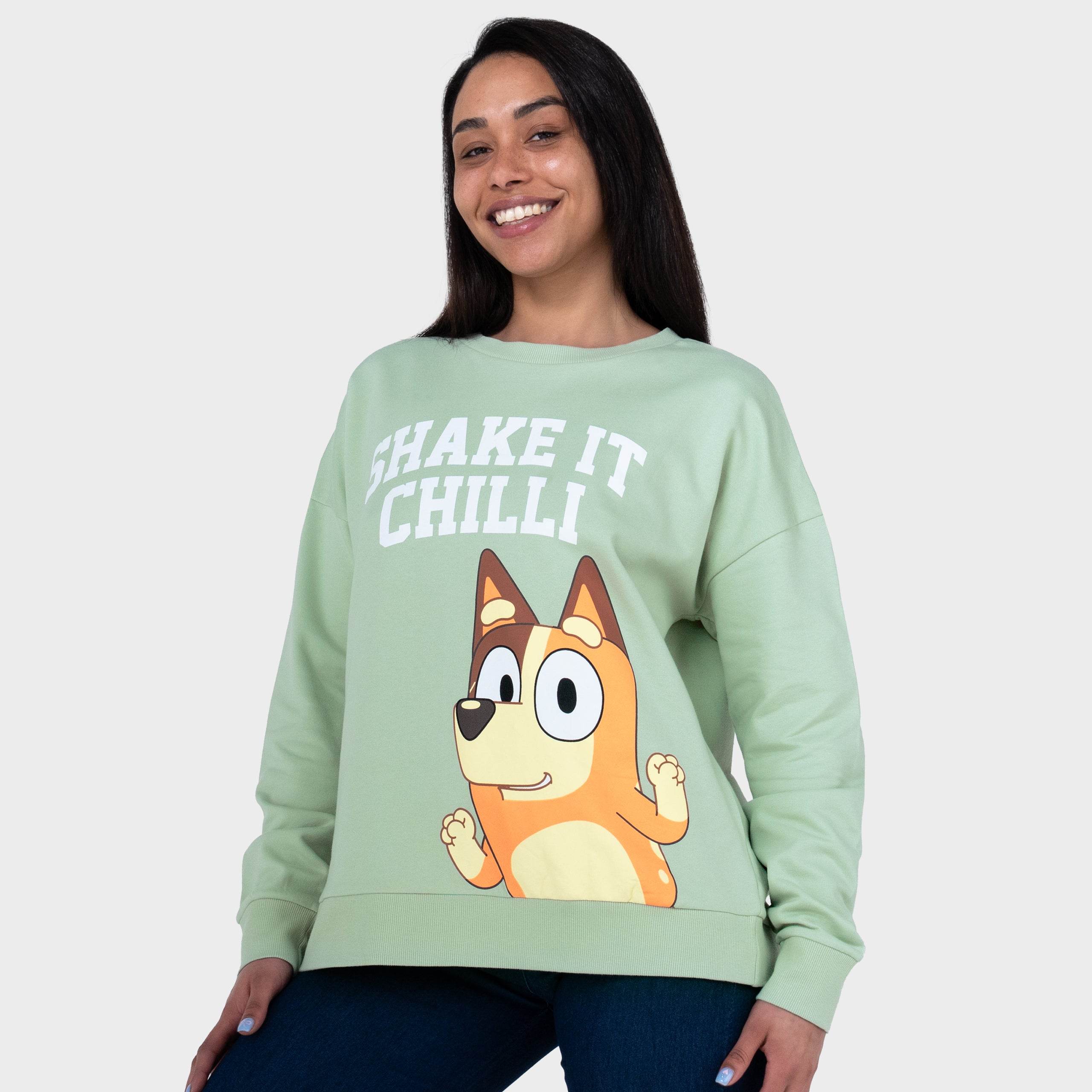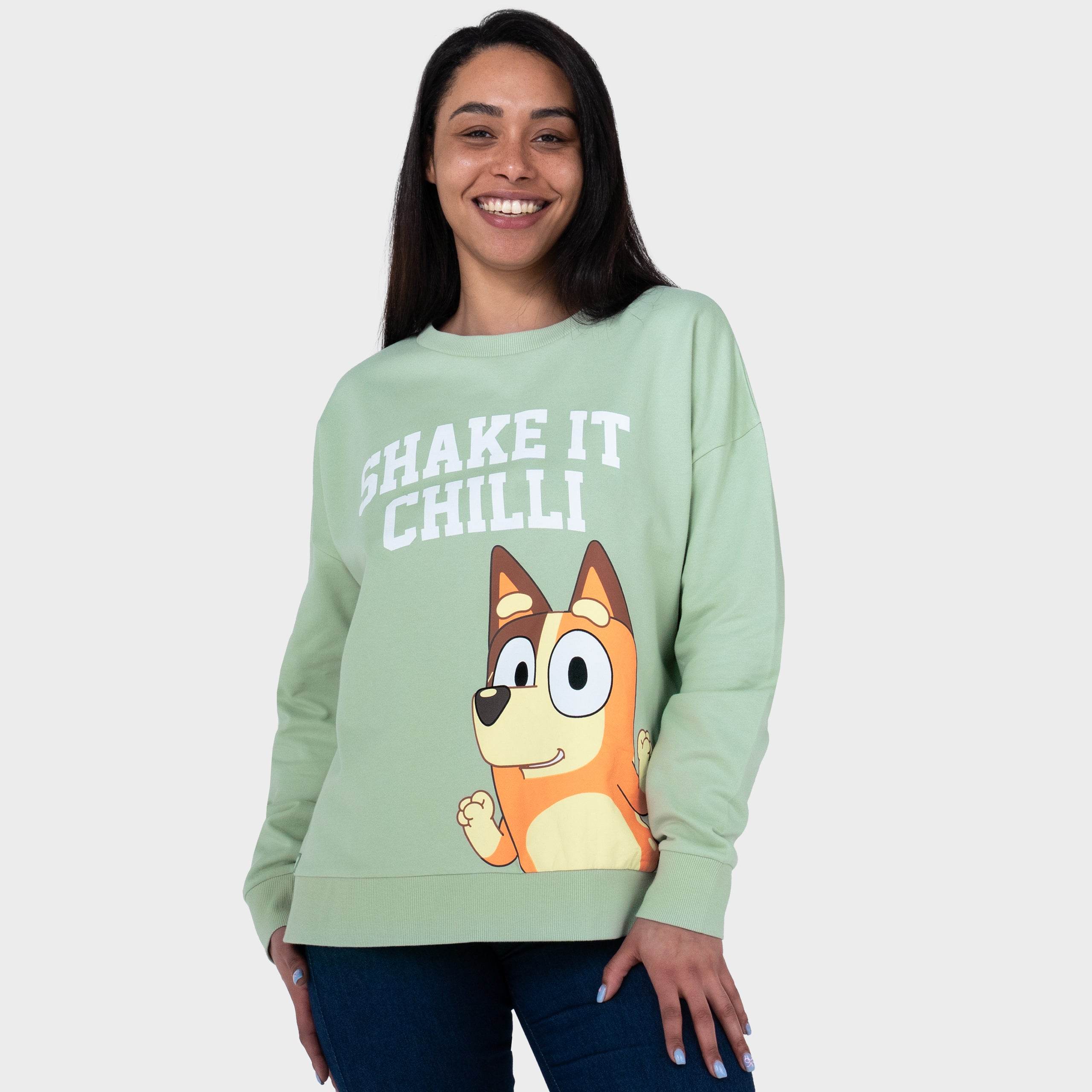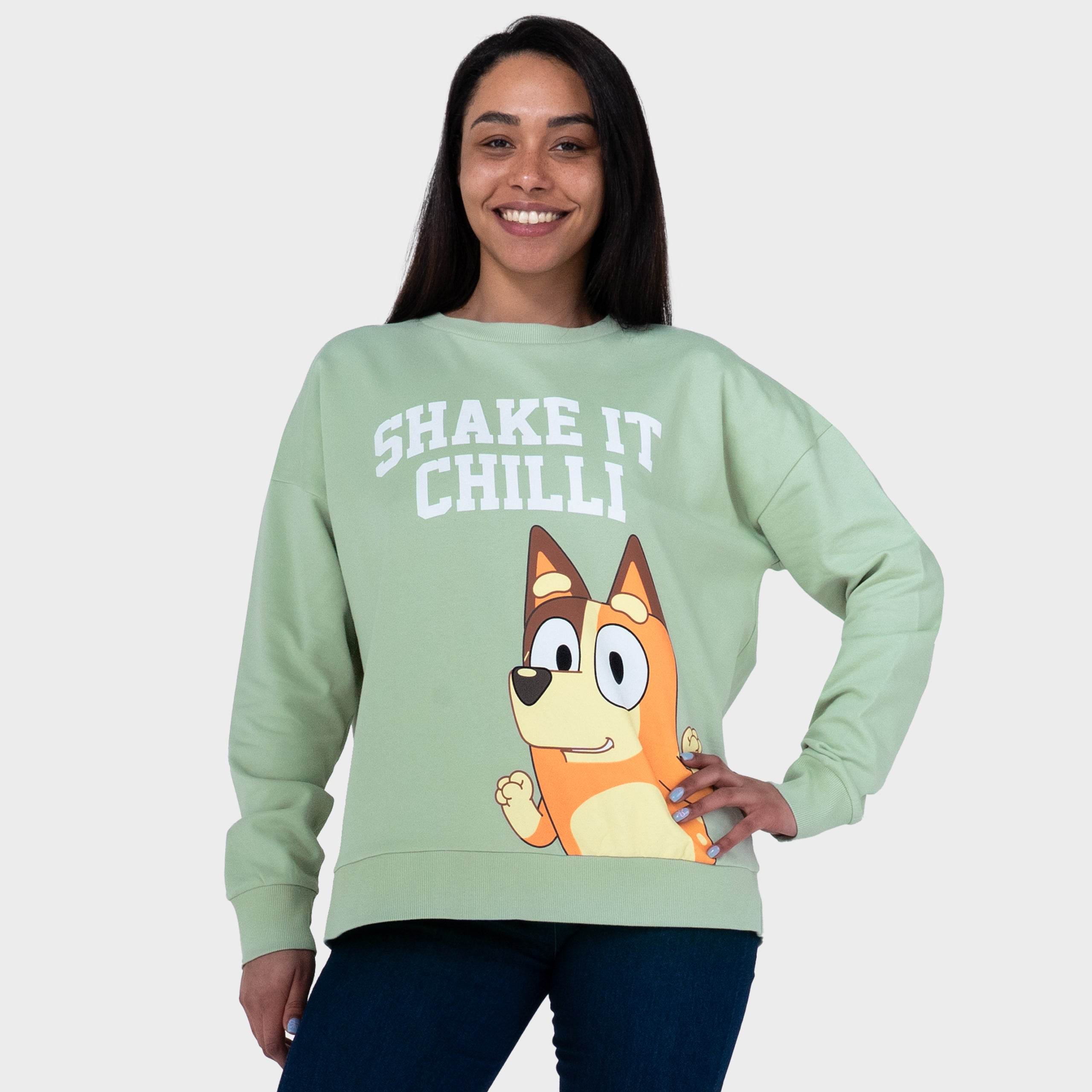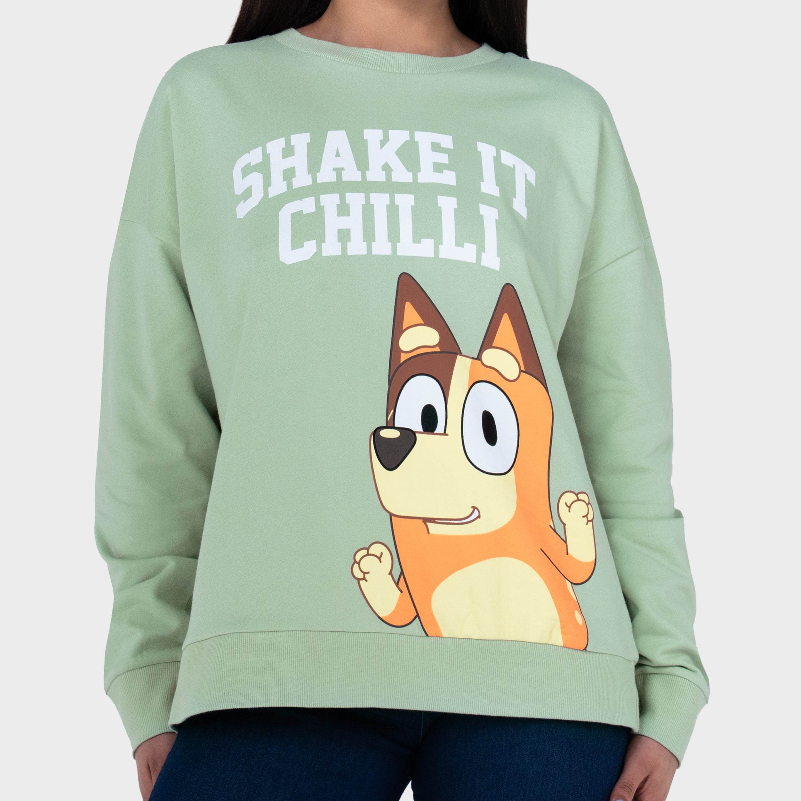 Turn up the fun with this playful Bluey sweatshirt starring Chilli in full dance mode! The “Shake it Chilli” print adds instant cheer, while the light green colour brings fresh vibes. With comfy cotton and flexible fit, it's perfect for chilled-out days or spontaneous dance breaks. It’s officially licensed, and officially fun!
