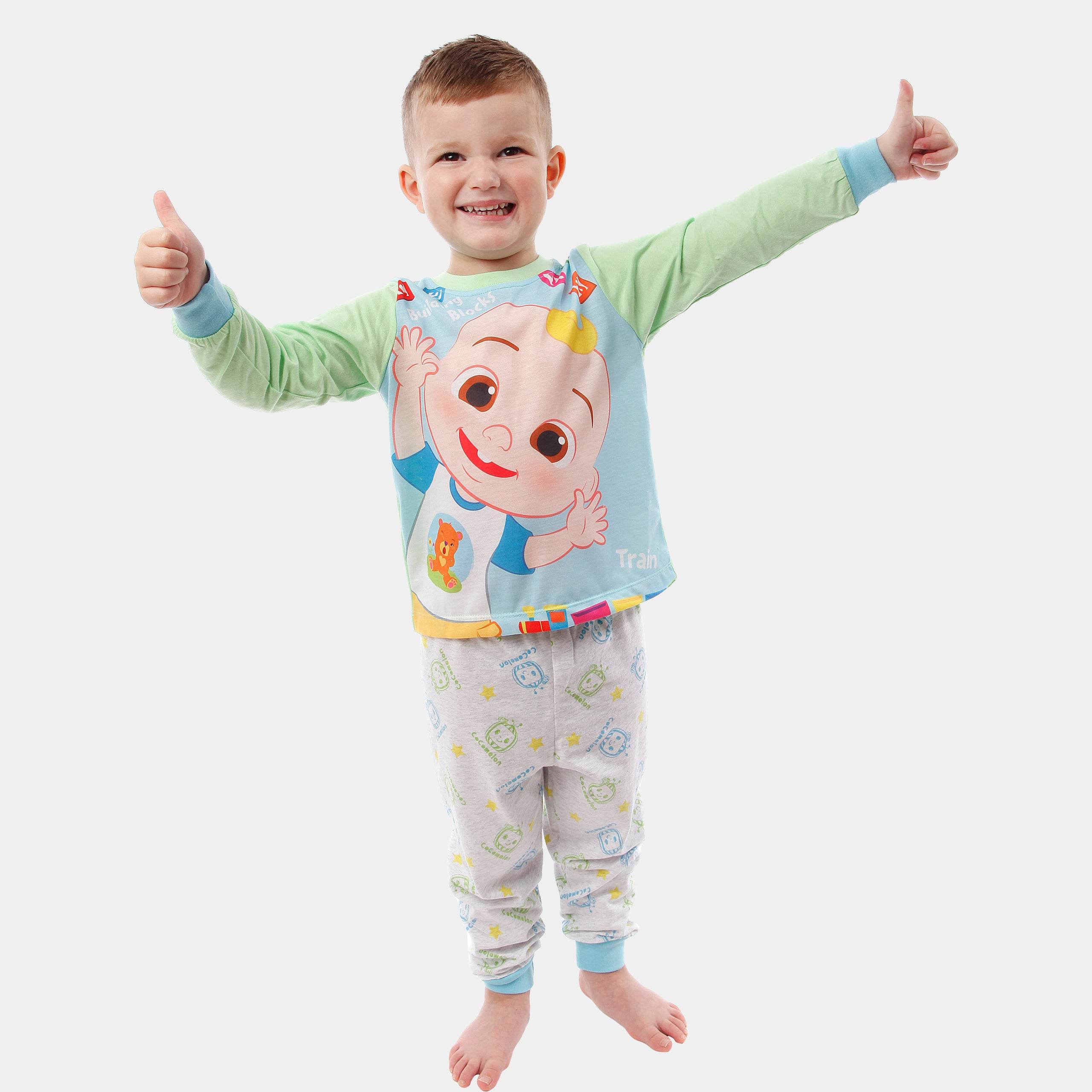 • Colourful & Cuddly: Dive into bedtime with vibrant sky-blue, fresh green, and playful grey tones, featuring your child's favourite CoComelon character, Jay Jay, surrounded by his building blocks and sprinkled with fun, fine-line prints of his face on the PJ bottoms!