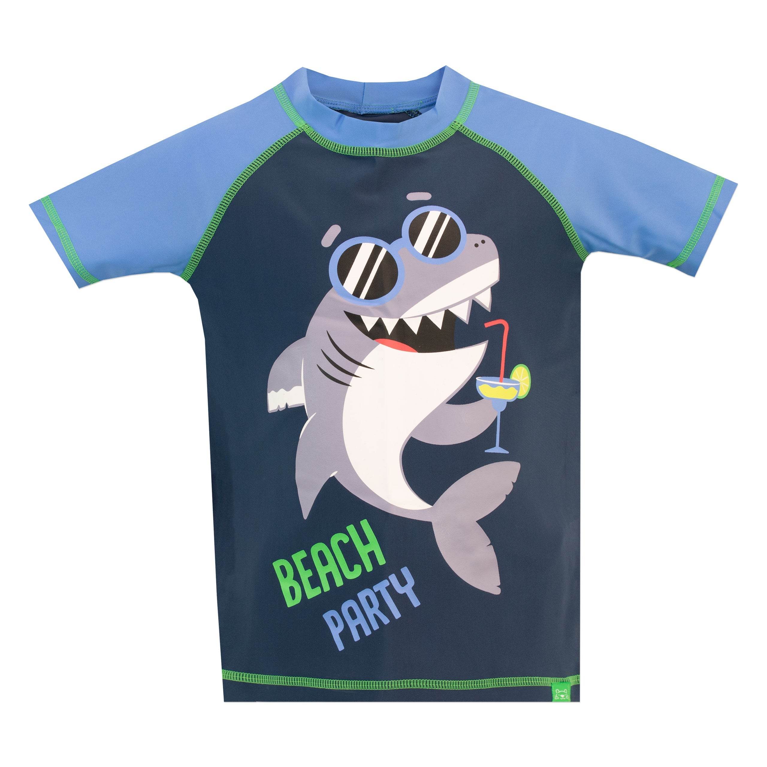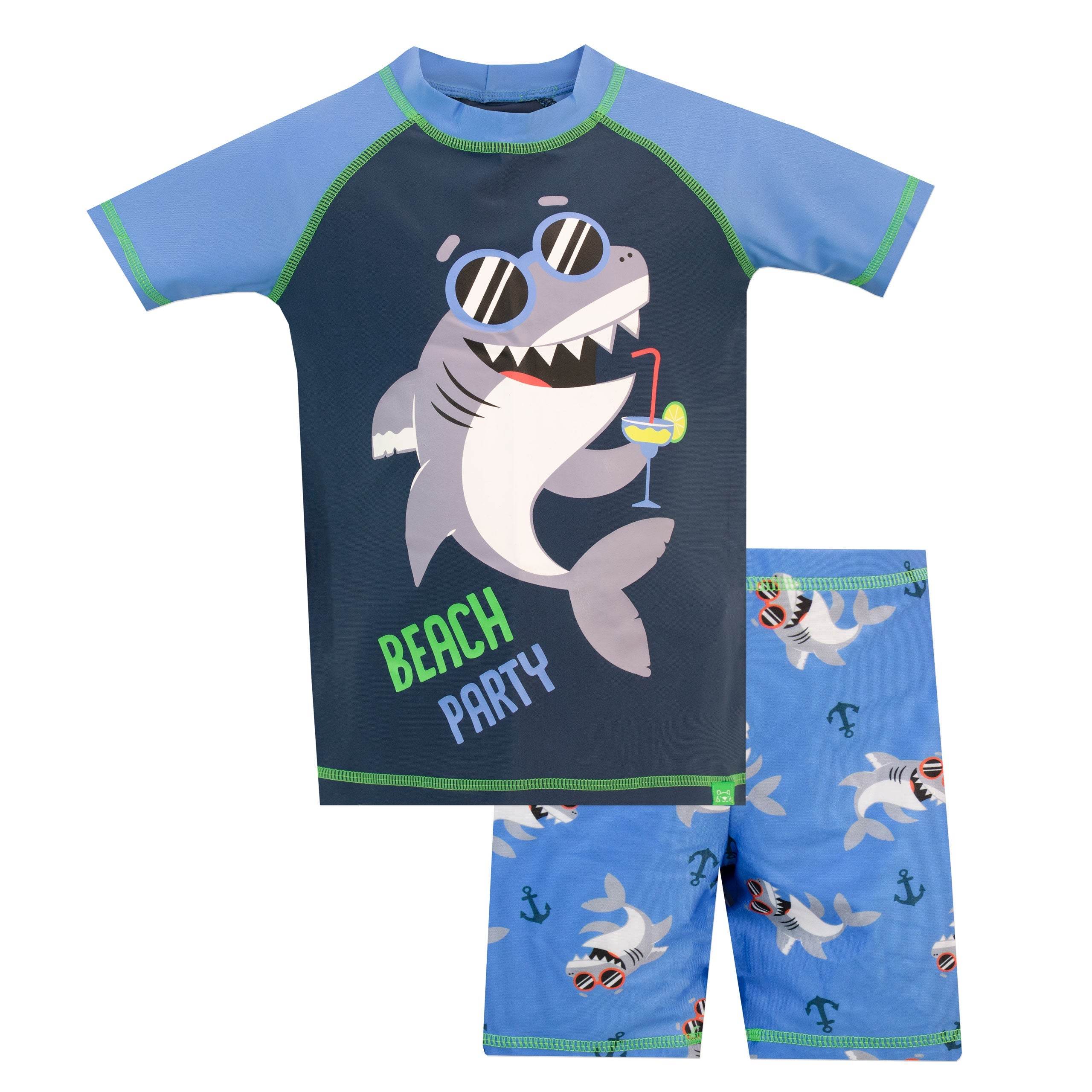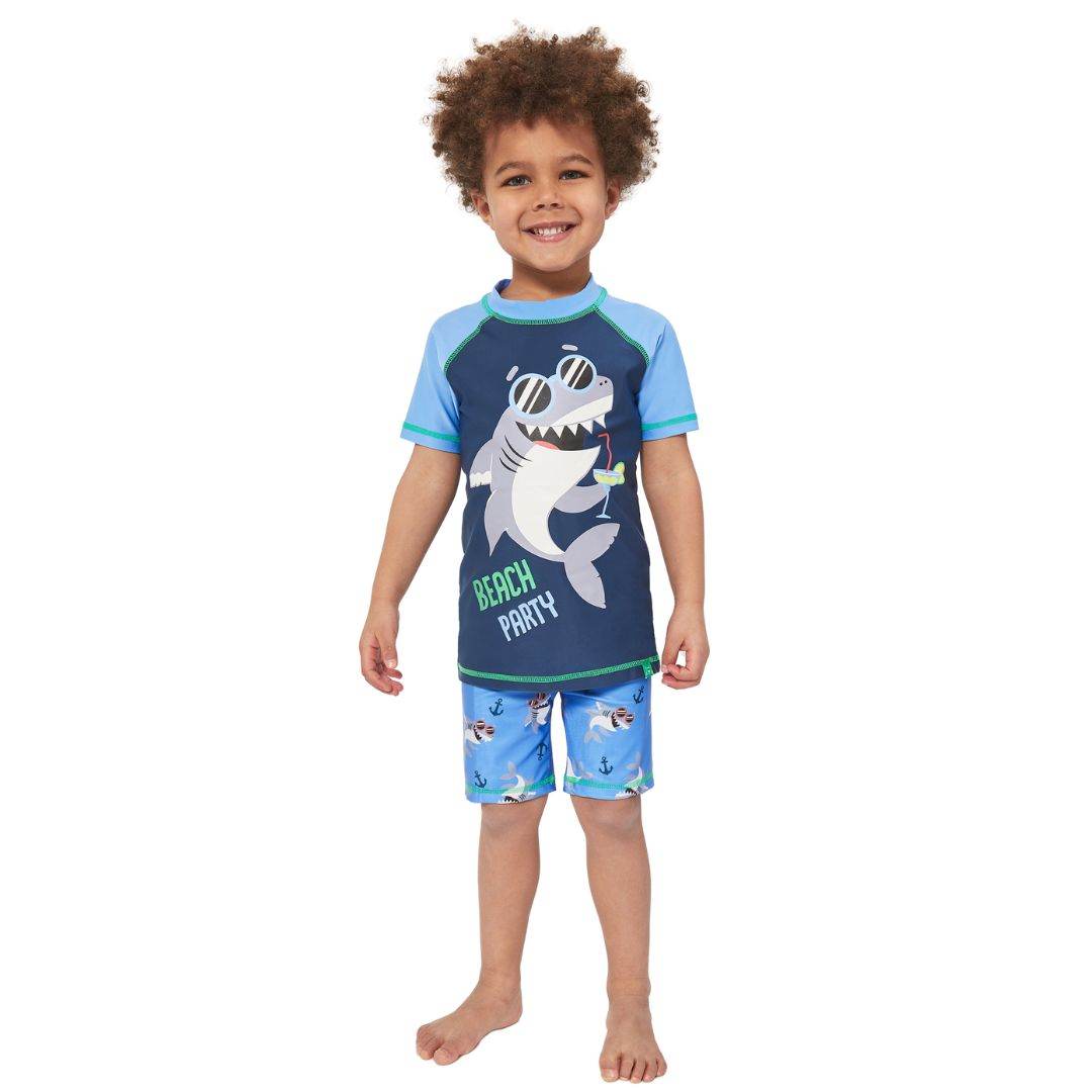 Sink your teeth into this fin-tastic two-piece swim set! Designed by Harry Bear this jaw dropping swimming costume features a cool shark with sunglasses drinking with the slogan 'Beach Party'. Paired with matching blue shirts that have an all over shark and anchor print. Perfect for seaside adventures!